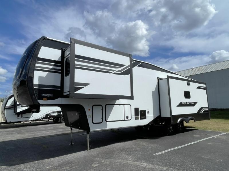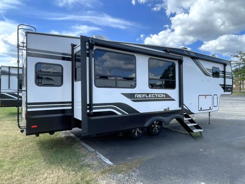 Built for the road, the Reflection features laminated aluminum walls, a gel coat fiberglass exterior, Goodyear Endurance tires, and premium construction to ensure a smooth, reliable ride. With dual opposing slides, oversized panoramic windows, and thoughtful design touches, this fifth wheel maximizes space and light while keeping the focus on your camping lifestyle.