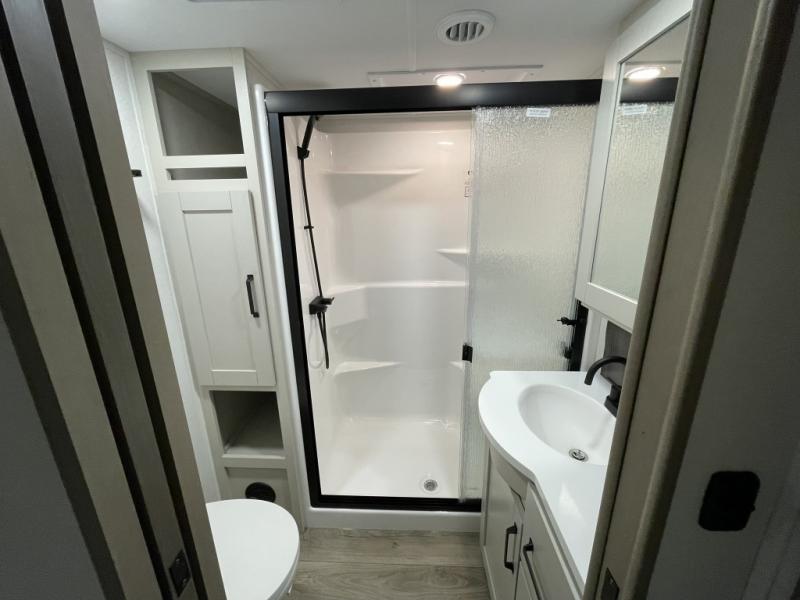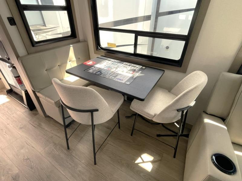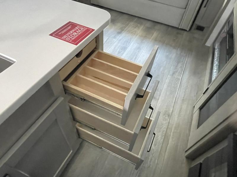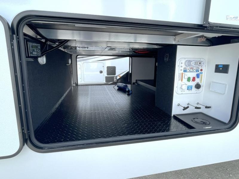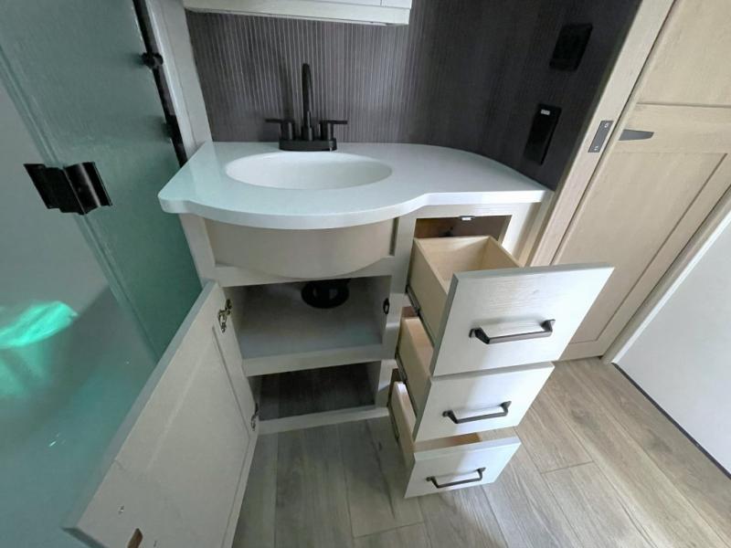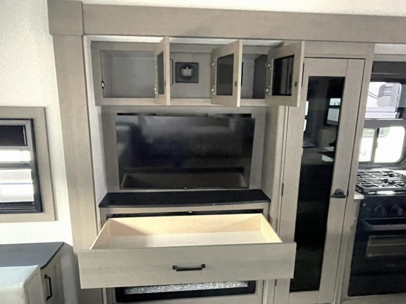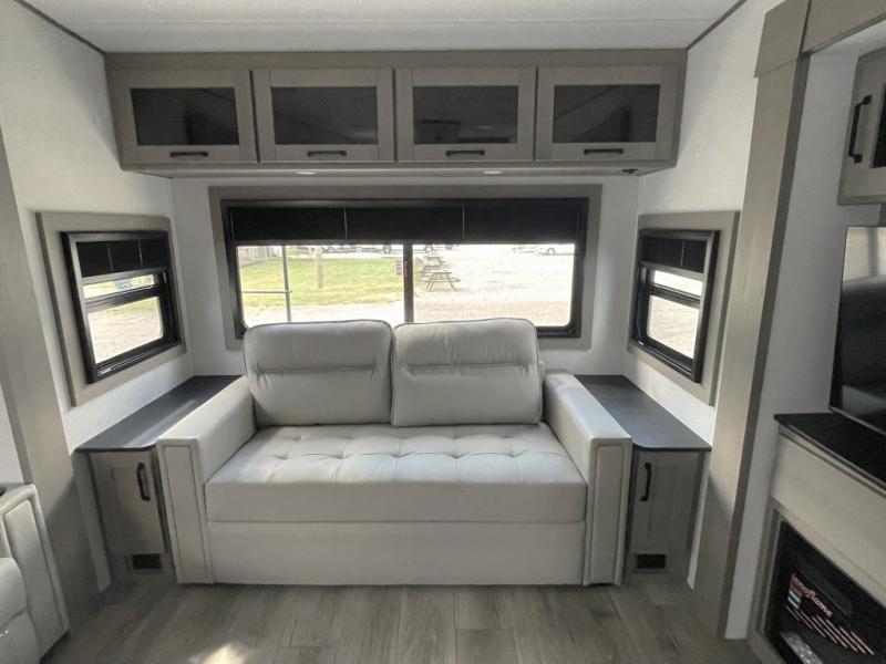 Step inside and feel the difference. The tri-fold sofa doubles as a guest bed, while theater seating offers premium comfort for movie nights. The chef-inspired kitchen keeps everything within reach, from the large pantry to the island prep space, making meal prep a breeze. The full bathroom and private front bedroom provide comfort and privacy for extended trips, and washer/dryer prep adds convenience for longer adventures.