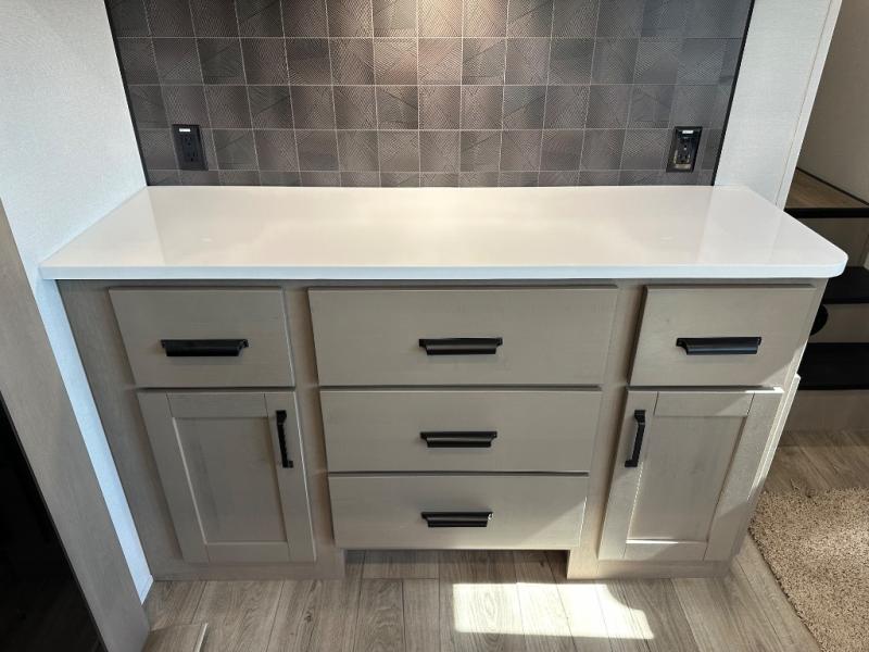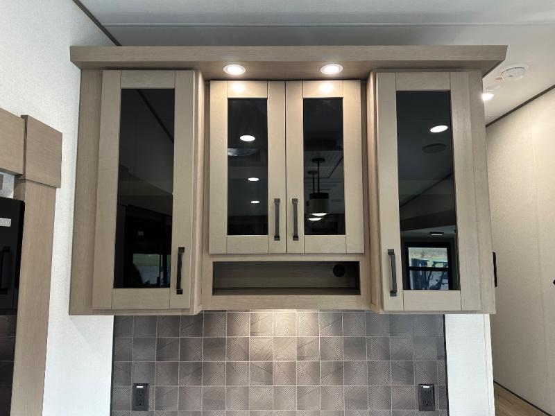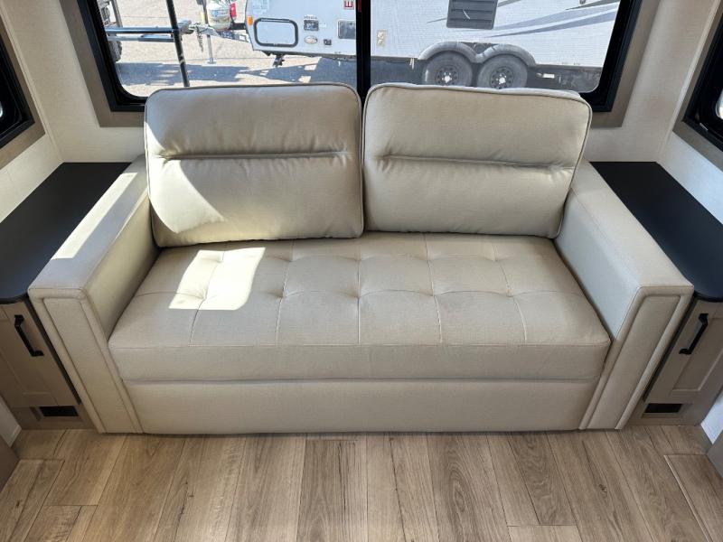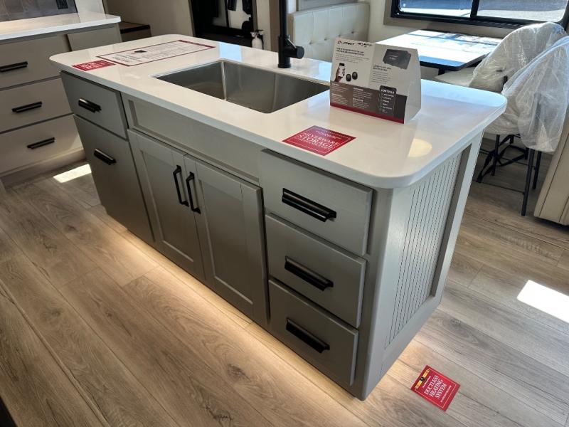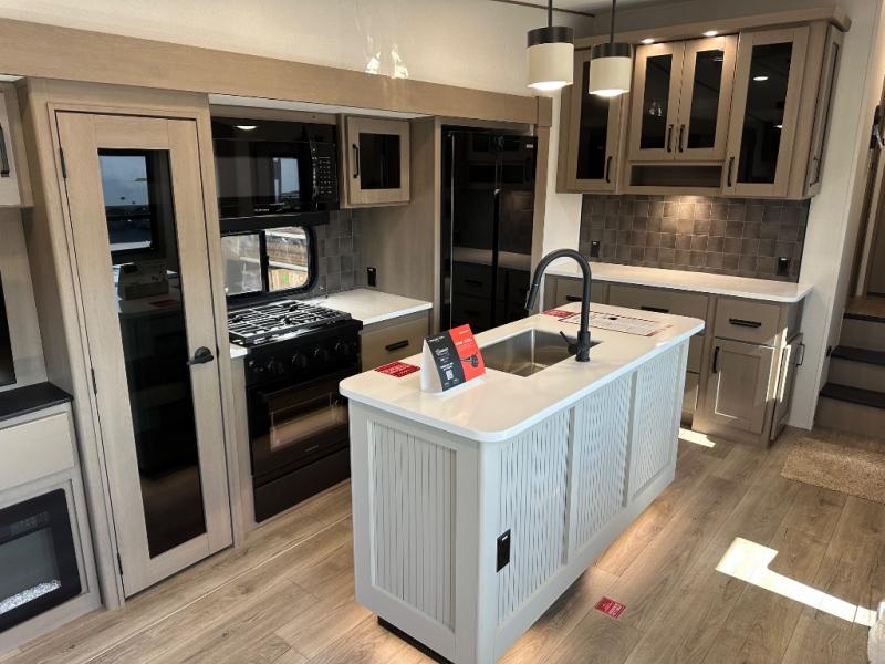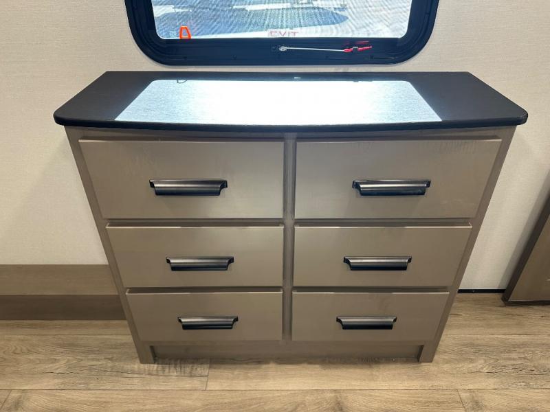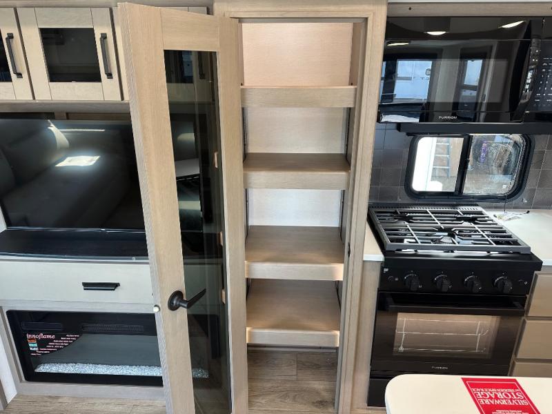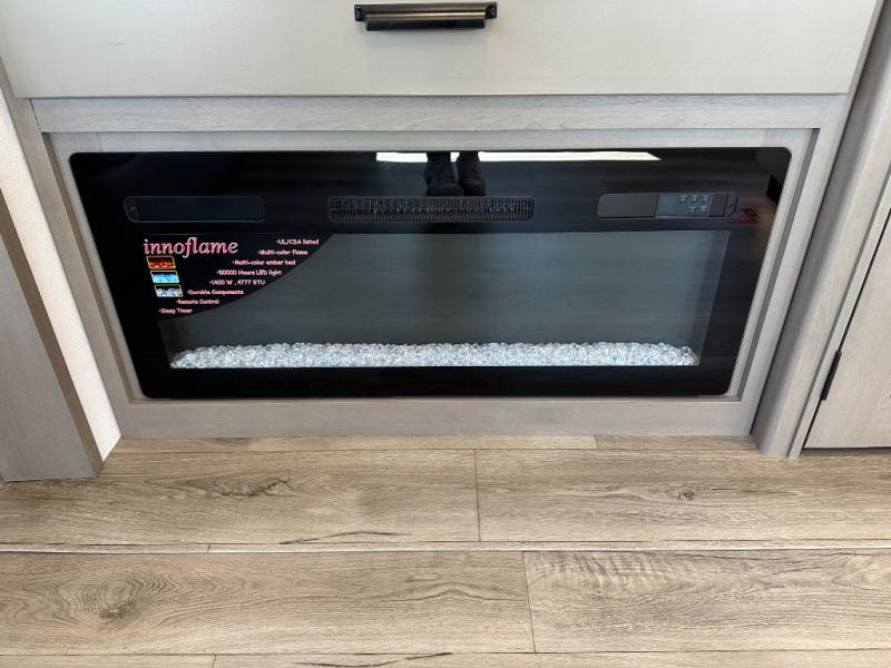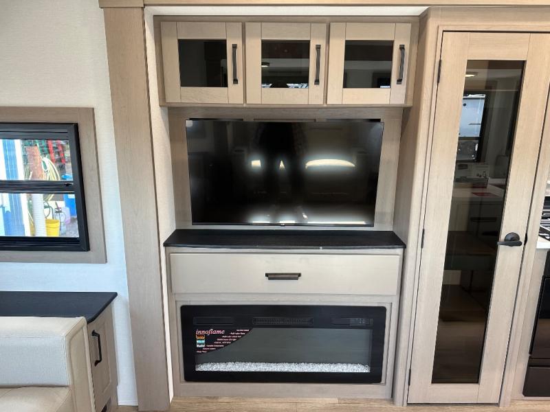 You can enjoy a spacious rear living area in this RV with dual opposing slides offering you entertainment, kitchen amenities, seating and windows for great views! The rear tri-fold sofa also converts into extra sleeping space for an extra guest or two, just like the booth dinette does. Yet you might like to add the swivel dinette option. There are theater seats to enjoy while you place your drinks in the cupholders and watch the entertainment center with a 40" LED HDTV and fireplace. The pantry is big enough to store your favorite snacks, and the kitchen island will make meal prepping easier, plus there is a 16 cu. ft. refrigerator to store any leftovers. The full bathroom has a 30" x 48" fiberglass shower and a linen closet to store your towels. The front private bedroom has a comfortable queen bed slide that can be switched out for the optional king bed, a dresser with overhead cabinets, and a full wall wardrobe that is prepped to add the optional washer and dryer so that you can extend your camping trip with clean clothes!