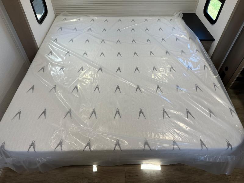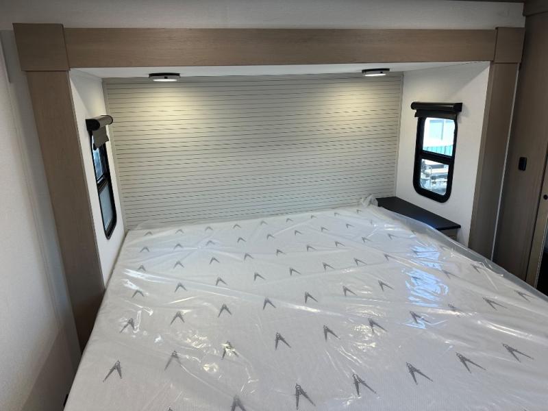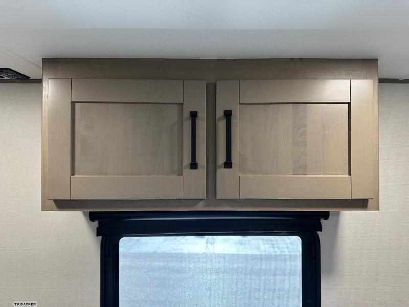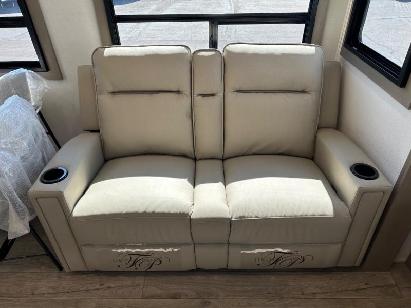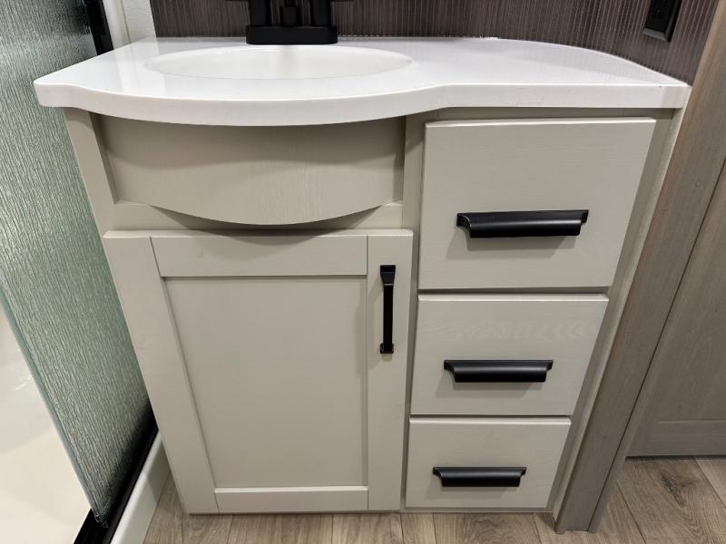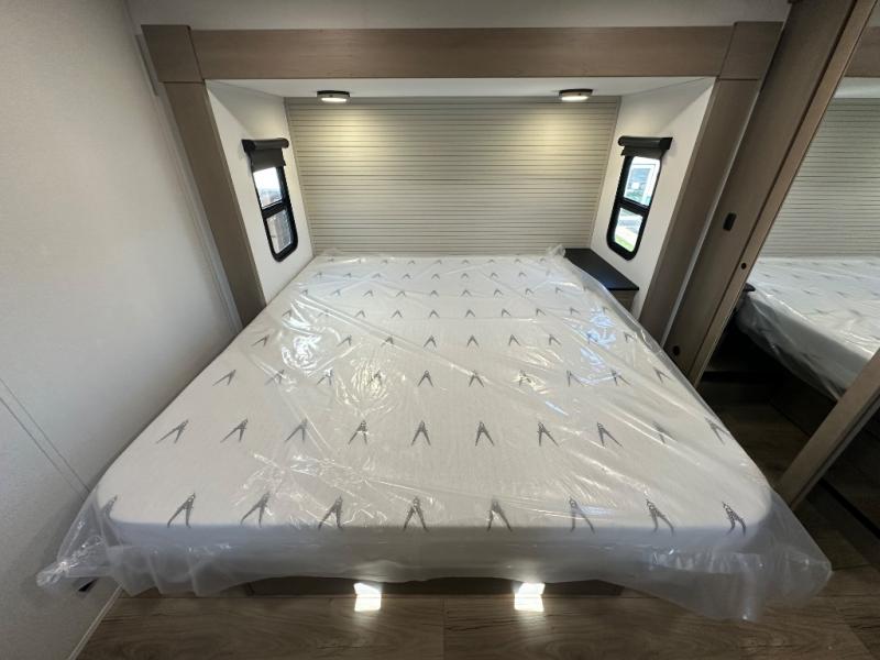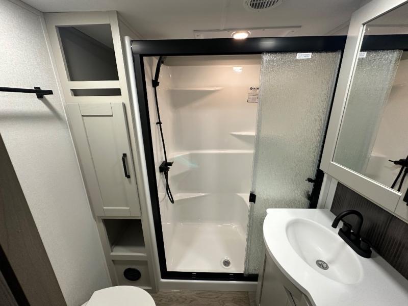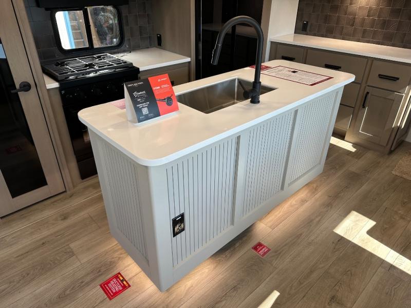 You can enjoy a spacious rear living area in this RV with dual opposing slides offering you entertainment, kitchen amenities, seating and windows for great views! The rear tri-fold sofa also converts into extra sleeping space for an extra guest or two, just like the booth dinette does. Yet you might like to add the swivel dinette option. There are theater seats to enjoy while you place your drinks in the cupholders and watch the entertainment center with a 40" LED HDTV and fireplace. The pantry is big enough to store your favorite snacks, and the kitchen island will make meal prepping easier, plus there is a 16 cu. ft. refrigerator to store any leftovers. The full bathroom has a 30" x 48" fiberglass shower and a linen closet to store your towels. The front private bedroom has a comfortable queen bed slide that can be switched out for the optional king bed, a dresser with overhead cabinets, and a full wall wardrobe that is prepped to add the optional washer and dryer so that you can extend your camping trip with clean clothes!