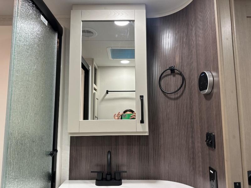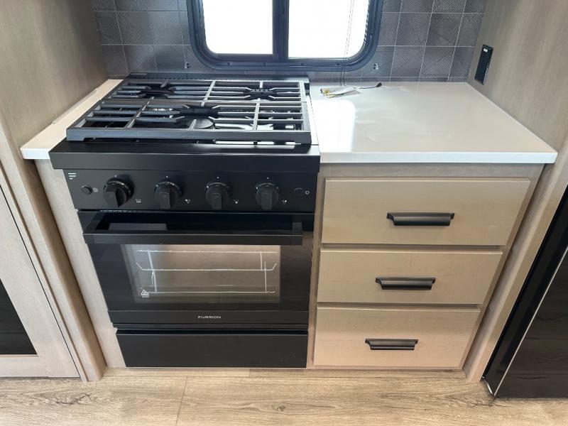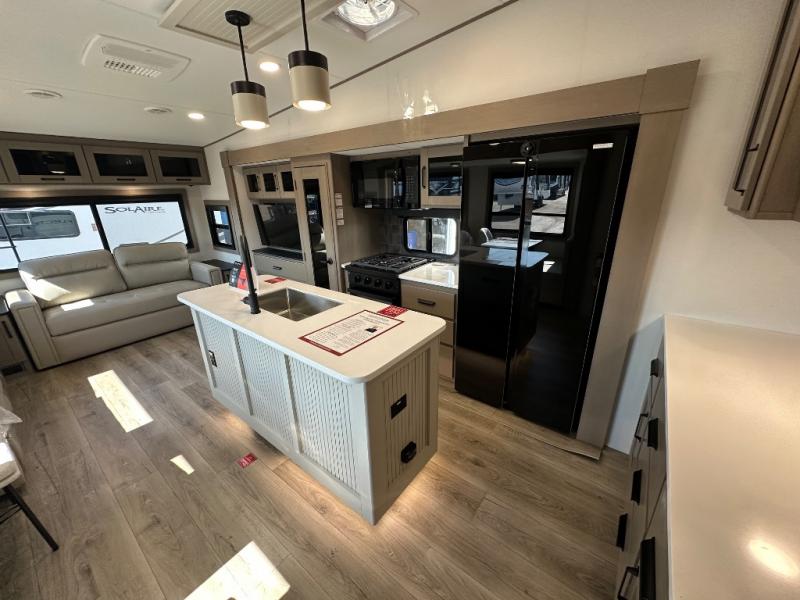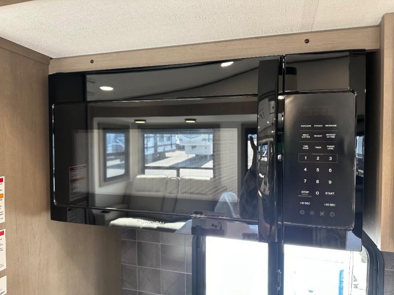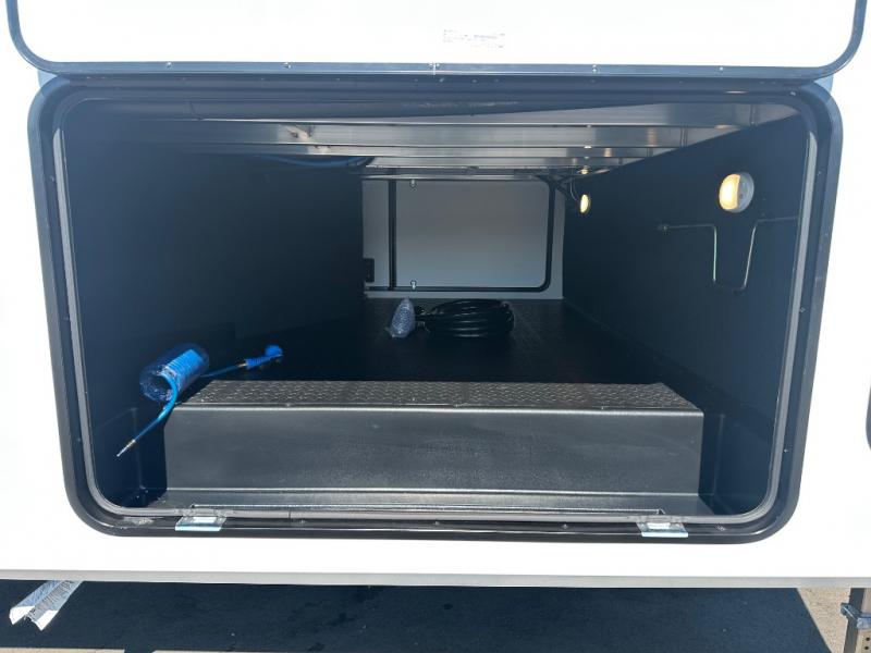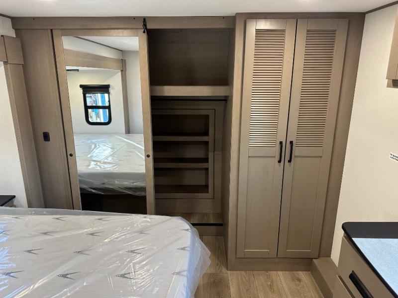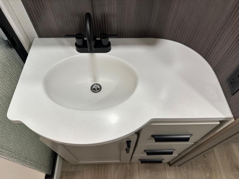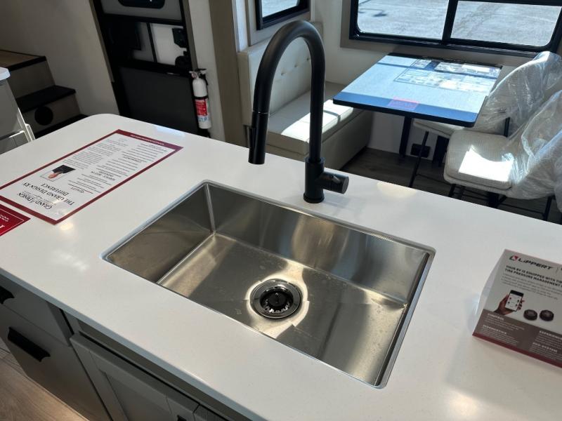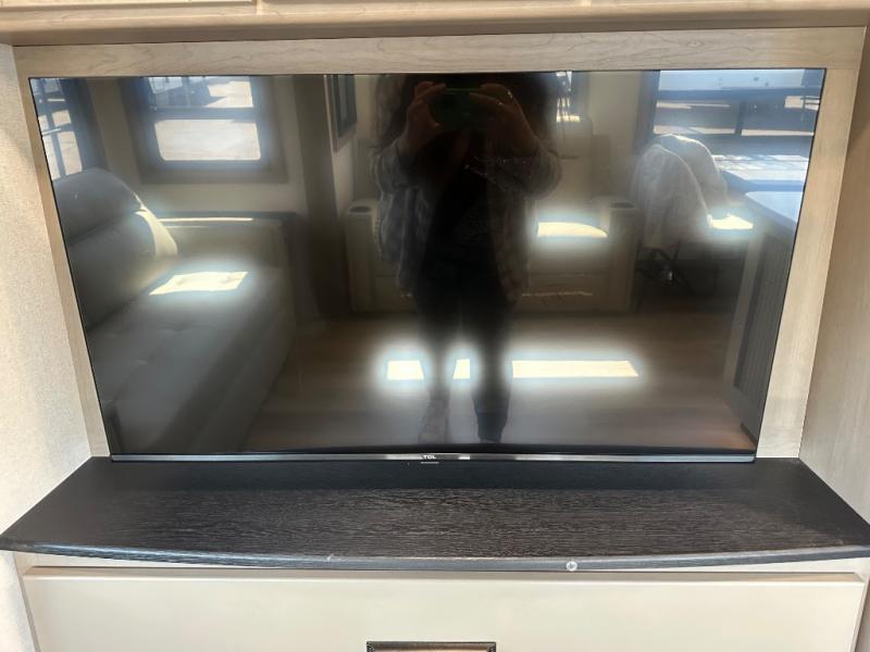 You can enjoy a spacious rear living area in this RV with dual opposing slides offering you entertainment, kitchen amenities, seating and windows for great views! The rear tri-fold sofa also converts into extra sleeping space for an extra guest or two, just like the booth dinette does. Yet you might like to add the swivel dinette option. There are theater seats to enjoy while you place your drinks in the cupholders and watch the entertainment center with a 40" LED HDTV and fireplace. The pantry is big enough to store your favorite snacks, and the kitchen island will make meal prepping easier, plus there is a 16 cu. ft. refrigerator to store any leftovers. The full bathroom has a 30" x 48" fiberglass shower and a linen closet to store your towels. The front private bedroom has a comfortable queen bed slide that can be switched out for the optional king bed, a dresser with overhead cabinets, and a full wall wardrobe that is prepped to add the optional washer and dryer so that you can extend your camping trip with clean clothes!
