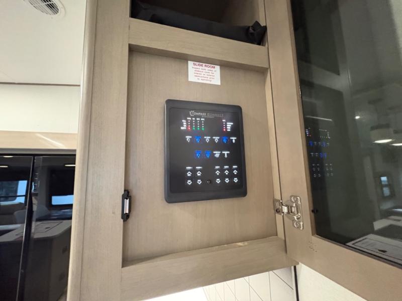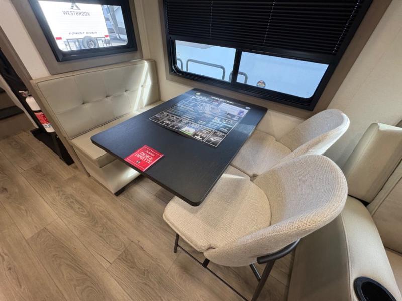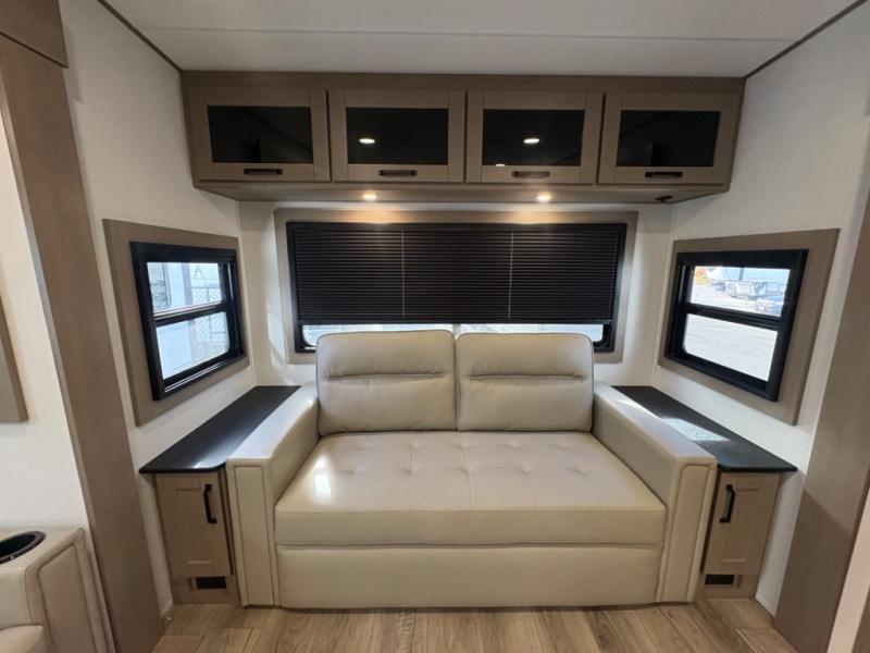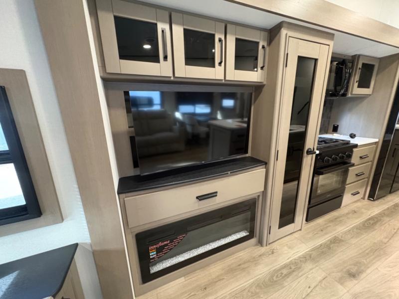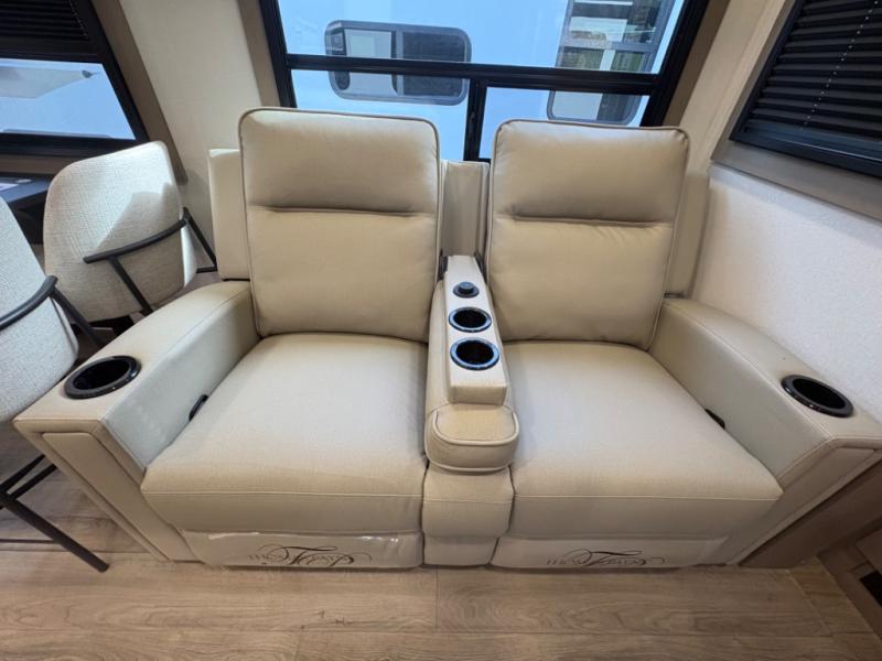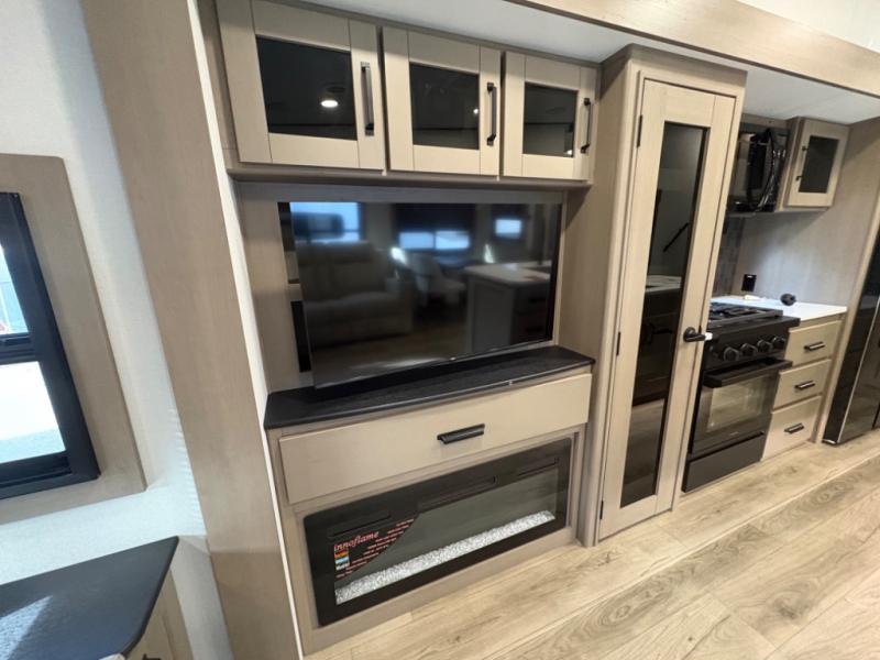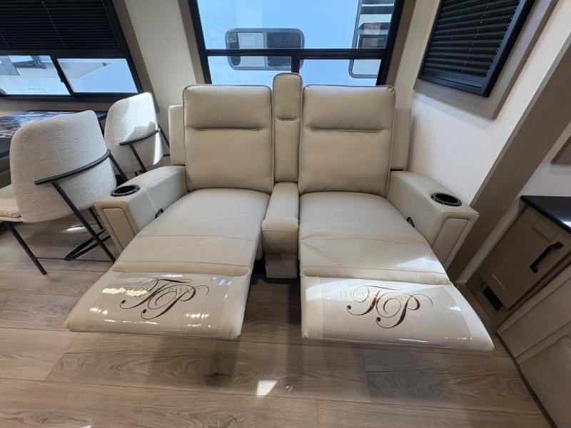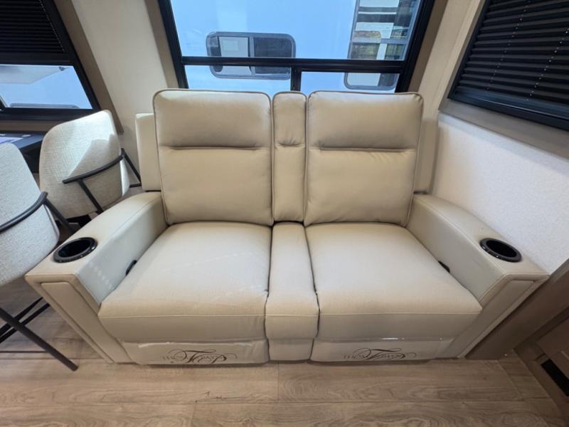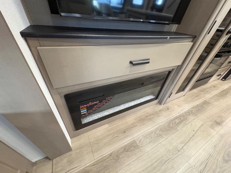 Inside you’ll find a luxurious rear living area with a tri-fold sofa and theater-style seating, a fireplace and 40? LED HDTV for an at-home feel.