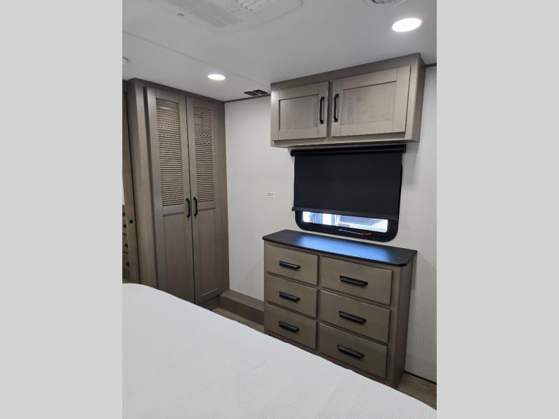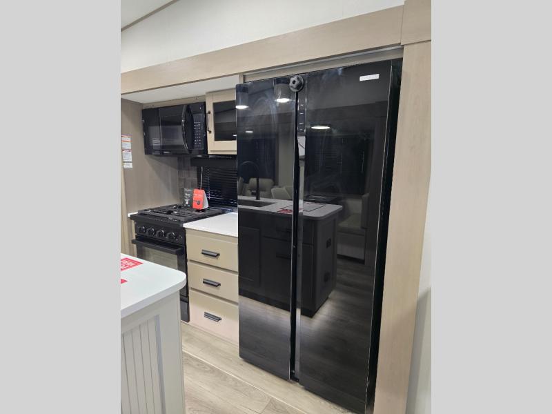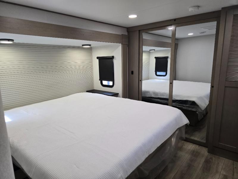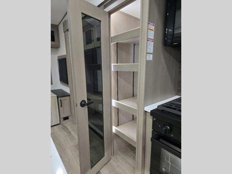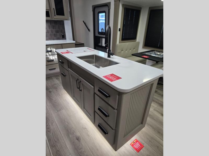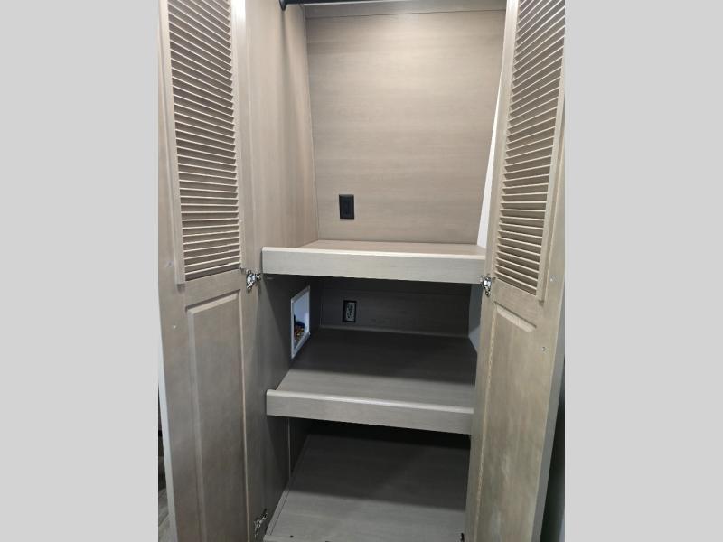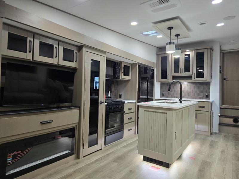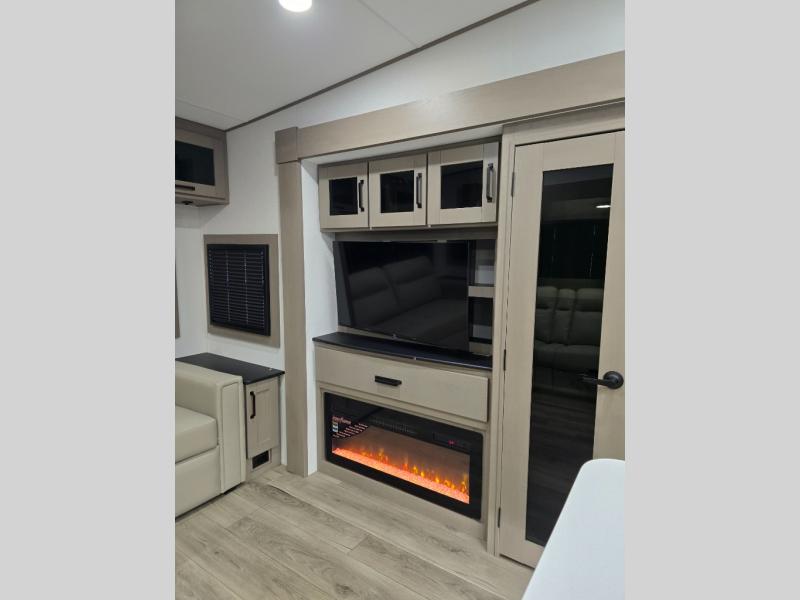 You can enjoy a spacious rear living area in this RV with dual opposing slides offering you entertainment, kitchen amenities, seating and windows for great views! The rear tri-fold sofa also converts into extra sleeping space for an extra guest or two, just like the booth dinette does. Yet you might like to add the swivel dinette option. There are theater seats to enjoy while you place your drinks in the cupholders and watch the entertainment center with a 40" LED HDTV and fireplace. The pantry is big enough to store your favorite snacks, and the kitchen island will make meal prepping easier, plus there is a 16 cu. ft. refrigerator to store any leftovers. The full bathroom has a 30" x 48" fiberglass shower and a linen closet to store your towels. The front private bedroom has a comfortable queen bed slide that can be switched out for the optional king bed, a dresser with overhead cabinets, and a full wall wardrobe that is prepped to add the optional washer and dryer so that you can extend your camping trip with clean clothes!
