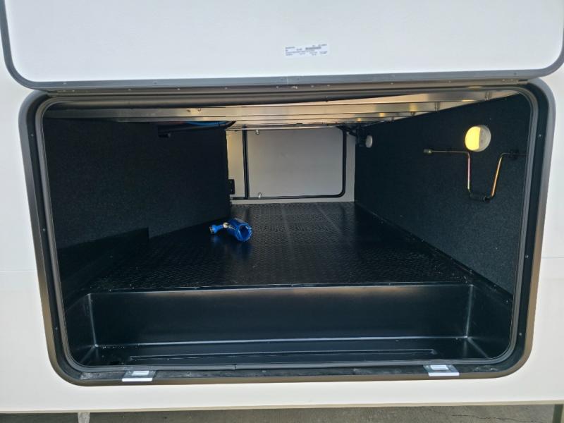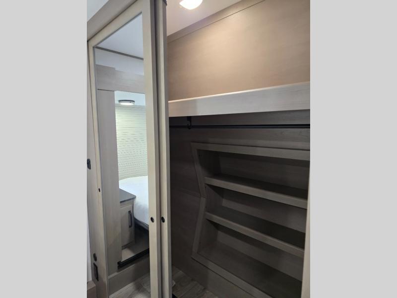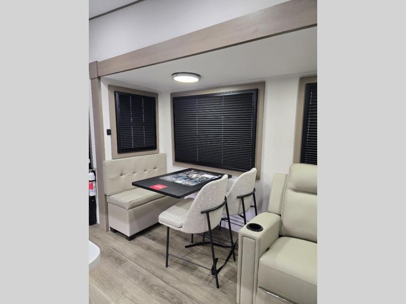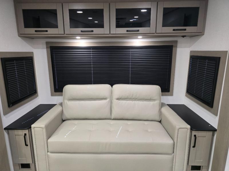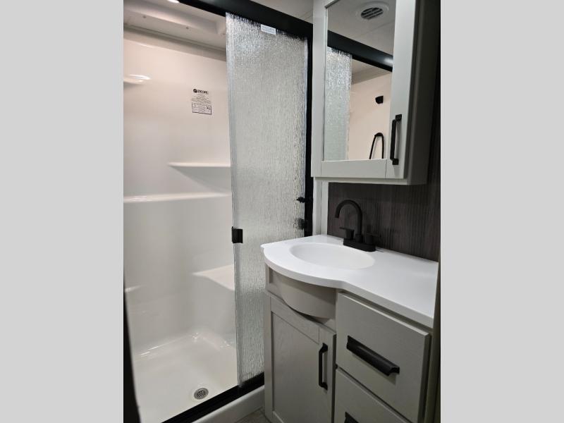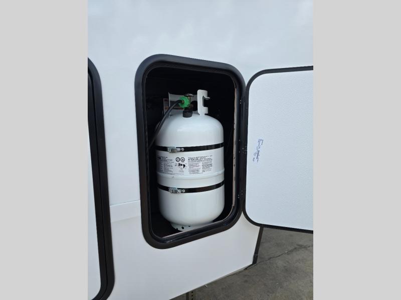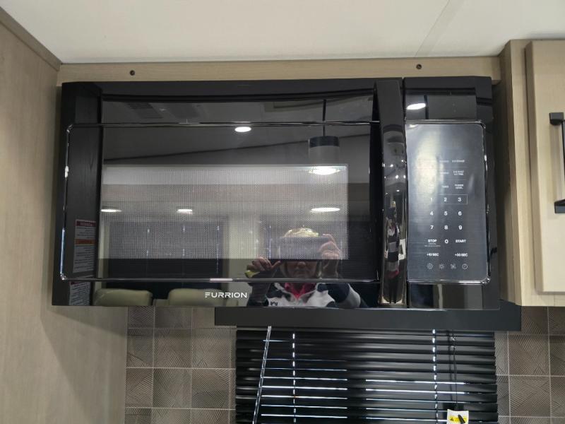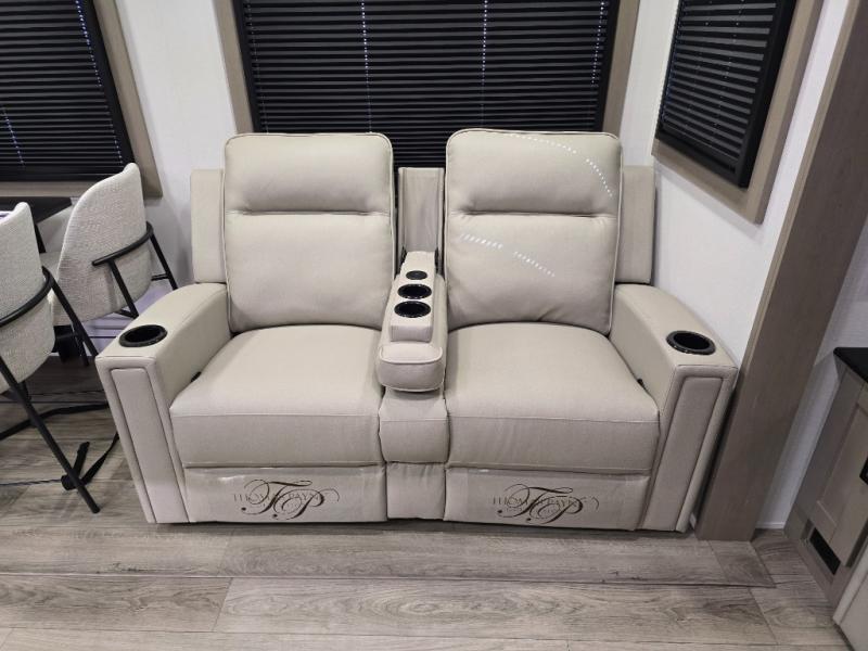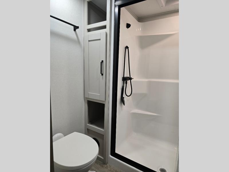 You can enjoy a spacious rear living area in this RV with dual opposing slides offering you entertainment, kitchen amenities, seating and windows for great views! The rear tri-fold sofa also converts into extra sleeping space for an extra guest or two, just like the booth dinette does. Yet you might like to add the swivel dinette option. There are theater seats to enjoy while you place your drinks in the cupholders and watch the entertainment center with a 40" LED HDTV and fireplace. The pantry is big enough to store your favorite snacks, and the kitchen island will make meal prepping easier, plus there is a 16 cu. ft. refrigerator to store any leftovers. The full bathroom has a 30" x 48" fiberglass shower and a linen closet to store your towels. The front private bedroom has a comfortable queen bed slide that can be switched out for the optional king bed, a dresser with overhead cabinets, and a full wall wardrobe that is prepped to add the optional washer and dryer so that you can extend your camping trip with clean clothes!