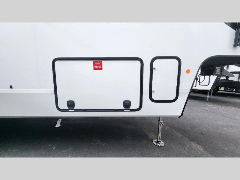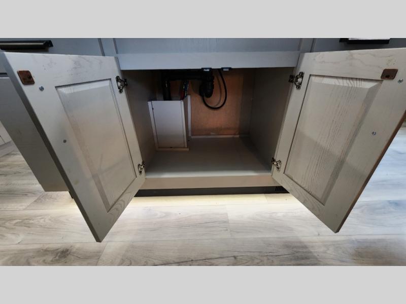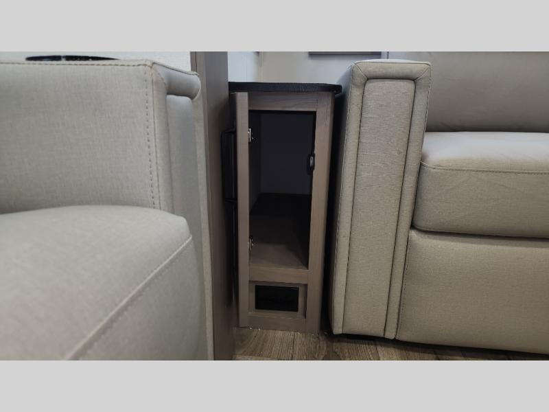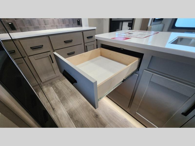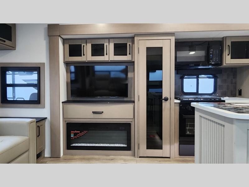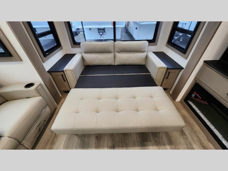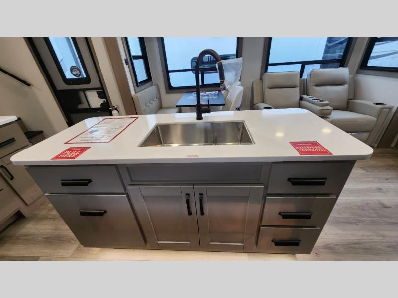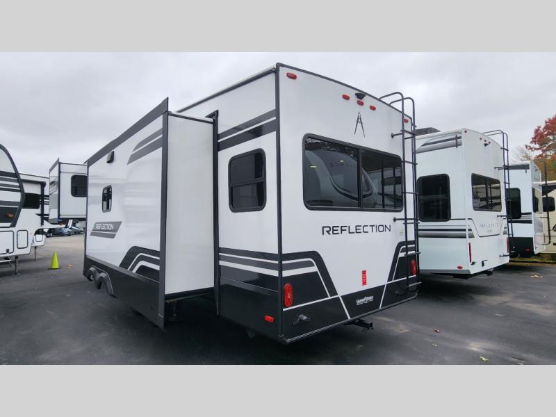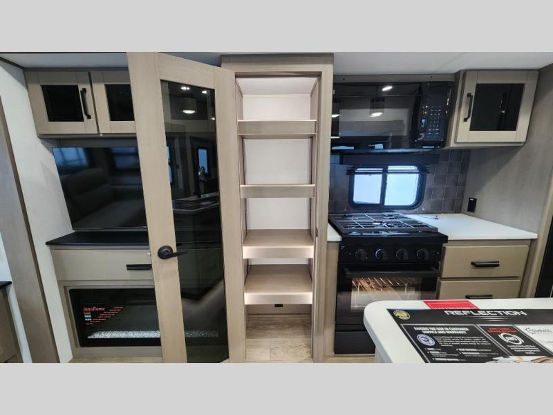 Inside, you’ll find an open living area with panoramic windows, plush theater seating, a tri-fold sofa, and an entertainment center designed for relaxing after a long day outdoors. The fully equipped kitchen features solid-surface countertops, a large stainless-steel sink, premium appliances, and excellent storage including a generous pantry. Whether you're cooking for two or hosting friends at the campground, the Reflection 337RLS makes every meal feel effortless.