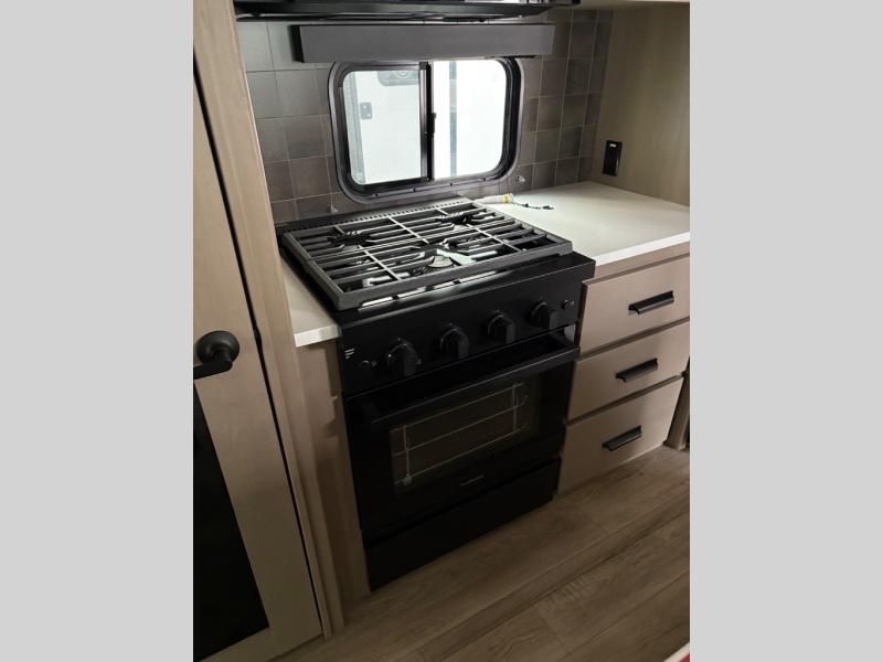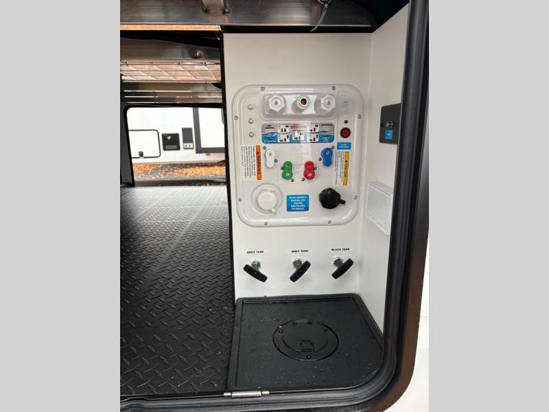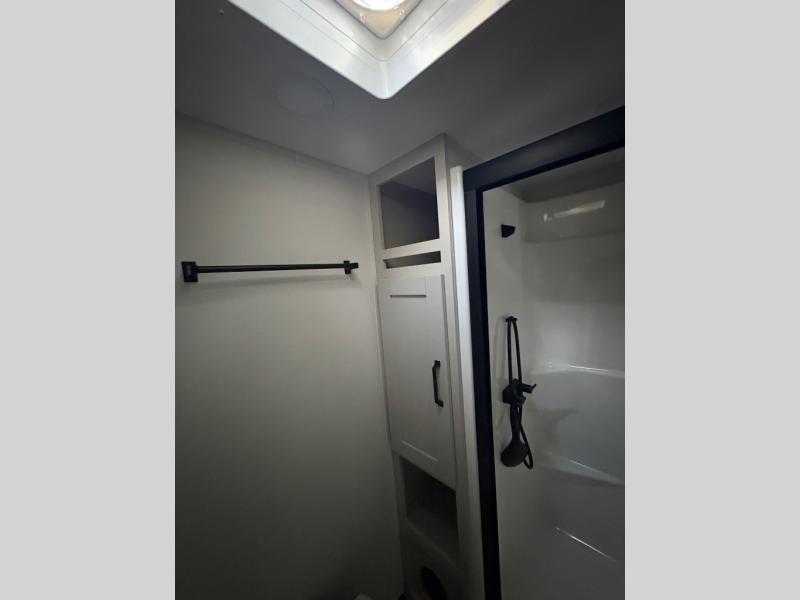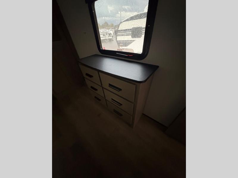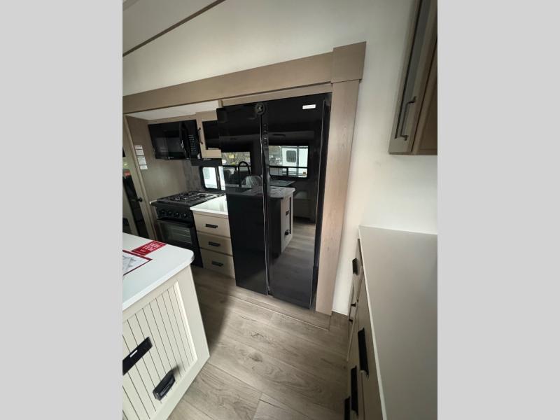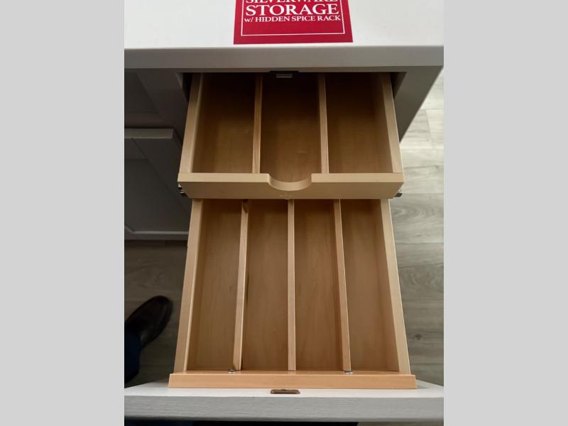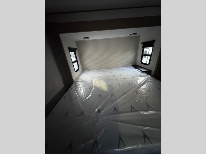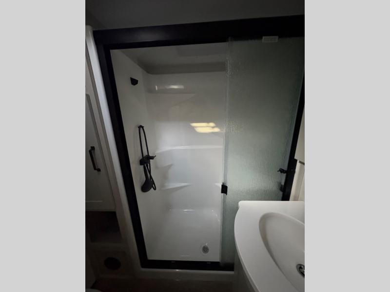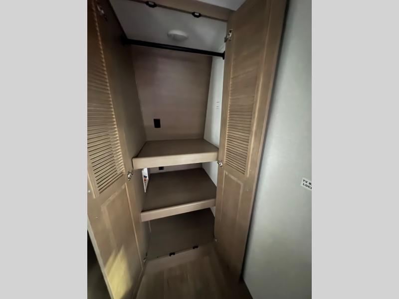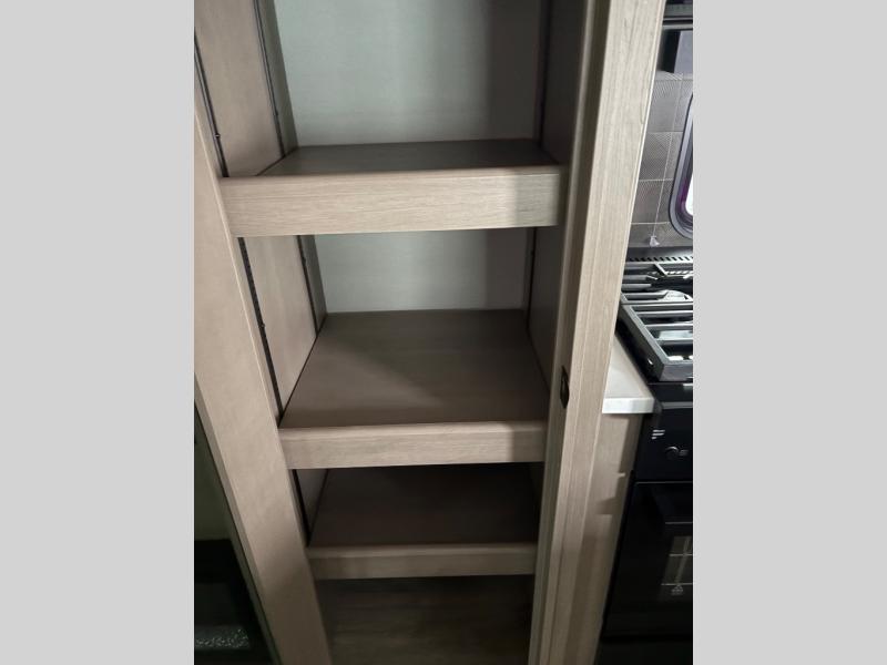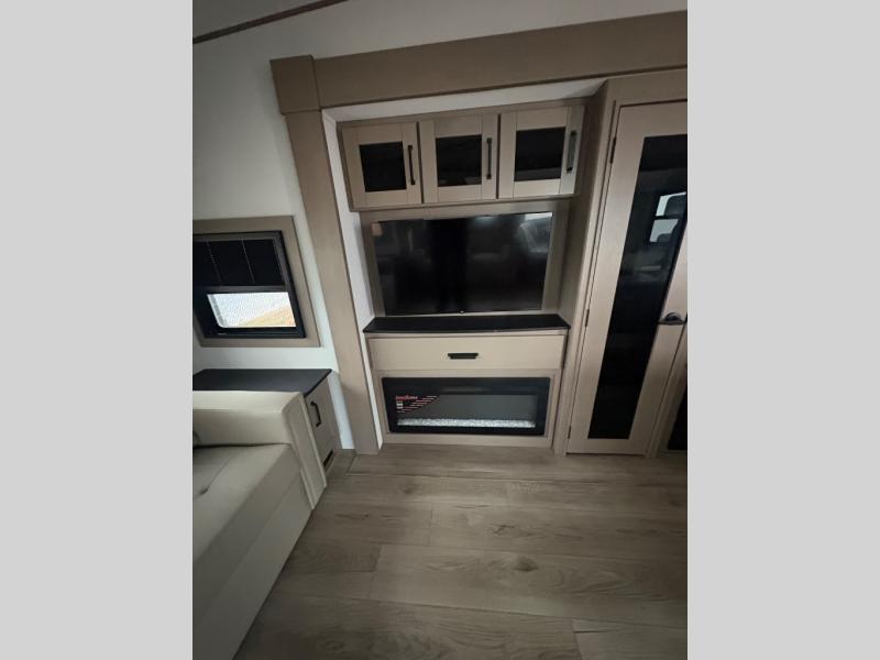 You can enjoy a spacious rear living area in this RV with dual opposing slides offering you entertainment, kitchen amenities, seating and windows for great views! The rear tri-fold sofa also converts into extra sleeping space for an extra guest or two, just like the booth dinette does. Yet you might like to add the swivel dinette option. There are theater seats to enjoy while you place your drinks in the cupholders and watch the entertainment center with a 40" LED HDTV and fireplace. The pantry is big enough to store your favorite snacks, and the kitchen island will make meal prepping easier, plus there is a 16 cu. ft. refrigerator to store any leftovers. The full bathroom has a 30" x 48" fiberglass shower and a linen closet to store your towels. The front private bedroom has a comfortable queen bed slide that can be switched out for the optional king bed, a dresser with overhead cabinets, and a full wall wardrobe that is prepped to add the optional washer and dryer so that you can extend your camping trip with clean clothes!