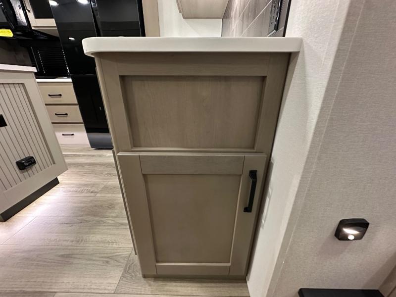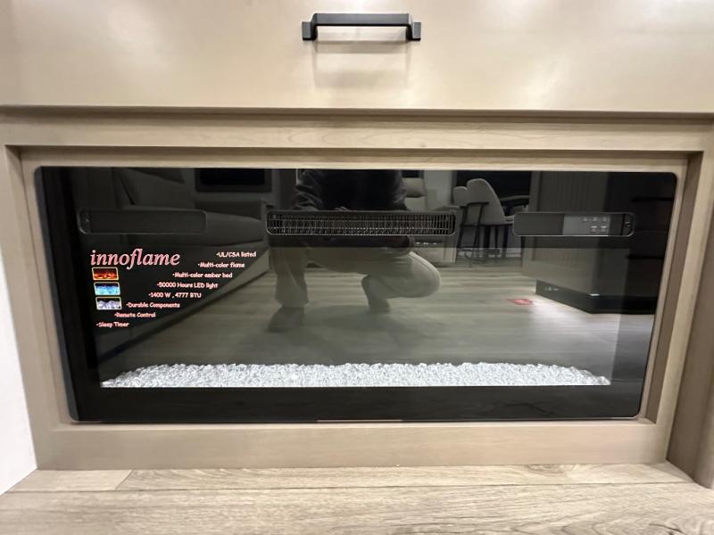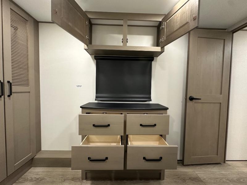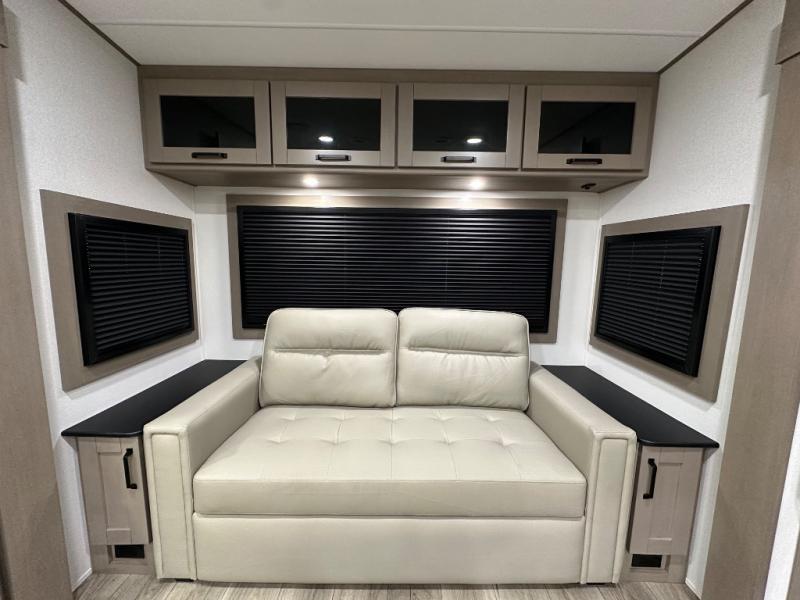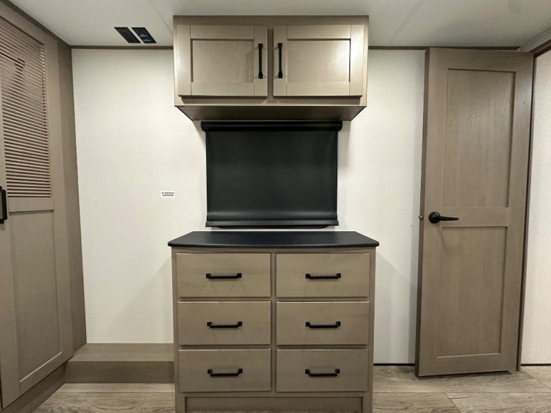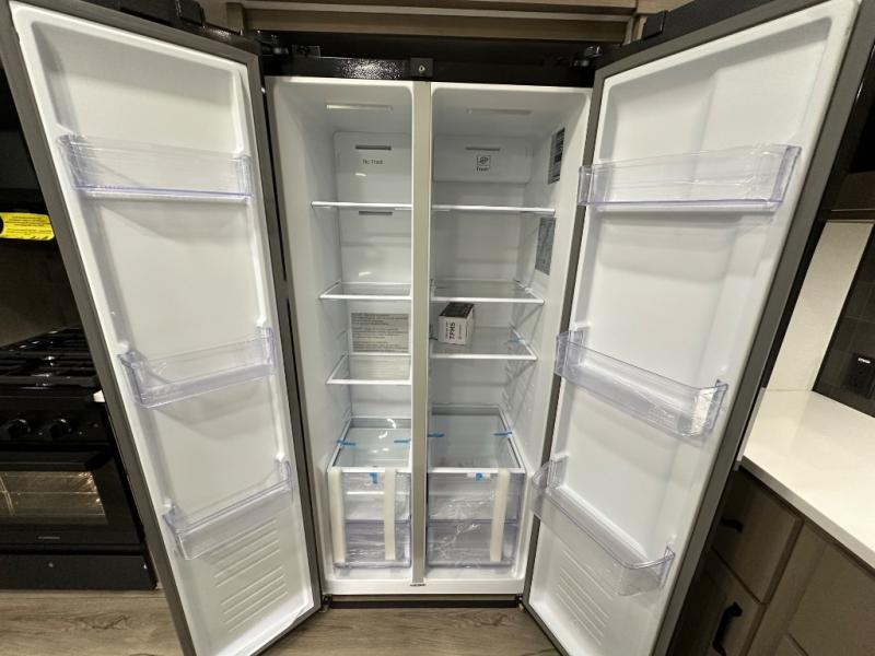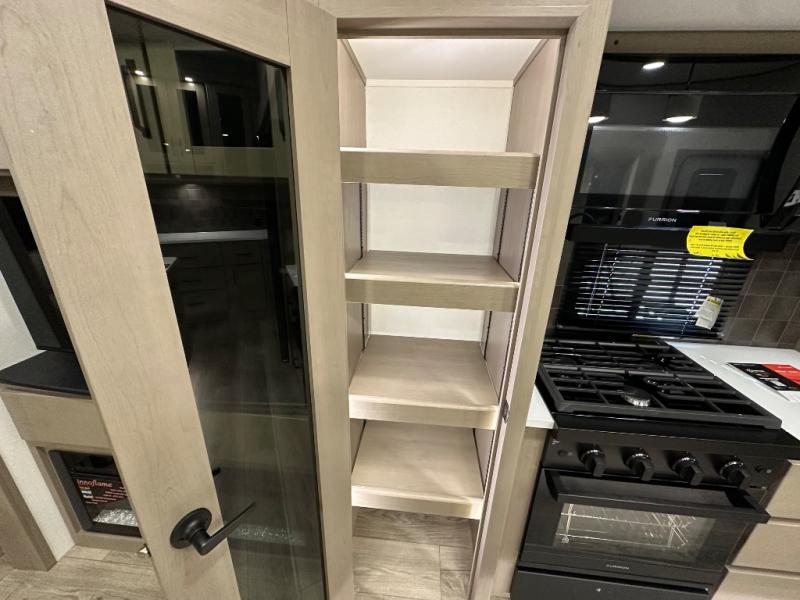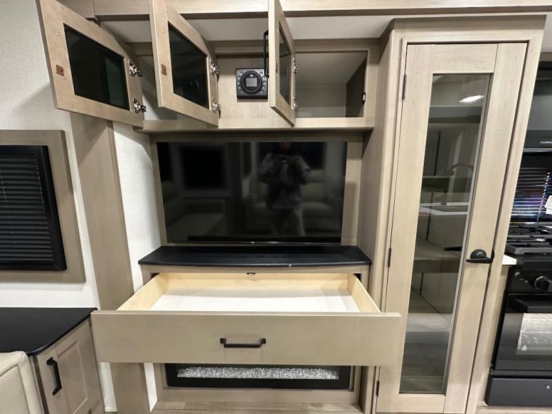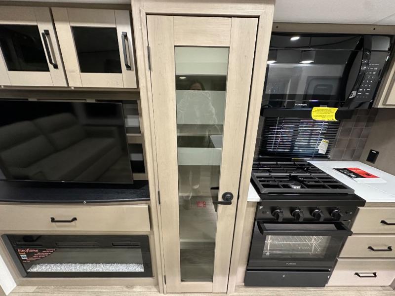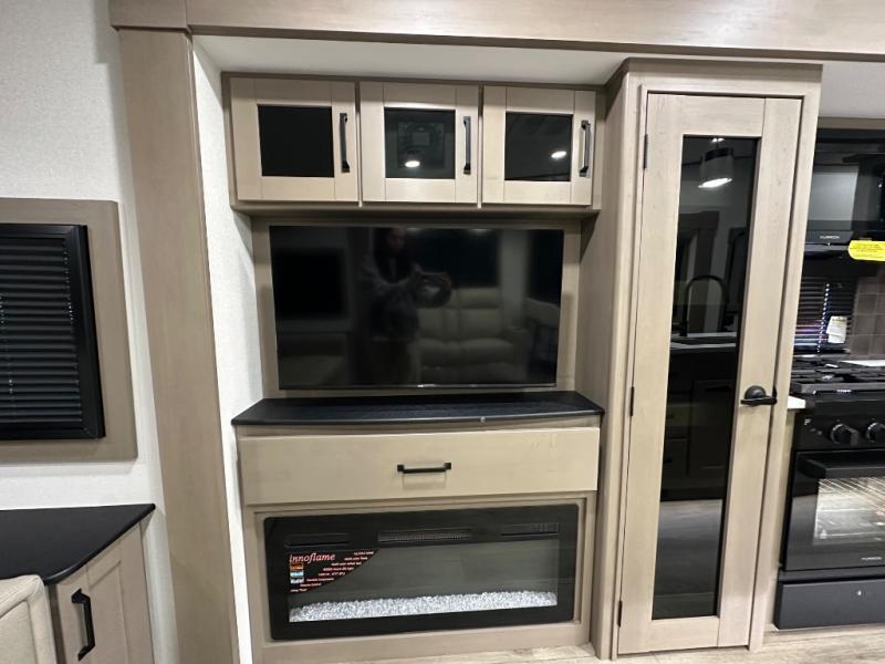 You can enjoy a spacious rear living area in this RV with dual opposing slides offering you entertainment, kitchen amenities, seating and windows for great views! The rear tri-fold sofa also converts into extra sleeping space for an extra guest or two, just like the booth dinette does. Yet you might like to add the swivel dinette option. There are theater seats to enjoy while you place your drinks in the cupholders and watch the entertainment center with a 40" LED HDTV and fireplace. The pantry is big enough to store your favorite snacks, and the kitchen island will make meal prepping easier, plus there is a 16 cu. ft. refrigerator to store any leftovers. The full bathroom has a 30" x 48" fiberglass shower and a linen closet to store your towels. The front private bedroom has a comfortable queen bed slide that can be switched out for the optional king bed, a dresser with overhead cabinets, and a full wall wardrobe that is prepped to add the optional washer and dryer so that you can extend your camping trip with clean clothes!
