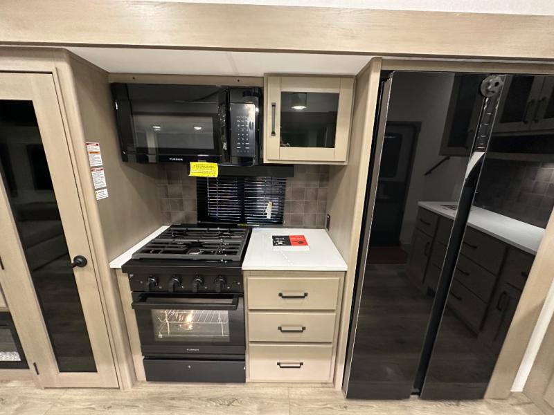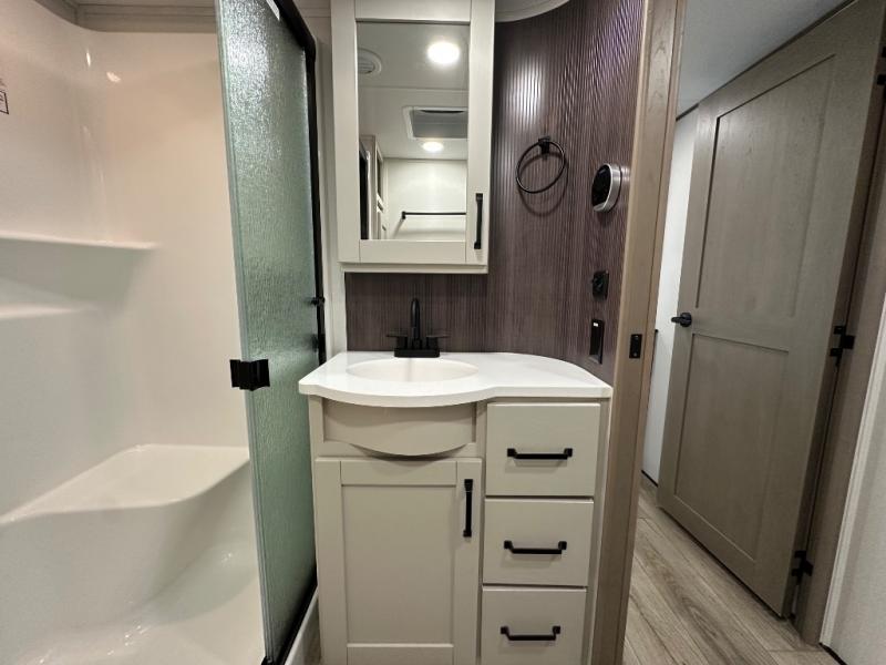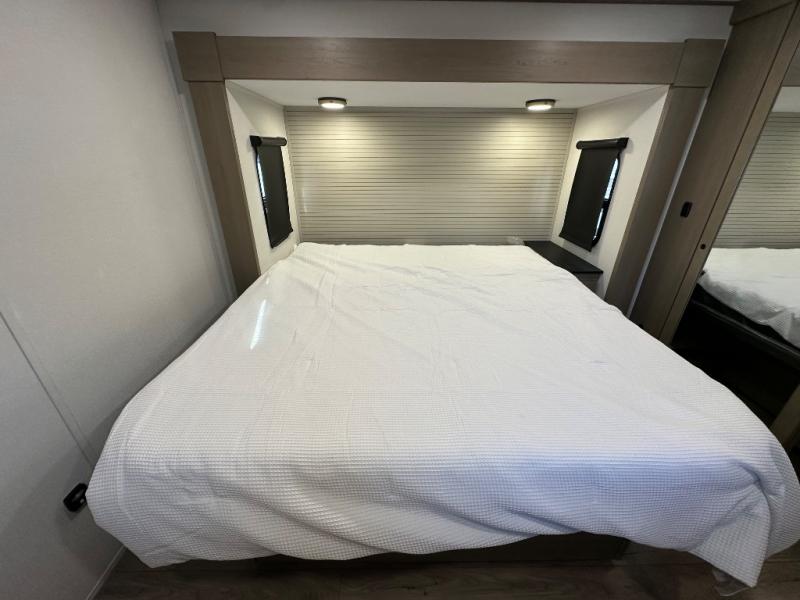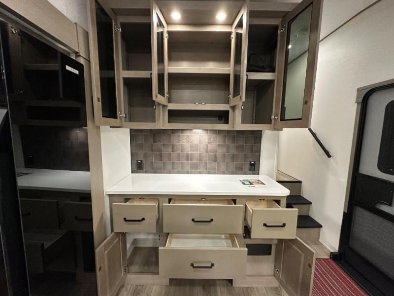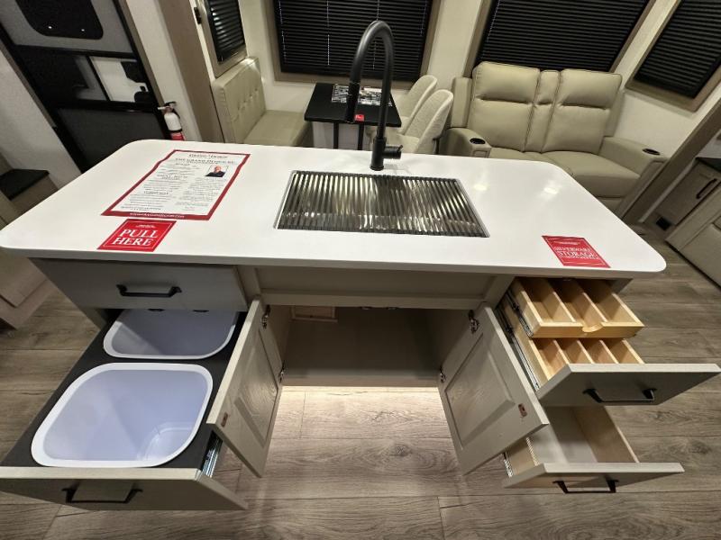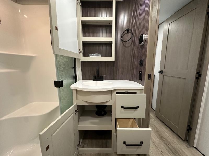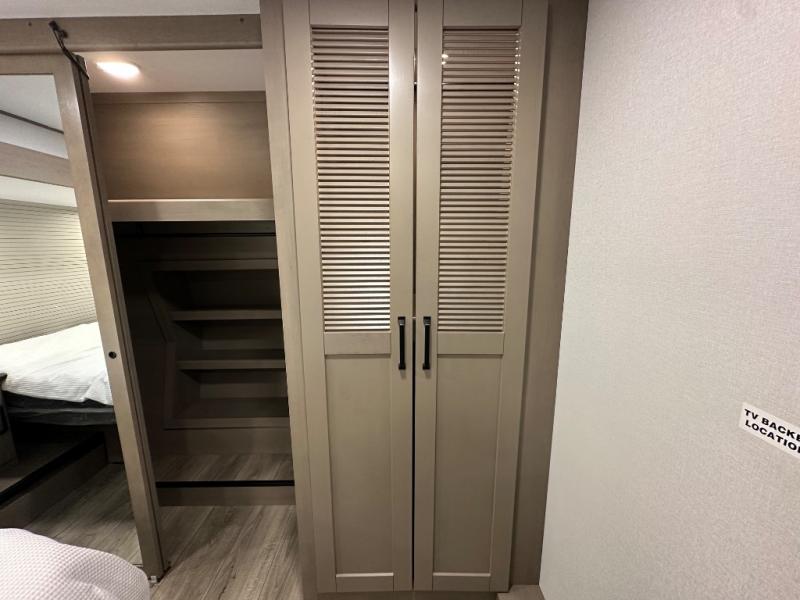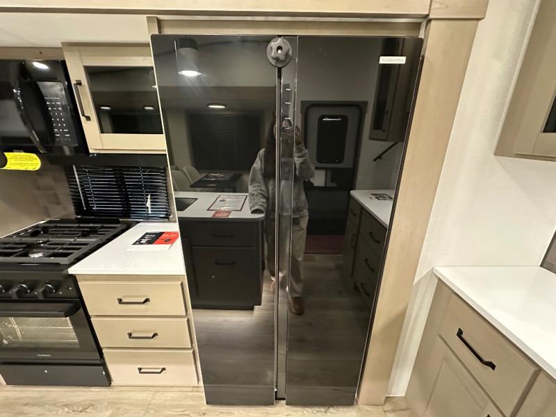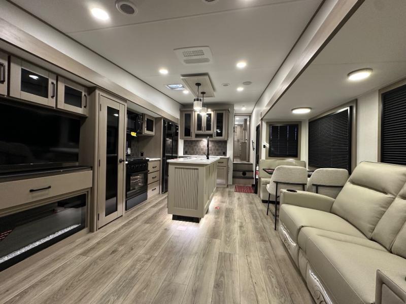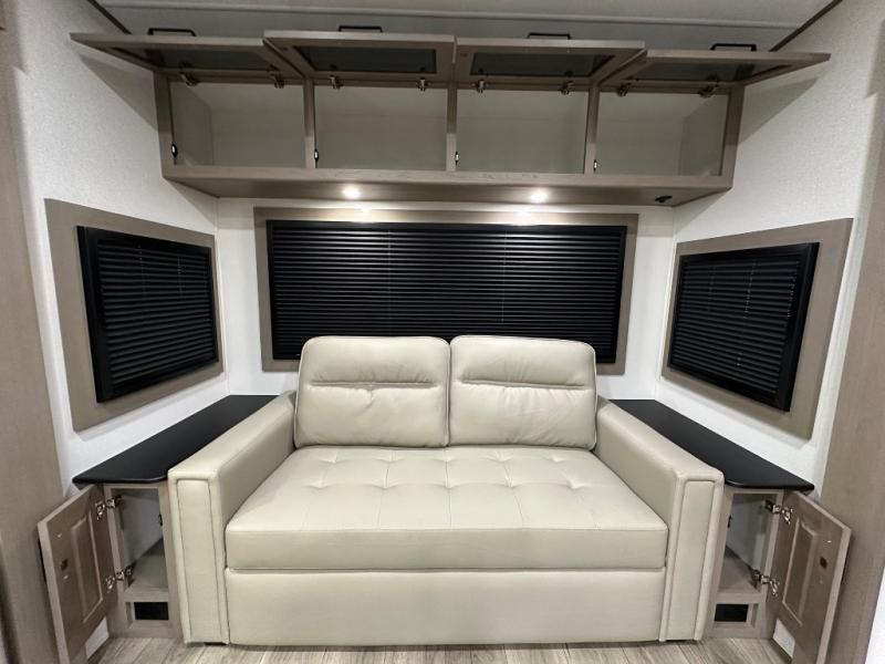 You can enjoy a spacious rear living area in this RV with dual opposing slides offering you entertainment, kitchen amenities, seating and windows for great views! The rear tri-fold sofa also converts into extra sleeping space for an extra guest or two, just like the booth dinette does. Yet you might like to add the swivel dinette option. There are theater seats to enjoy while you place your drinks in the cupholders and watch the entertainment center with a 40" LED HDTV and fireplace. The pantry is big enough to store your favorite snacks, and the kitchen island will make meal prepping easier, plus there is a 16 cu. ft. refrigerator to store any leftovers. The full bathroom has a 30" x 48" fiberglass shower and a linen closet to store your towels. The front private bedroom has a comfortable queen bed slide that can be switched out for the optional king bed, a dresser with overhead cabinets, and a full wall wardrobe that is prepped to add the optional washer and dryer so that you can extend your camping trip with clean clothes!