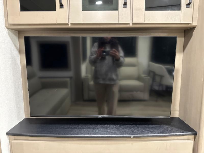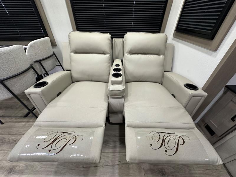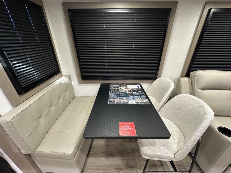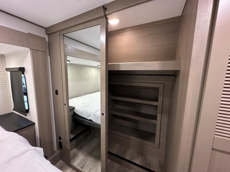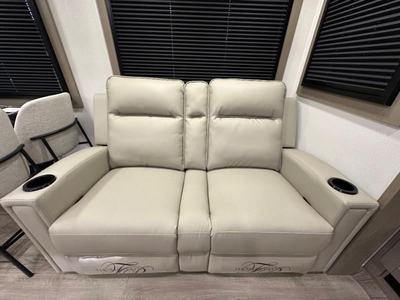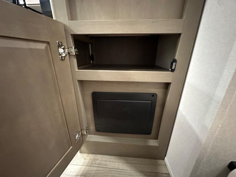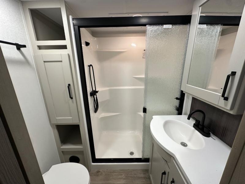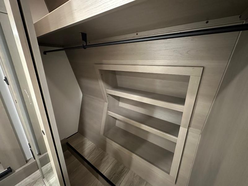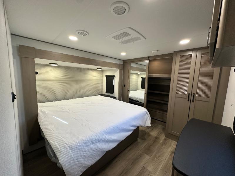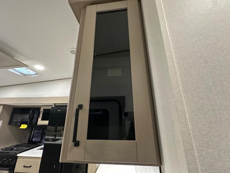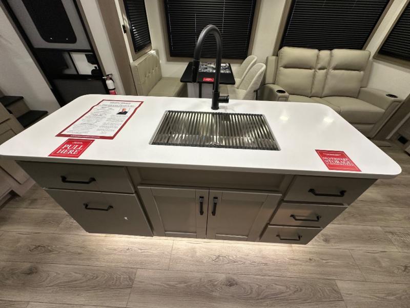 You can enjoy a spacious rear living area in this RV with dual opposing slides offering you entertainment, kitchen amenities, seating and windows for great views! The rear tri-fold sofa also converts into extra sleeping space for an extra guest or two, just like the booth dinette does. Yet you might like to add the swivel dinette option. There are theater seats to enjoy while you place your drinks in the cupholders and watch the entertainment center with a 40" LED HDTV and fireplace. The pantry is big enough to store your favorite snacks, and the kitchen island will make meal prepping easier, plus there is a 16 cu. ft. refrigerator to store any leftovers. The full bathroom has a 30" x 48" fiberglass shower and a linen closet to store your towels. The front private bedroom has a comfortable queen bed slide that can be switched out for the optional king bed, a dresser with overhead cabinets, and a full wall wardrobe that is prepped to add the optional washer and dryer so that you can extend your camping trip with clean clothes!