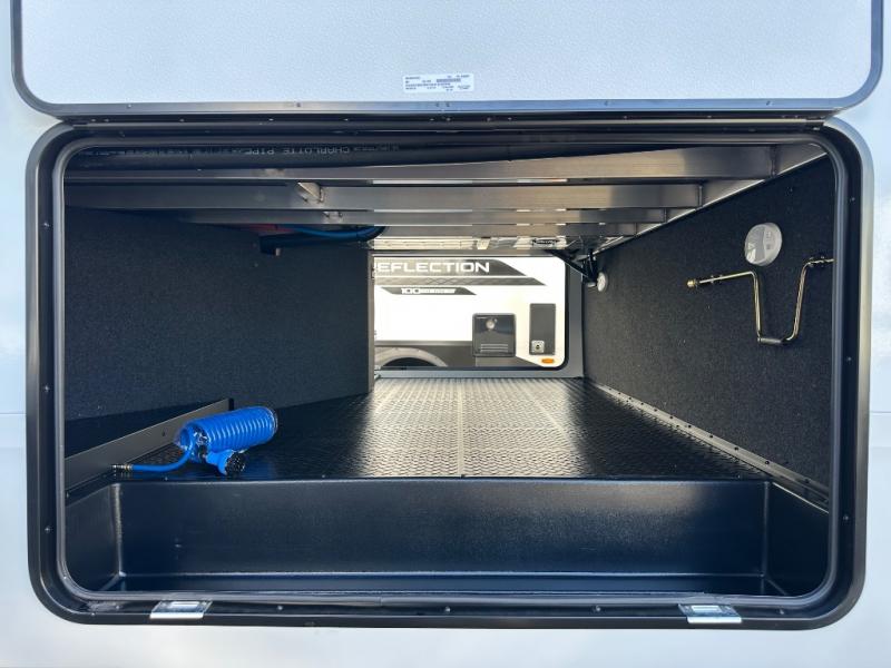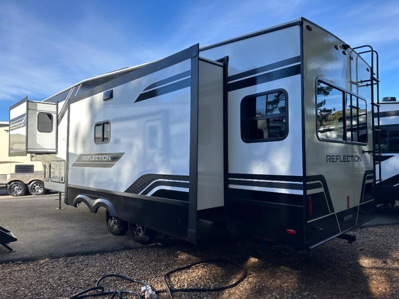 With any Reflection fifth wheel by Grand Design, you will have a solar panel for off-grid camping and a 60 amp charge controller and inverter prep, a Universal All-In-One docking station, unobstructed pass-through storage, and Goodyear Endurance tires. Each is constructed of gel coat exterior sidewalls, residential 5" truss rafters, walk-on roof decking, a fiberglass and radiant foil roof and front cap insulation plus laminated aluminum framed side walls, roof and end walls in slide rooms. Head inside to enjoy residential hardwood cabinet doors, premium Congoleum flooring, a spacious shower with a glass door, and many more comforts!