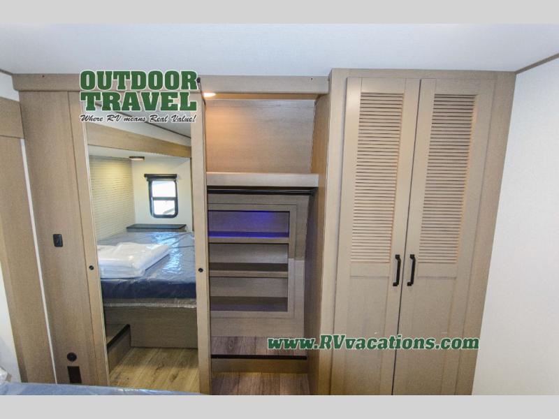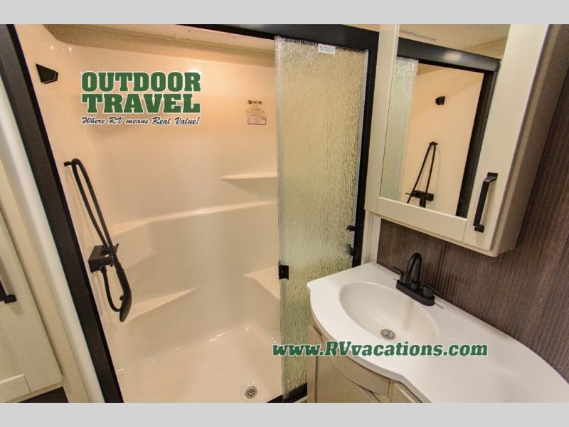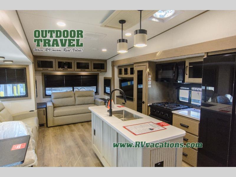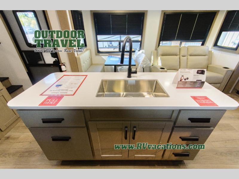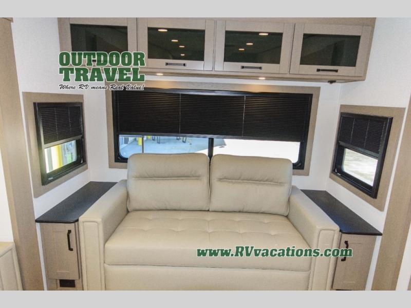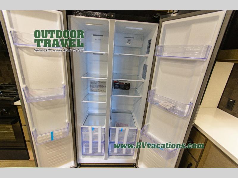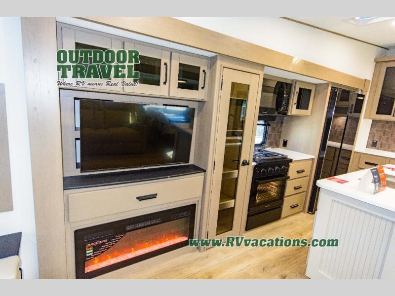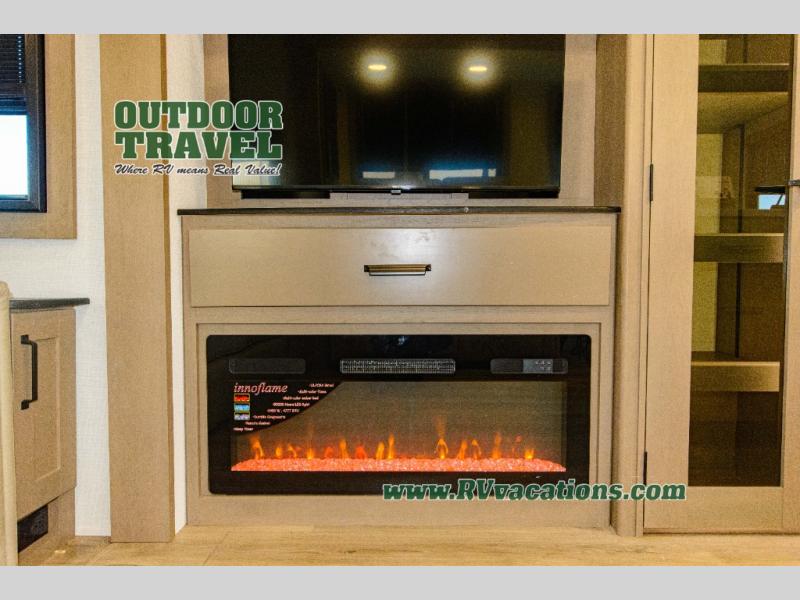 You can enjoy a spacious rear living area in this RV with dual opposing slides offering you entertainment, kitchen amenities, seating and windows for great views! The rear tri-fold sofa also converts into extra sleeping space for an extra guest or two, just like the booth dinette does. Yet you might like to add the swivel dinette option. There are theater seats to enjoy while you place your drinks in the cupholders and watch the entertainment center with a 40" LED HDTV and fireplace. The pantry is big enough to store your favorite snacks, and the kitchen island will make meal prepping easier, plus there is a 16 cu. ft. refrigerator to store any leftovers. The full bathroom has a 30" x 48" fiberglass shower and a linen closet to store your towels. The front private bedroom has a comfortable queen bed slide that can be switched out for the optional king bed, a dresser with overhead cabinets, and a full wall wardrobe that is prepped to add the optional washer and dryer so that you can extend your camping trip with clean clothes!