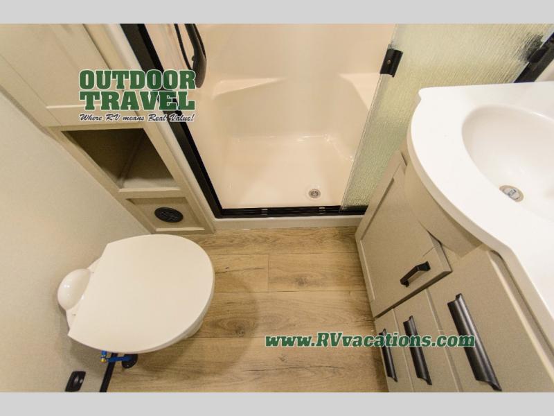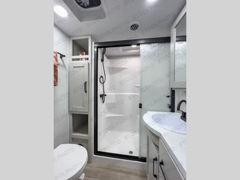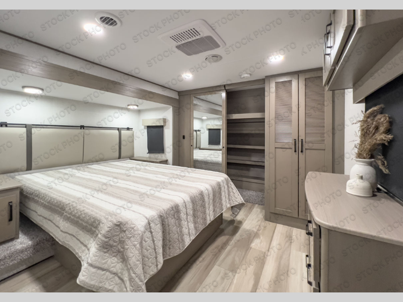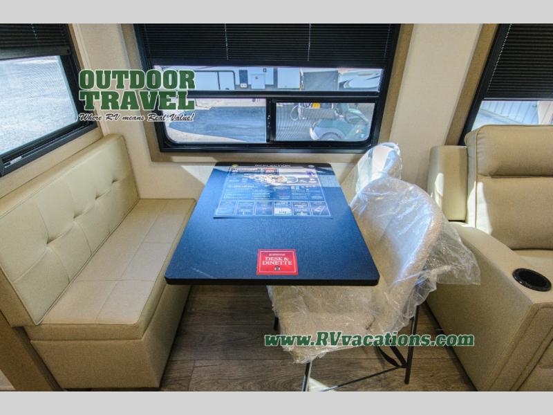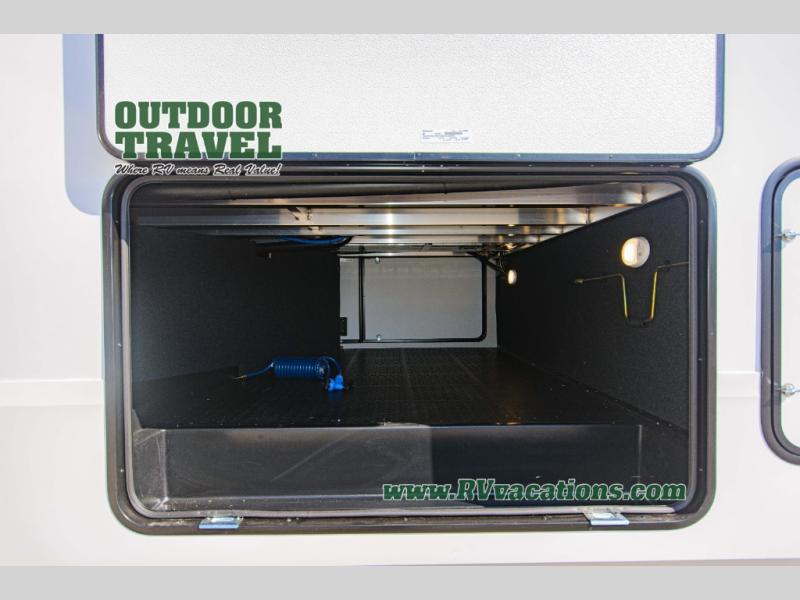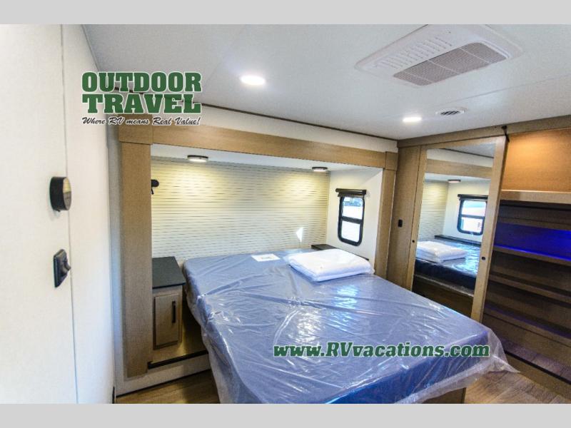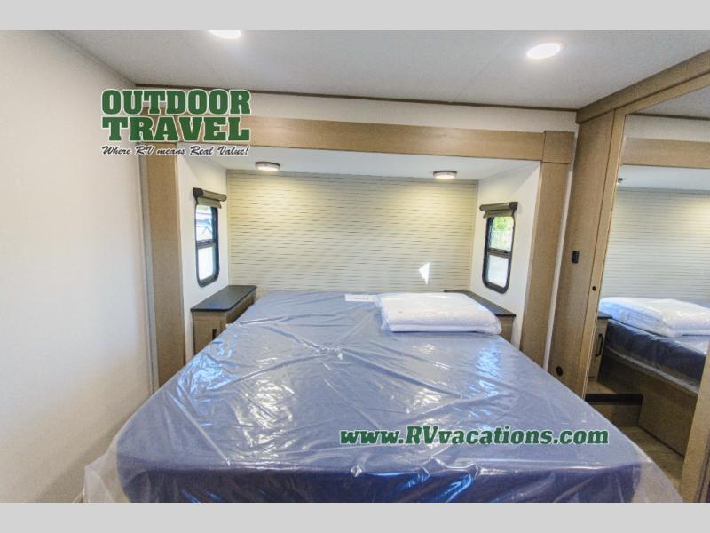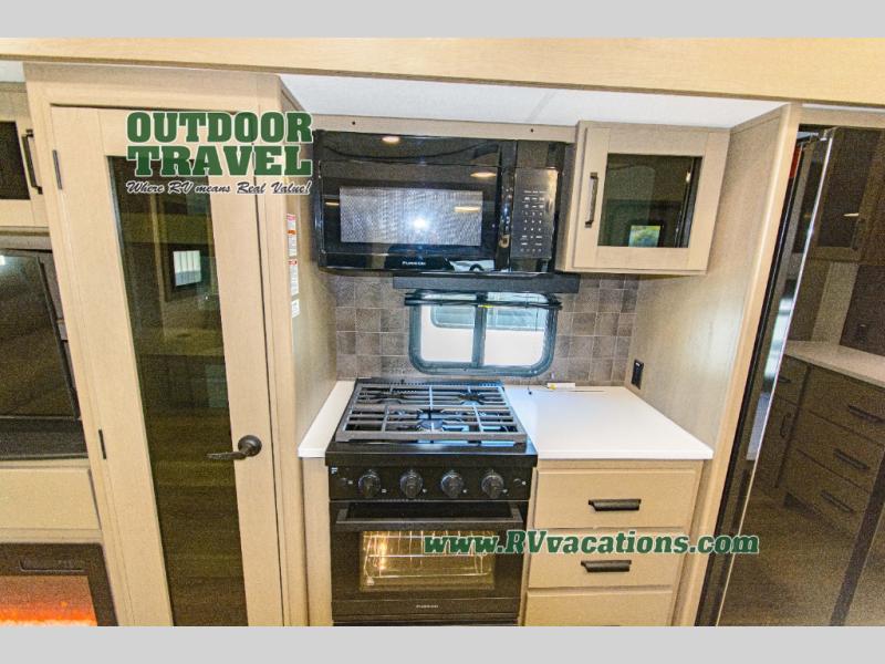 You can enjoy a spacious rear living area in this RV with dual opposing slides offering you entertainment, kitchen amenities, seating and windows for great views! The rear tri-fold sofa also converts into extra sleeping space for an extra guest or two, just like the booth dinette does. Yet you might like to add the swivel dinette option. There are theater seats to enjoy while you place your drinks in the cupholders and watch the entertainment center with a 40" LED HDTV and fireplace. The pantry is big enough to store your favorite snacks, and the kitchen island will make meal prepping easier, plus there is a 16 cu. ft. refrigerator to store any leftovers. The full bathroom has a 30" x 48" fiberglass shower and a linen closet to store your towels. The front private bedroom has a comfortable queen bed slide that can be switched out for the optional king bed, a dresser with overhead cabinets, and a full wall wardrobe that is prepped to add the optional washer and dryer so that you can extend your camping trip with clean clothes!