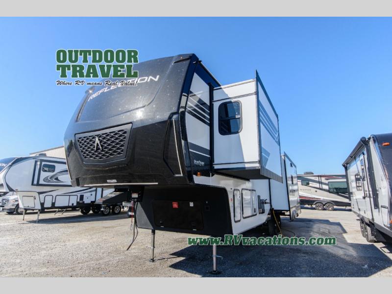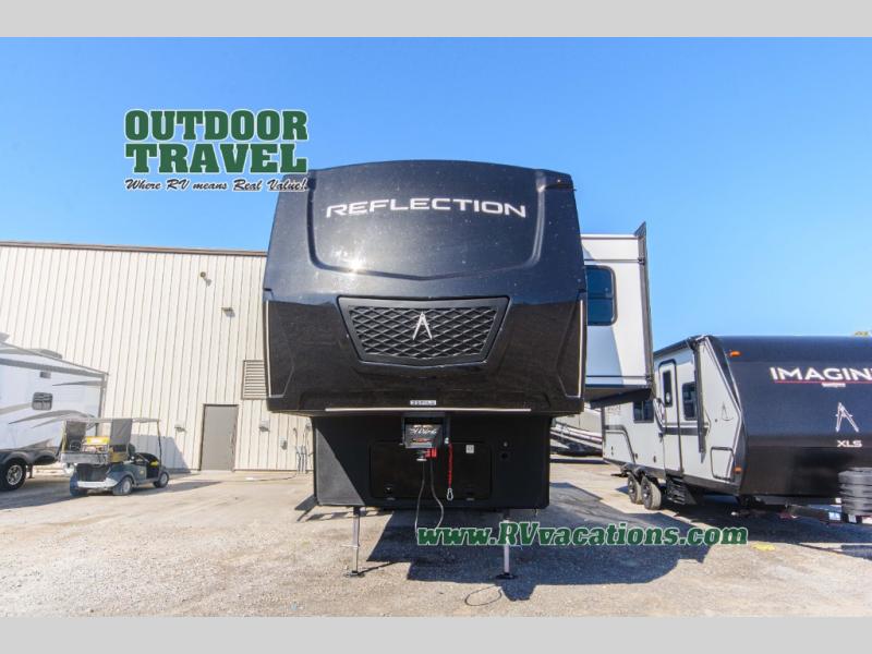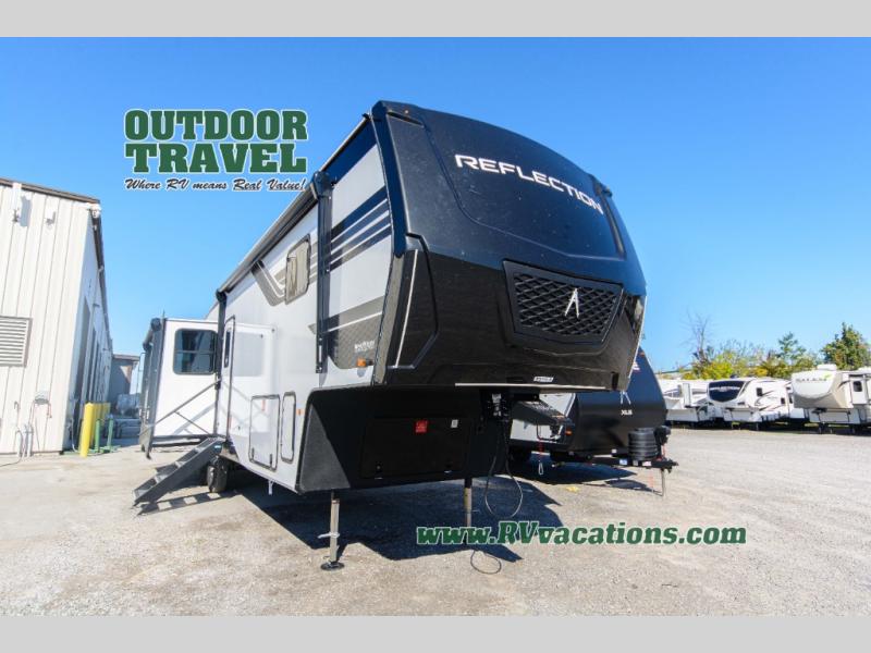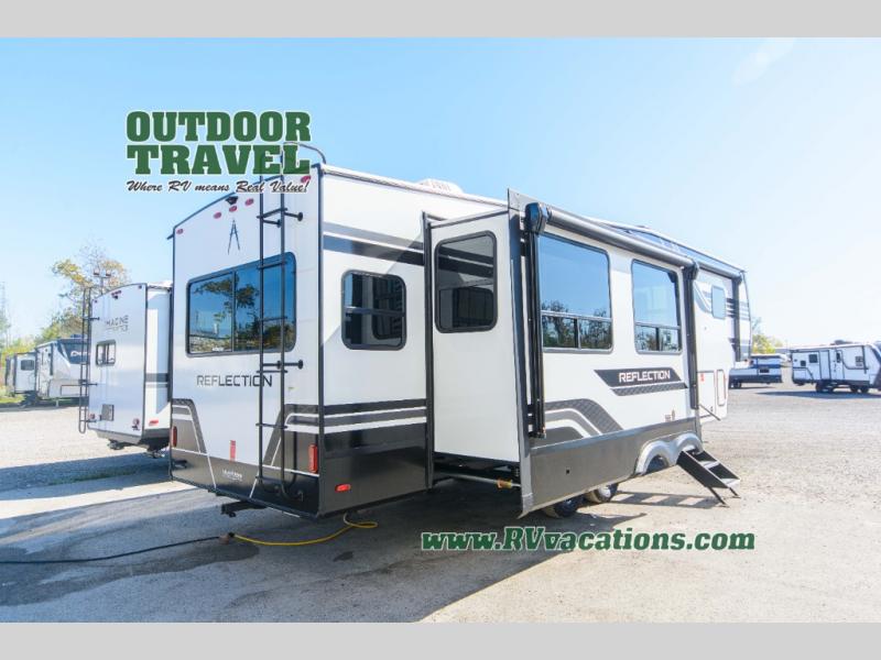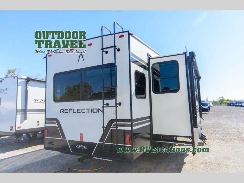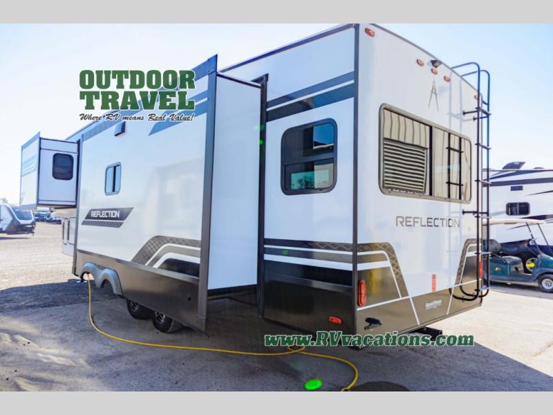 With any Reflection fifth wheel by Grand Design, you will have a solar panel for off-grid camping and a 60 amp charge controller and inverter prep, a Universal All-In-One docking station, unobstructed pass-through storage, and Goodyear Endurance tires. Each is constructed of gel coat exterior sidewalls, residential 5" truss rafters, walk-on roof decking, a fiberglass and radiant foil roof and front cap insulation plus laminated aluminum framed side walls, roof and end walls in slide rooms. Head inside to enjoy residential hardwood cabinet doors, premium Congoleum flooring, a spacious shower with a glass door, and many more comforts!