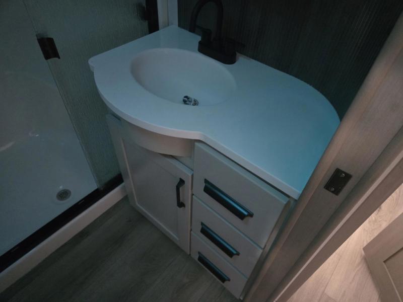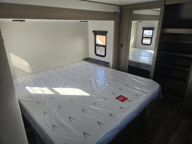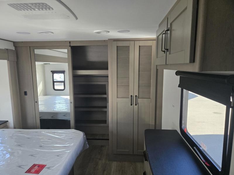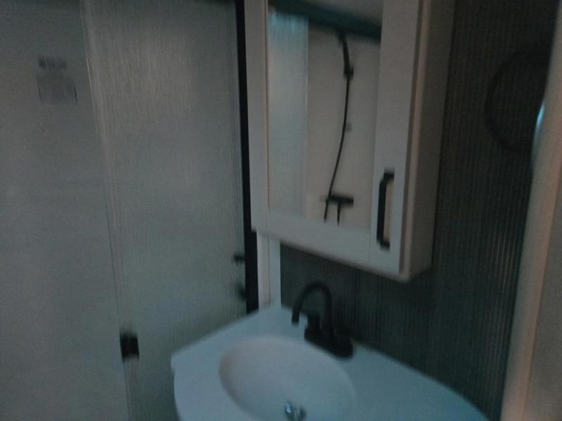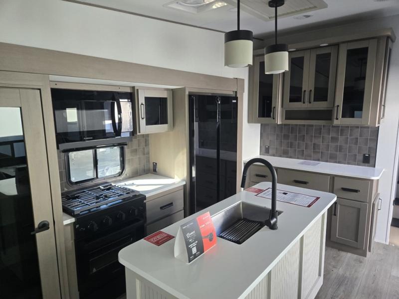 You can enjoy a spacious rear living area in this RV with dual opposing slides offering you entertainment, kitchen amenities, seating and windows for great views! The rear tri-fold sofa also converts into extra sleeping space for an extra guest or two, just like the booth dinette does. Yet you might like to add the swivel dinette option. There are theater seats to enjoy while you place your drinks in the cupholders and watch the entertainment center with a 40" LED HDTV and fireplace. The pantry is big enough to store your favorite snacks, and the kitchen island will make meal prepping easier, plus there is a 16 cu. ft. refrigerator to store any leftovers. The full bathroom has a 30" x 48" fiberglass shower and a linen closet to store your towels. The front private bedroom has a comfortable queen bed slide that can be switched out for the optional king bed, a dresser with overhead cabinets, and a full wall wardrobe that is prepped to add the optional washer and dryer so that you can extend your camping trip with clean clothes!