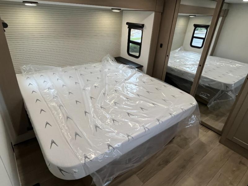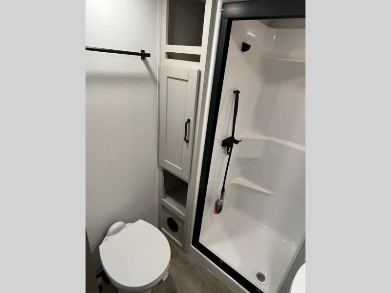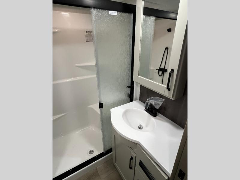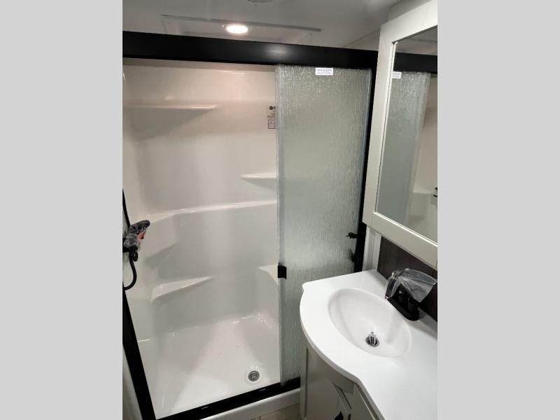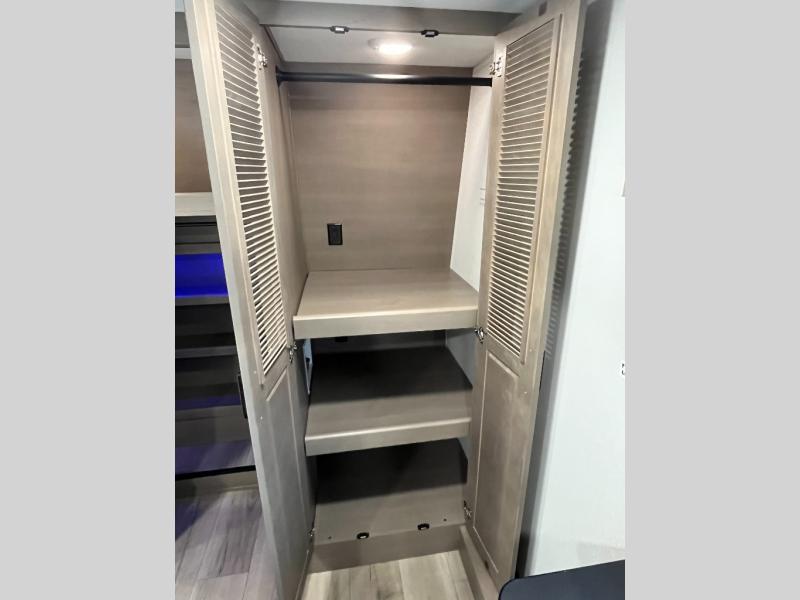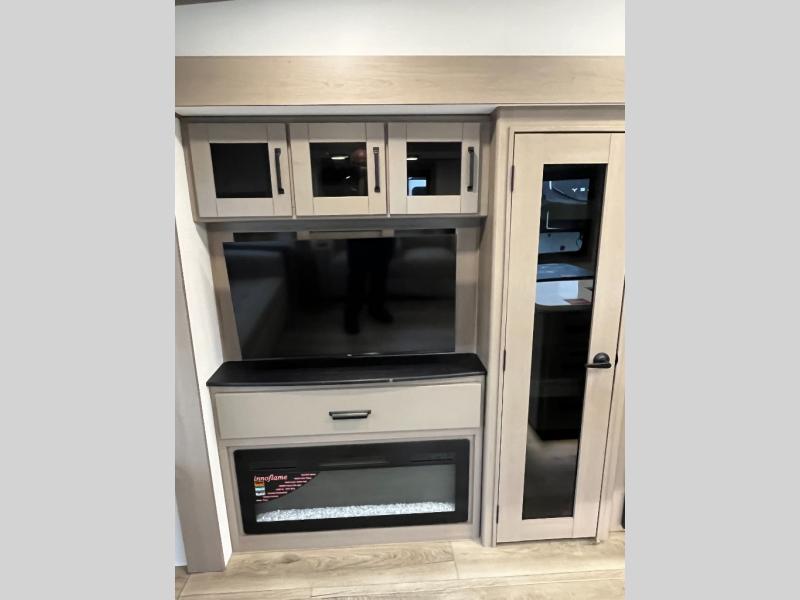 You can enjoy a spacious rear living area in this RV with dual opposing slides offering you entertainment, kitchen amenities, seating and windows for great views! The rear tri-fold sofa also converts into extra sleeping space for an extra guest or two, just like the booth dinette does. Yet you might like to add the swivel dinette option. There are theater seats to enjoy while you place your drinks in the cupholders and watch the entertainment center with a 40" LED HDTV and fireplace. The pantry is big enough to store your favorite snacks, and the kitchen island will make meal prepping easier, plus there is a 16 cu. ft. refrigerator to store any leftovers. The full bathroom has a 30" x 48" fiberglass shower and a linen closet to store your towels. The front private bedroom has a comfortable queen bed slide that can be switched out for the optional king bed, a dresser with overhead cabinets, and a full wall wardrobe that is prepped to add the optional washer and dryer so that you can extend your camping trip with clean clothes!