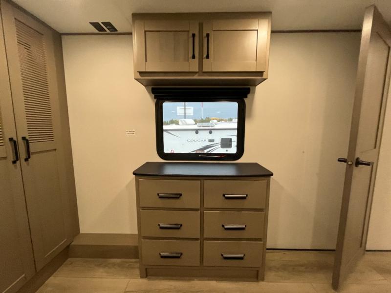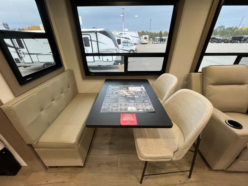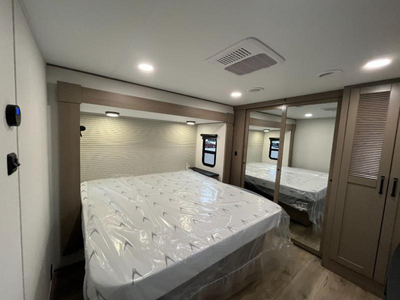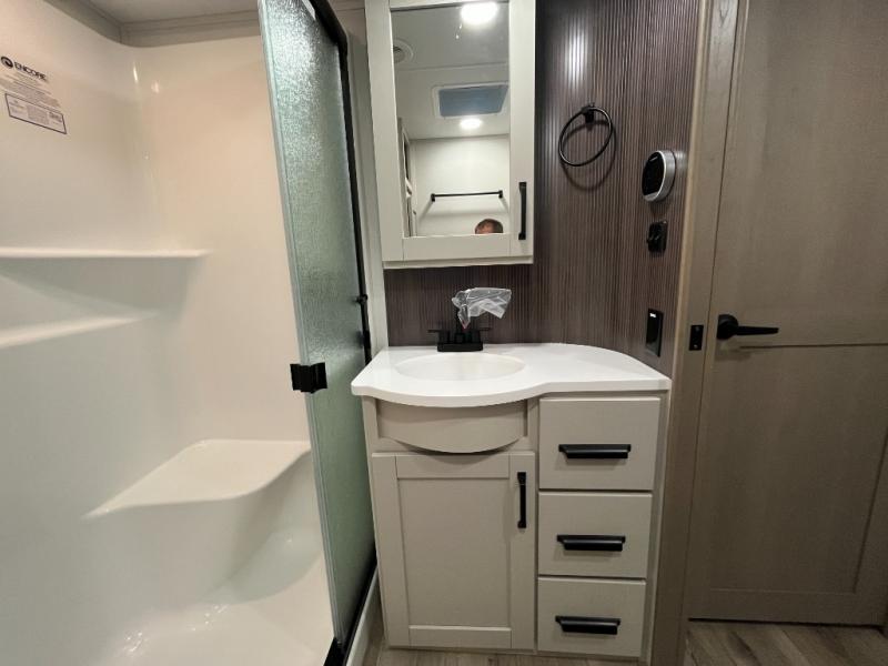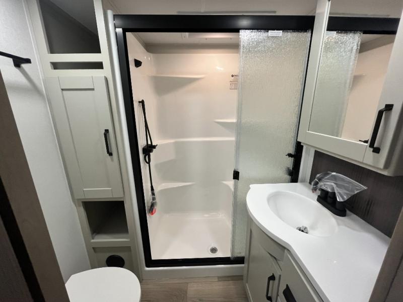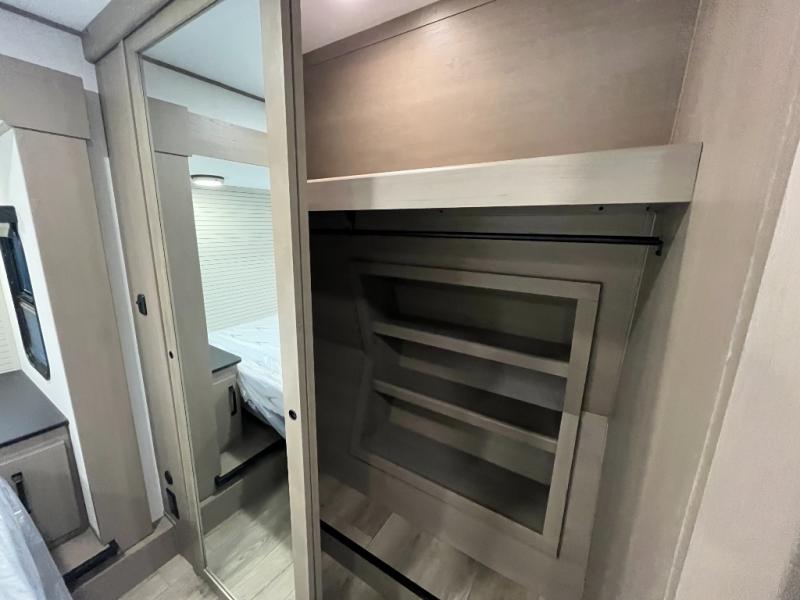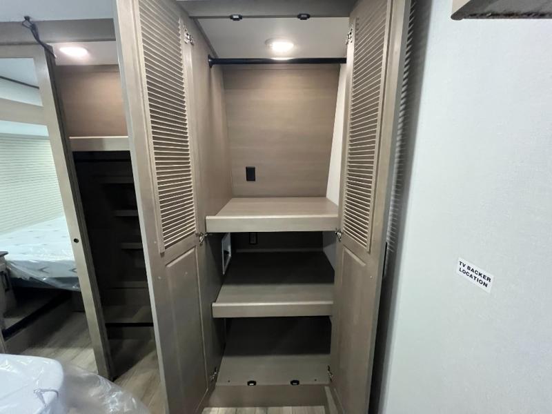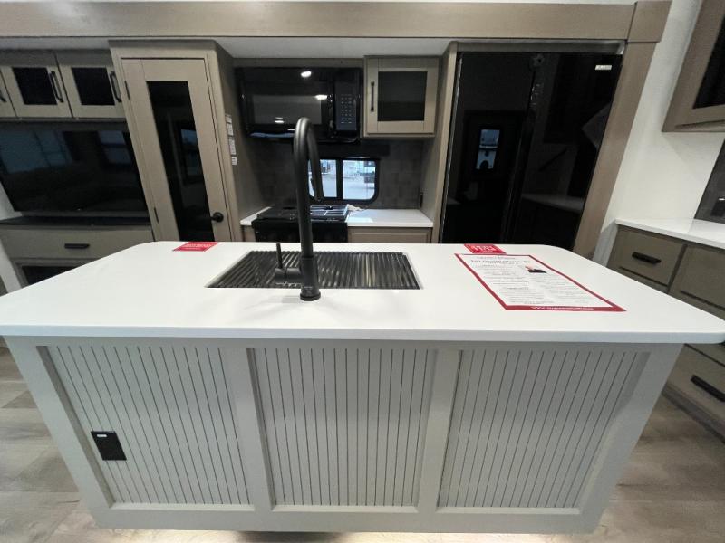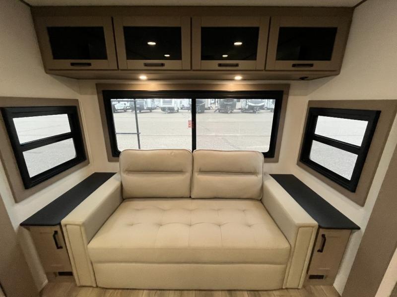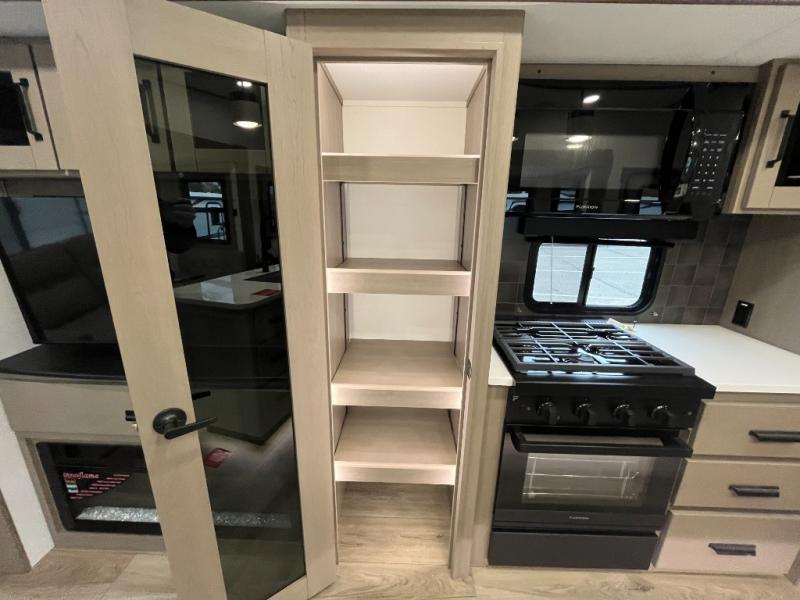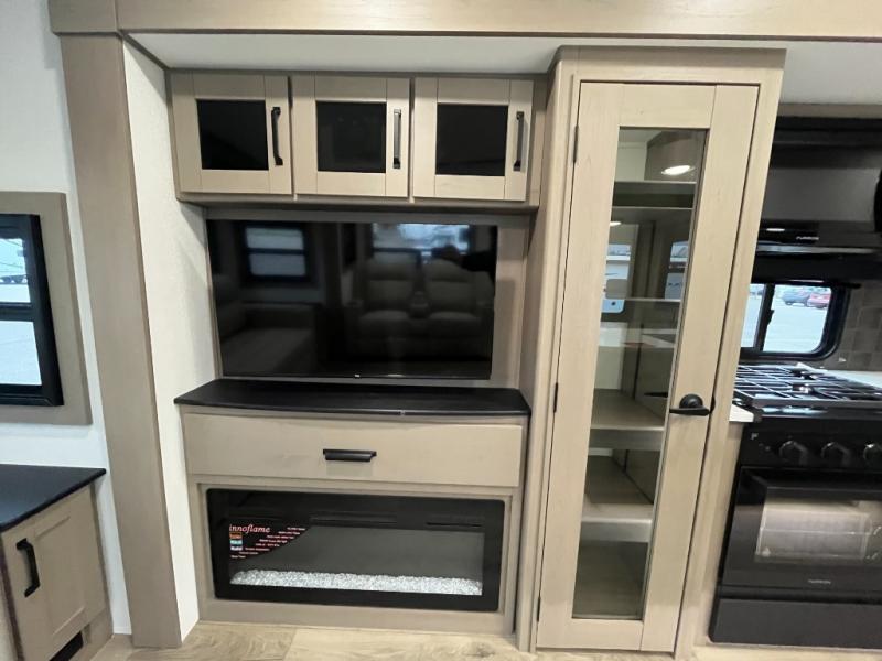 You can enjoy a spacious rear living area in this RV with dual opposing slides offering you entertainment, kitchen amenities, seating and windows for great views! The rear tri-fold sofa also converts into extra sleeping space for an extra guest or two, just like the booth dinette does. Yet you might like to add the swivel dinette option. There are theater seats to enjoy while you place your drinks in the cupholders and watch the entertainment center with a 40" LED HDTV and fireplace. The pantry is big enough to store your favorite snacks, and the kitchen island will make meal prepping easier, plus there is a 16 cu. ft. refrigerator to store any leftovers. The full bathroom has a 30" x 48" fiberglass shower and a linen closet to store your towels. The front private bedroom has a comfortable queen bed slide that can be switched out for the optional king bed, a dresser with overhead cabinets, and a full wall wardrobe that is prepped to add the optional washer and dryer so that you can extend your camping trip with clean clothes!