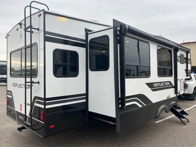 With any Reflection fifth wheel by Grand Design, you will have a solar panel for off-grid camping and a 60 amp charge controller and inverter prep, a Universal All-In-One docking station, unobstructed pass-through storage, and Goodyear Endurance tires. Each is constructed of gel coat exterior sidewalls, residential 5" truss rafters, walk-on roof decking, a fiberglass and radiant foil roof and front cap insulation plus laminated aluminum framed side walls, roof and end walls in slide rooms. Head inside to enjoy residential hardwood cabinet doors, premium Congoleum flooring, a spacious shower with a glass door, and many more comforts!