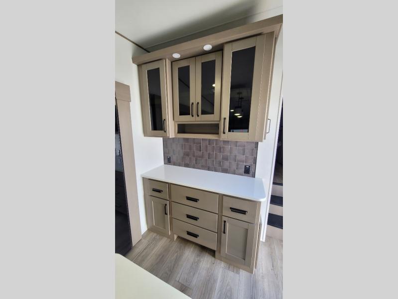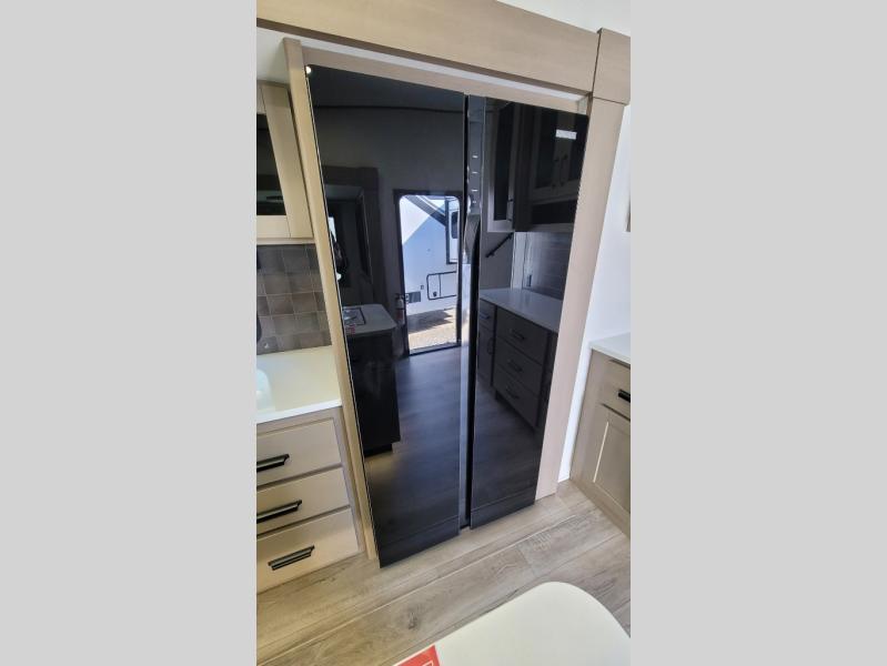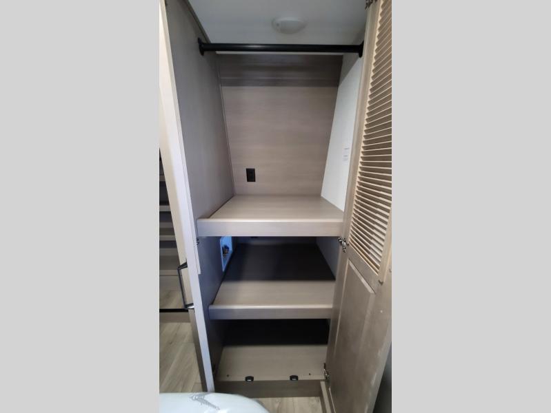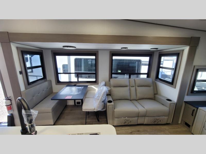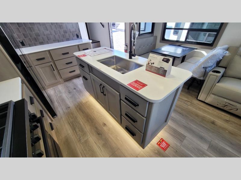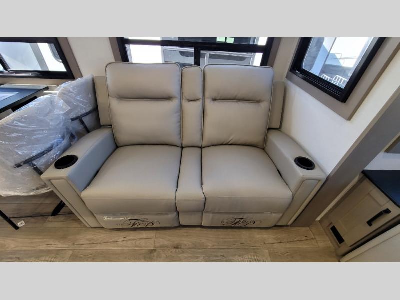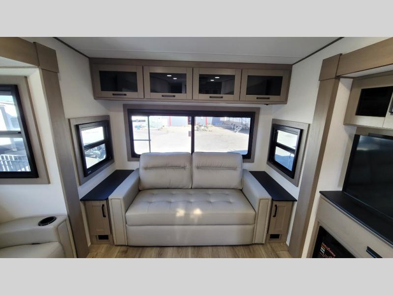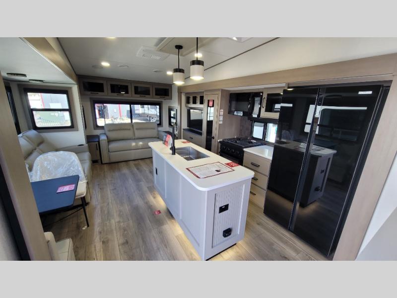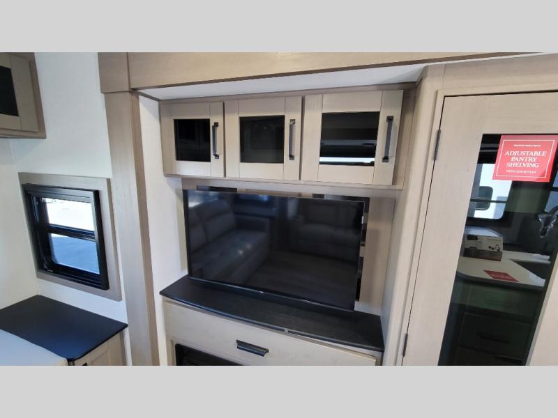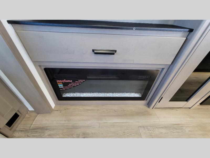 You can enjoy a spacious rear living area in this RV with dual opposing slides offering you entertainment, kitchen amenities, seating and windows for great views! The rear tri-fold sofa also converts into extra sleeping space for an extra guest or two, just like the booth dinette does. Yet you might like to add the swivel dinette option. There are theater seats to enjoy while you place your drinks in the cupholders and watch the entertainment center with a 40" LED HDTV and fireplace. The pantry is big enough to store your favorite snacks, and the kitchen island will make meal prepping easier, plus there is a 16 cu. ft. refrigerator to store any leftovers. The full bathroom has a 30" x 48" fiberglass shower and a linen closet to store your towels. The front private bedroom has a comfortable queen bed slide that can be switched out for the optional king bed, a dresser with overhead cabinets, and a full wall wardrobe that is prepped to add the optional washer and dryer so that you can extend your camping trip with clean clothes!