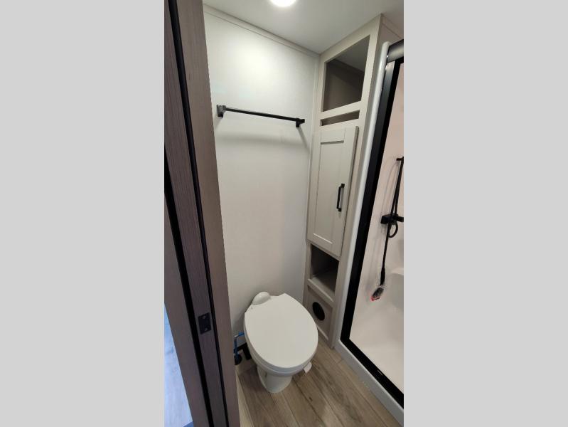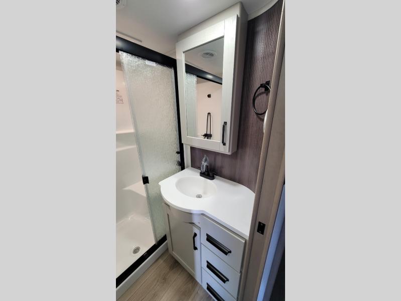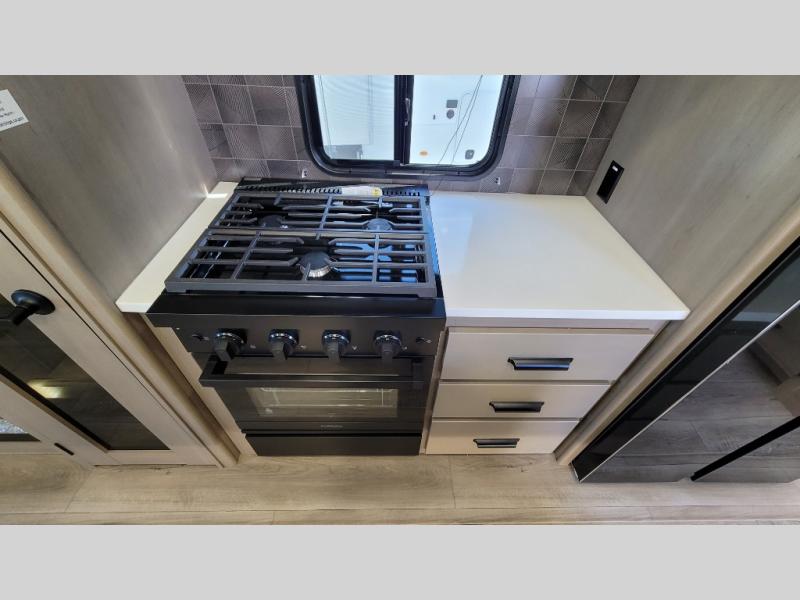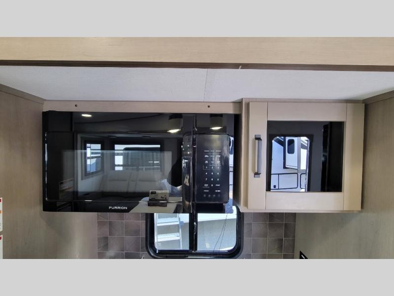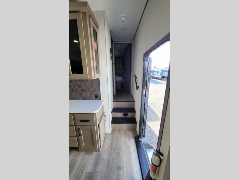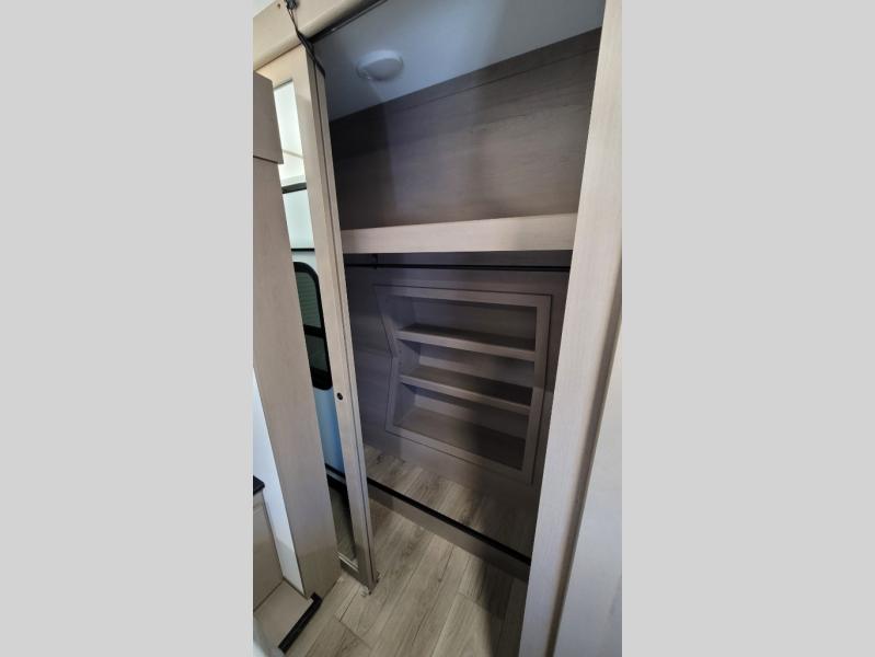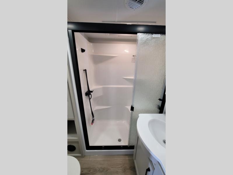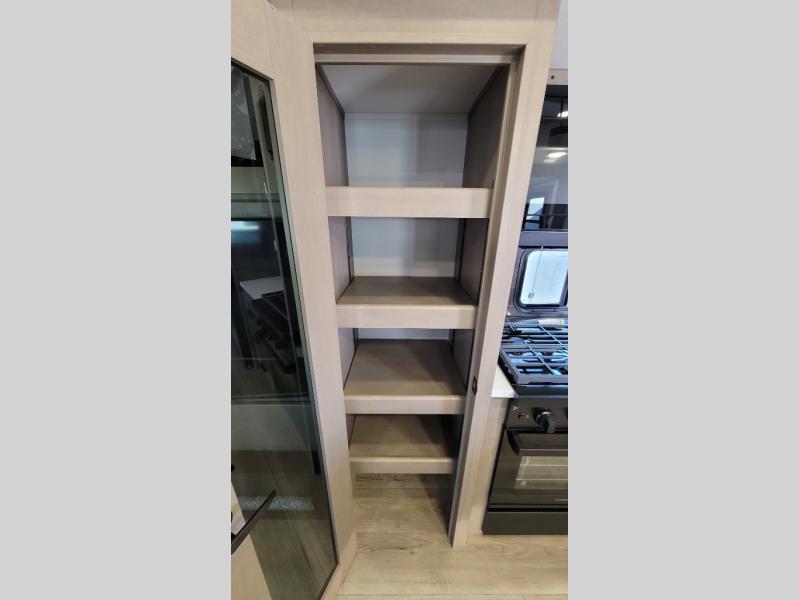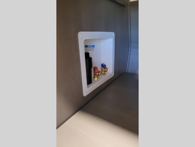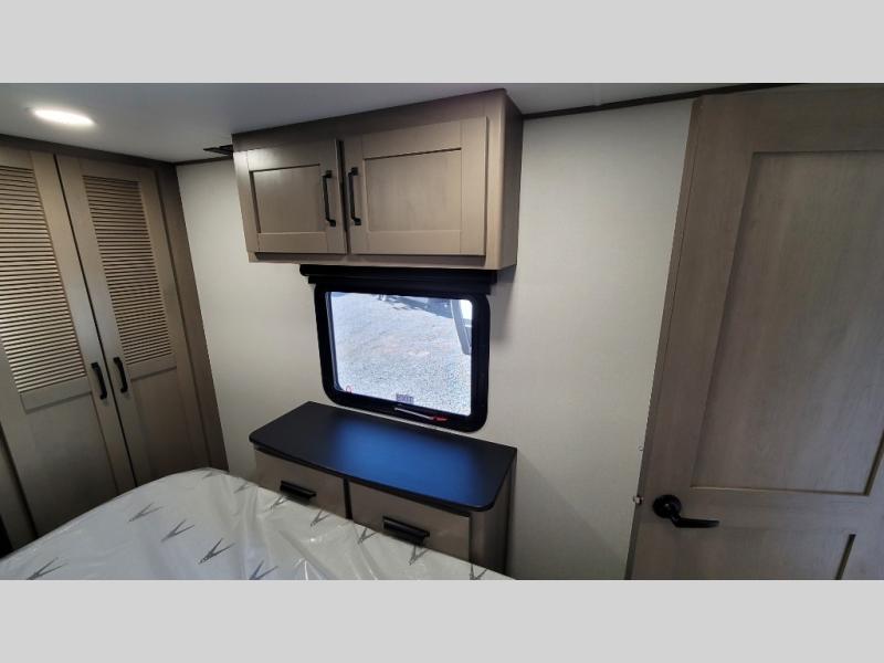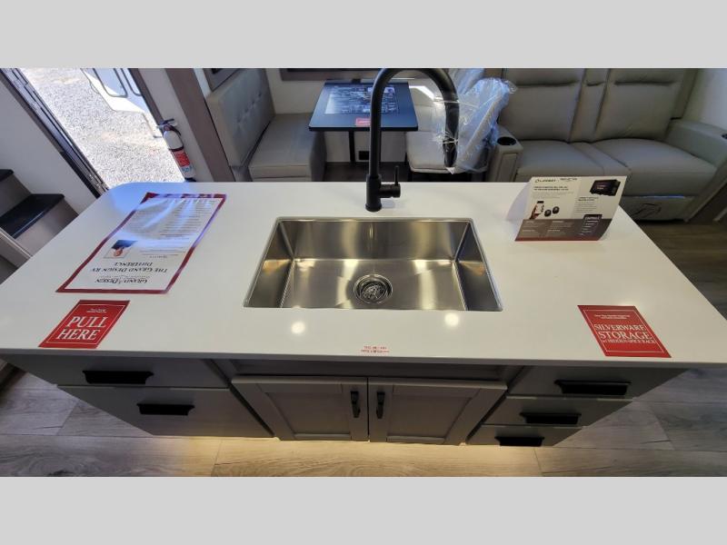 You can enjoy a spacious rear living area in this RV with dual opposing slides offering you entertainment, kitchen amenities, seating and windows for great views! The rear tri-fold sofa also converts into extra sleeping space for an extra guest or two, just like the booth dinette does. Yet you might like to add the swivel dinette option. There are theater seats to enjoy while you place your drinks in the cupholders and watch the entertainment center with a 40" LED HDTV and fireplace. The pantry is big enough to store your favorite snacks, and the kitchen island will make meal prepping easier, plus there is a 16 cu. ft. refrigerator to store any leftovers. The full bathroom has a 30" x 48" fiberglass shower and a linen closet to store your towels. The front private bedroom has a comfortable queen bed slide that can be switched out for the optional king bed, a dresser with overhead cabinets, and a full wall wardrobe that is prepped to add the optional washer and dryer so that you can extend your camping trip with clean clothes!