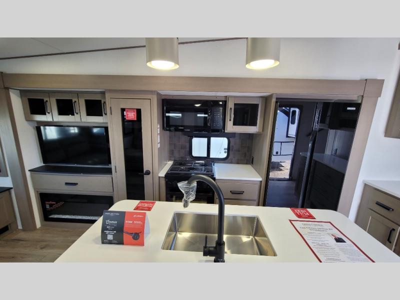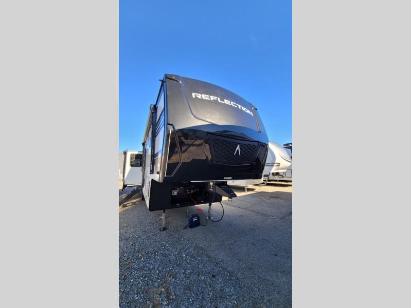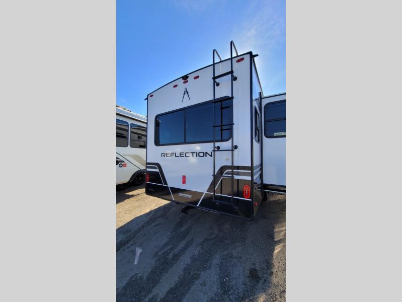 With any Reflection fifth wheel by Grand Design, you will have a solar panel for off-grid camping and a 60 amp charge controller and inverter prep, a Universal All-In-One docking station, unobstructed pass-through storage, and Goodyear Endurance tires. Each is constructed of gel coat exterior sidewalls, residential 5" truss rafters, walk-on roof decking, a fiberglass and radiant foil roof and front cap insulation plus laminated aluminum framed side walls, roof and end walls in slide rooms. Head inside to enjoy residential hardwood cabinet doors, premium Congoleum flooring, a spacious shower with a glass door, and many more comforts!