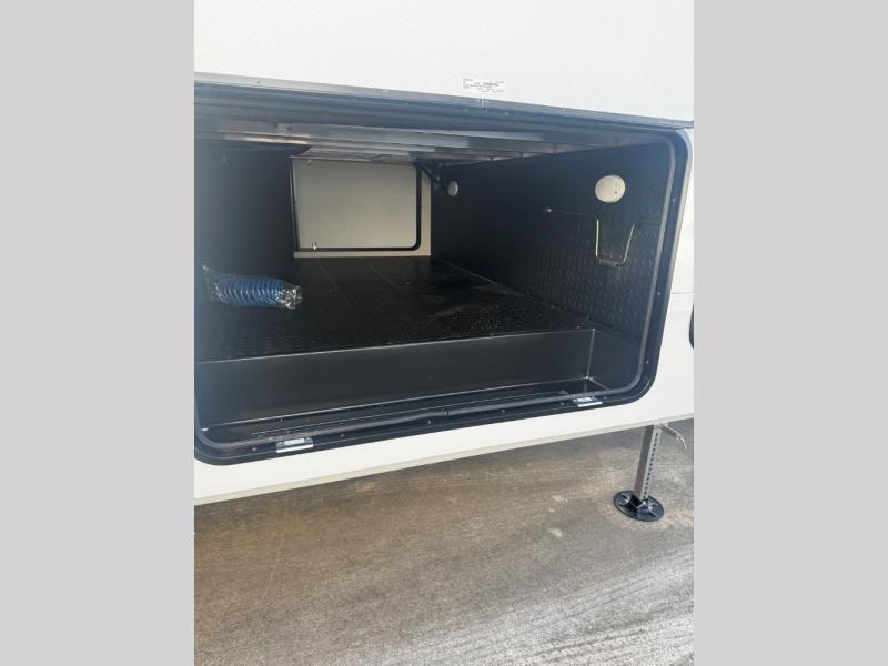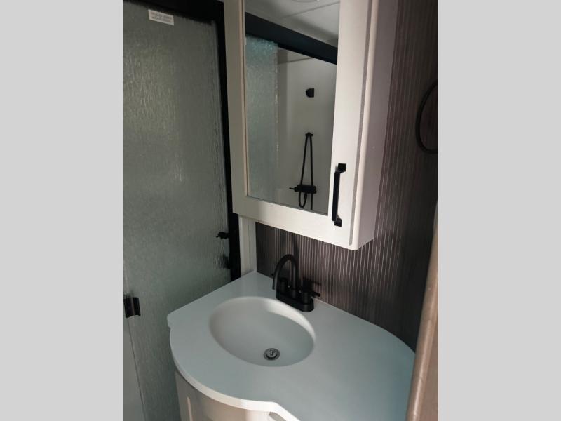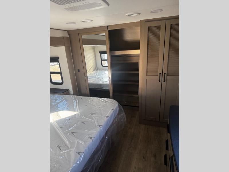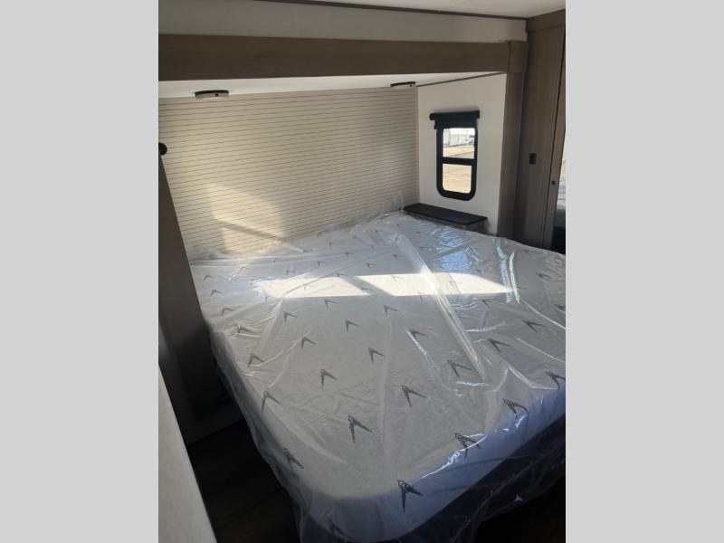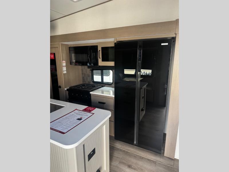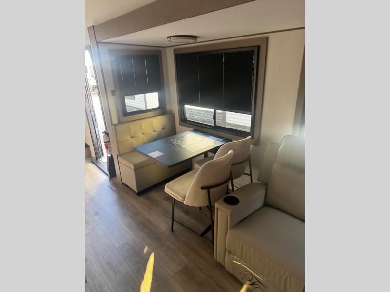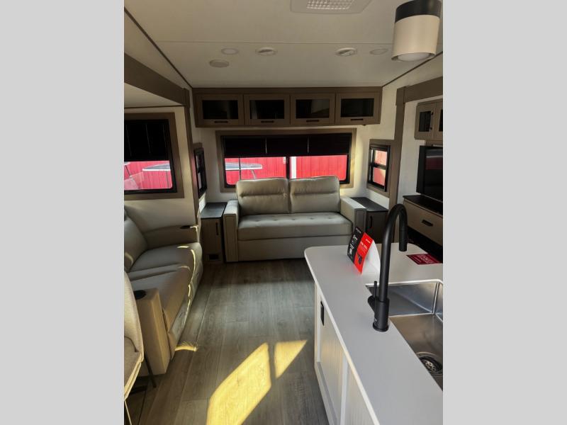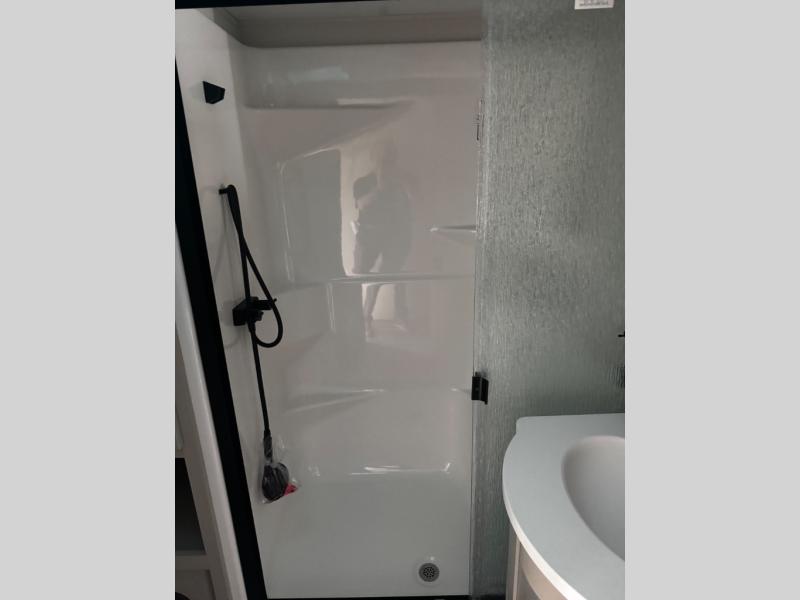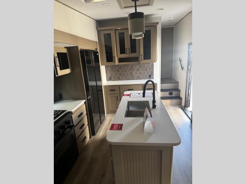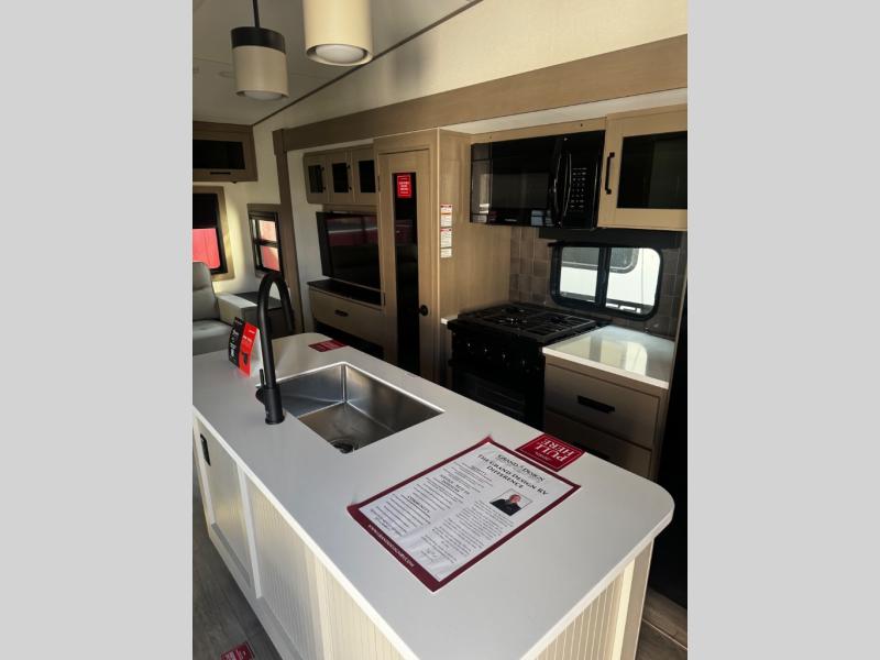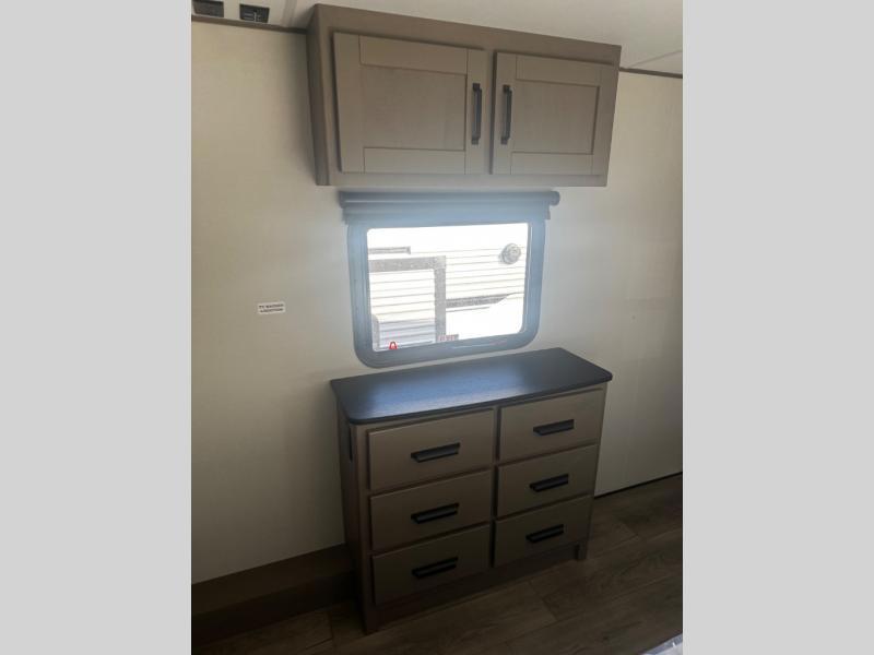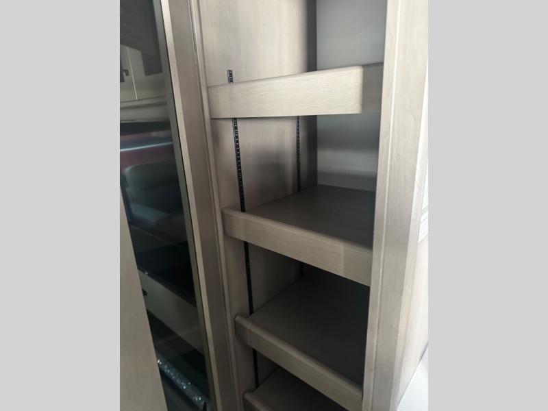You can enjoy a spacious rear living area in this RV with dual opposing slides offering you entertainment, kitchen amenities, seating and windows for great views! The rear tri-fold sofa also converts into extra sleeping space for an extra guest or two, just like the booth dinette does. Yet you might like to add the swivel dinette option. There are theater seats to enjoy while you place your drinks in the cupholders and watch the entertainment center with a 40" LED HDTV and fireplace. The pantry is big enough to store your favorite snacks, and the kitchen island will make meal prepping easier, plus there is a 16 cu. ft. refrigerator to store any leftovers. The full bathroom has a 30" x 48" fiberglass shower and a linen closet to store your towels. The front private bedroom has a comfortable queen bed slide that can be switched out for the optional king bed, a dresser with overhead cabinets, and a full wall wardrobe that is prepped to add the optional washer and dryer so that you can extend your camping trip with clean clothes!