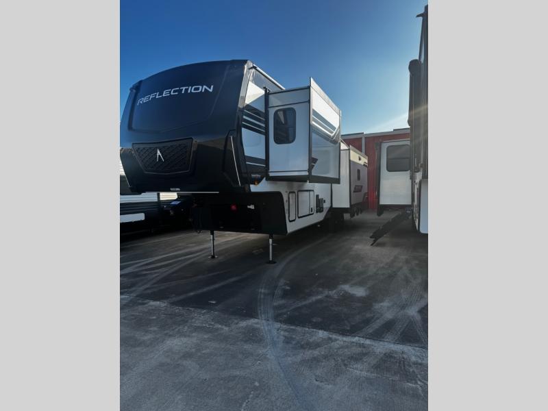 With any Reflection fifth wheel by Grand Design, you will have a solar panel for off-grid camping and a 60 amp charge controller and inverter prep, a Universal All-In-One docking station, unobstructed pass-through storage, and Goodyear Endurance tires. Each is constructed of gel coat exterior sidewalls, residential 5" truss rafters, walk-on roof decking, a fiberglass and radiant foil roof and front cap insulation plus laminated aluminum framed side walls, roof and end walls in slide rooms. Head inside to enjoy residential hardwood cabinet doors, premium Congoleum flooring, a spacious shower with a glass door, and many more comforts!