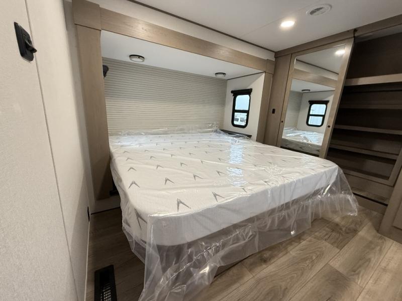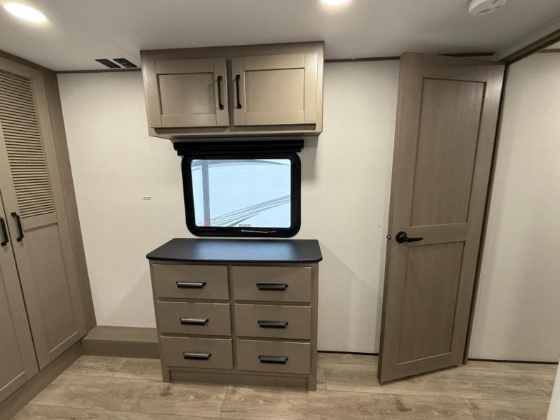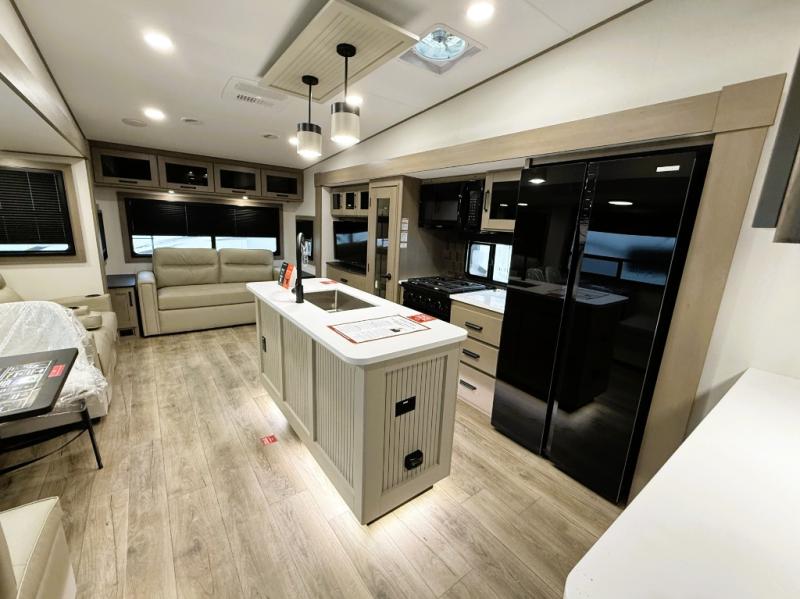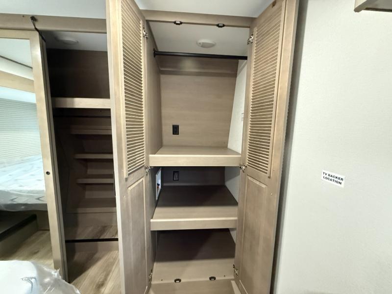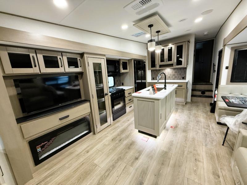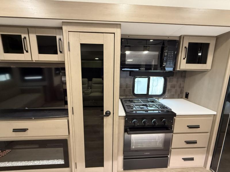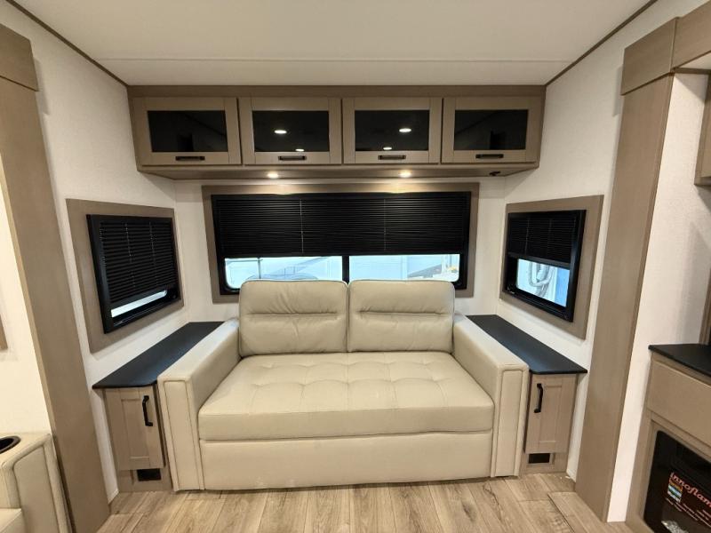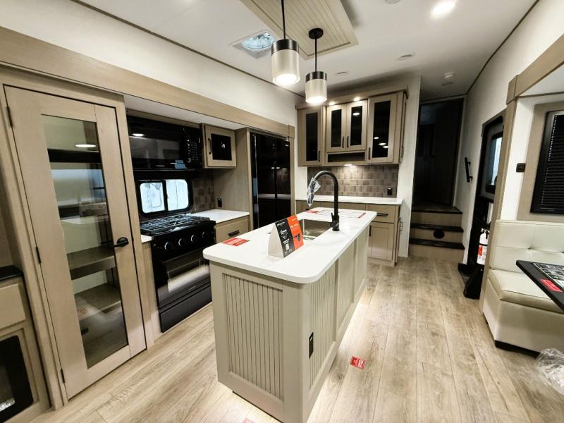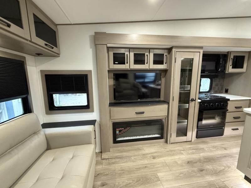 You can enjoy a spacious rear living area in this RV with dual opposing slides offering you entertainment, kitchen amenities, seating and windows for great views! The rear tri-fold sofa also converts into extra sleeping space for an extra guest or two, just like the booth dinette does. Yet you might like to add the swivel dinette option. There are theater seats to enjoy while you place your drinks in the cupholders and watch the entertainment center with a 40" LED HDTV and fireplace. The pantry is big enough to store your favorite snacks, and the kitchen island will make meal prepping easier, plus there is a 16 cu. ft. refrigerator to store any leftovers. The full bathroom has a 30" x 48" fiberglass shower and a linen closet to store your towels. The front private bedroom has a comfortable queen bed slide that can be switched out for the optional king bed, a dresser with overhead cabinets, and a full wall wardrobe that is prepped to add the optional washer and dryer so that you can extend your camping trip with clean clothes!