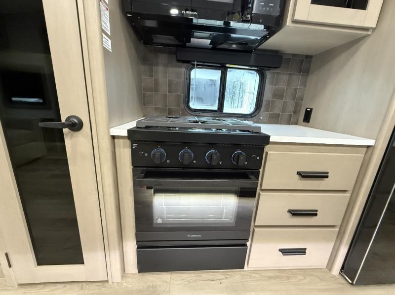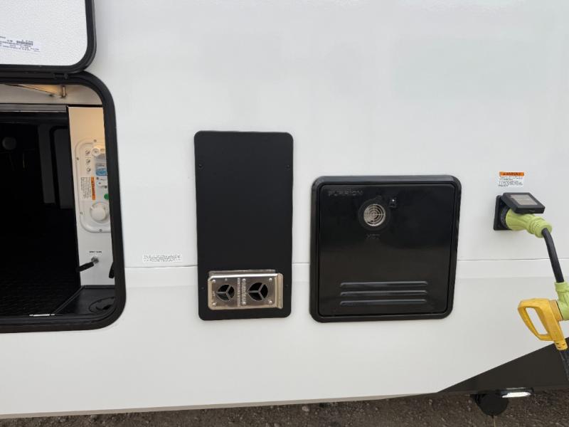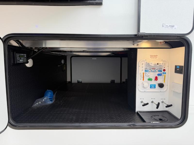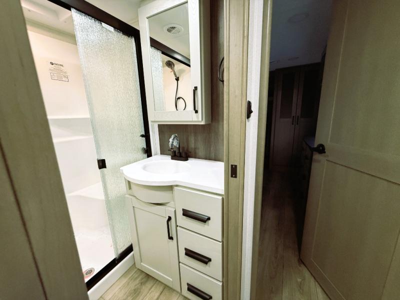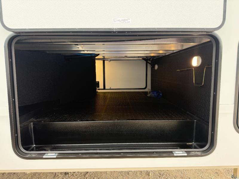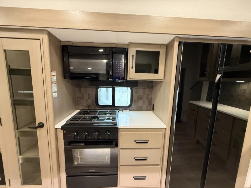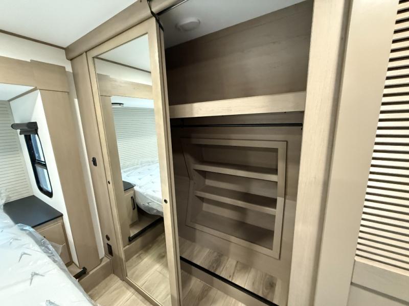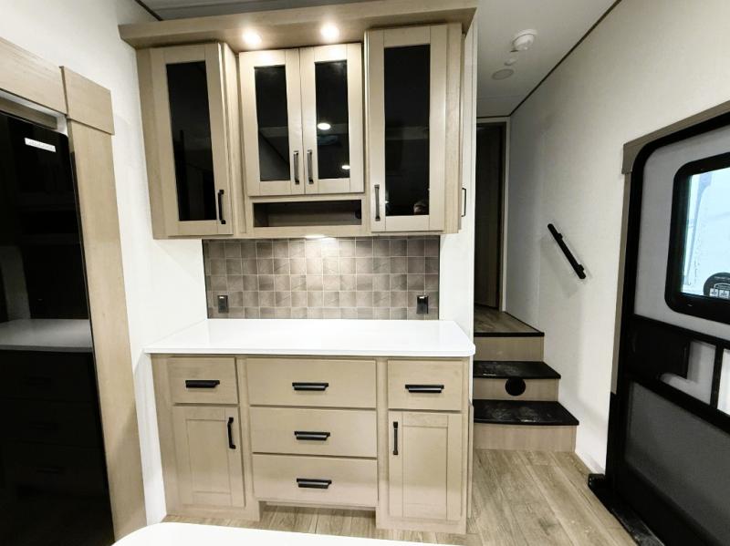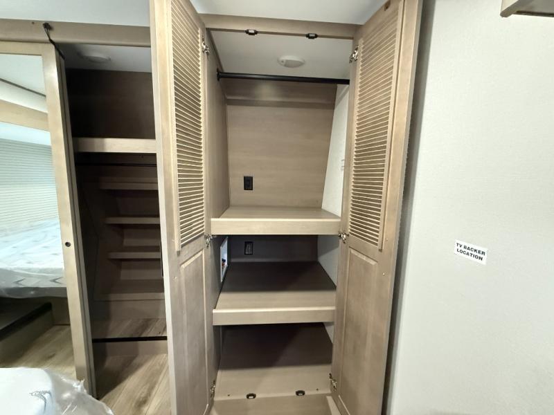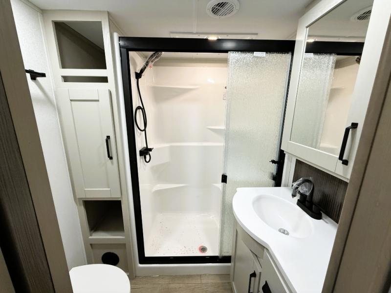 You can enjoy a spacious rear living area in this RV with dual opposing slides offering you entertainment, kitchen amenities, seating and windows for great views! The rear tri-fold sofa also converts into extra sleeping space for an extra guest or two, just like the booth dinette does. Yet you might like to add the swivel dinette option. There are theater seats to enjoy while you place your drinks in the cupholders and watch the entertainment center with a 40" LED HDTV and fireplace. The pantry is big enough to store your favorite snacks, and the kitchen island will make meal prepping easier, plus there is a 16 cu. ft. refrigerator to store any leftovers. The full bathroom has a 30" x 48" fiberglass shower and a linen closet to store your towels. The front private bedroom has a comfortable queen bed slide that can be switched out for the optional king bed, a dresser with overhead cabinets, and a full wall wardrobe that is prepped to add the optional washer and dryer so that you can extend your camping trip with clean clothes!