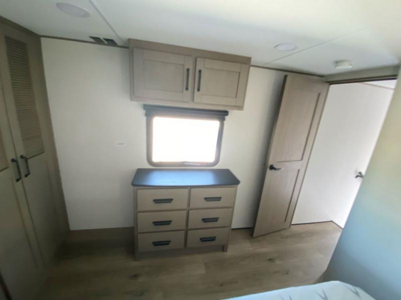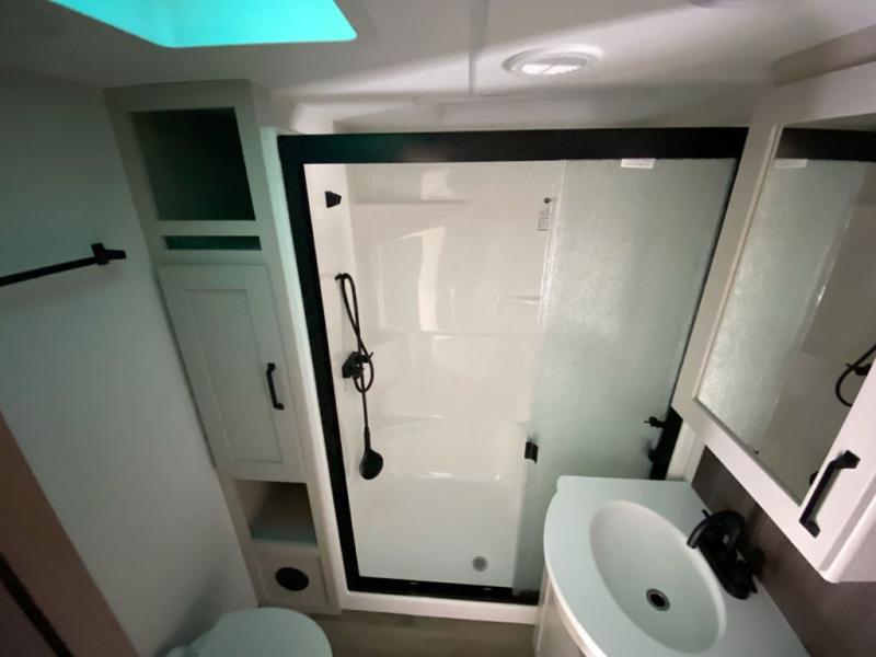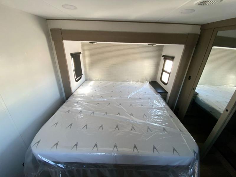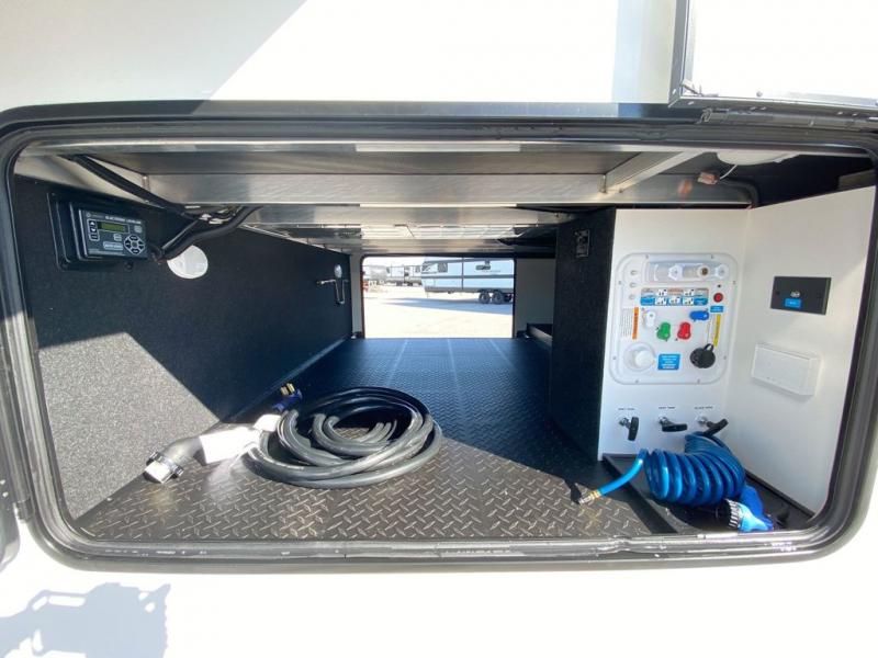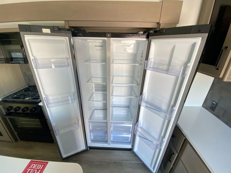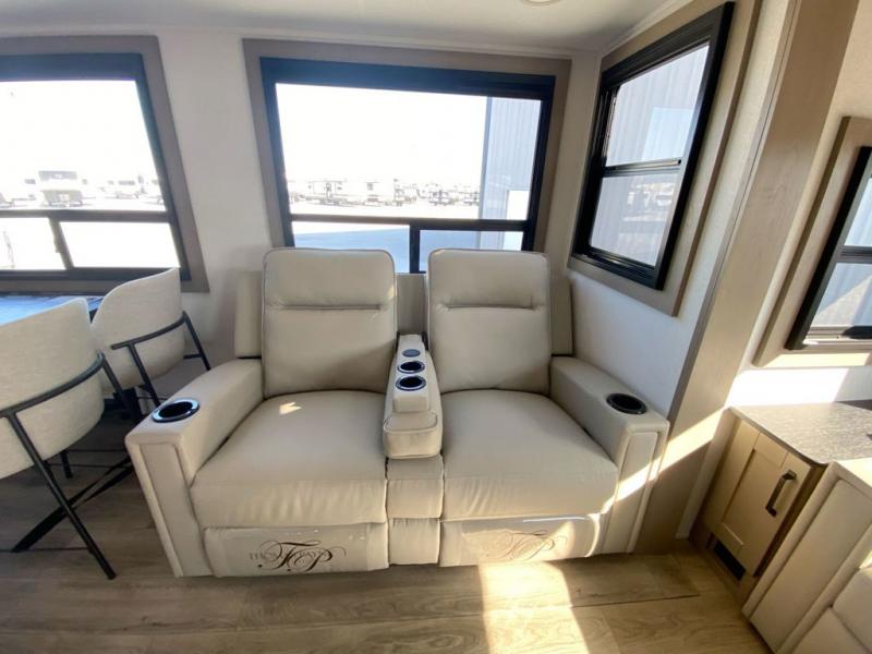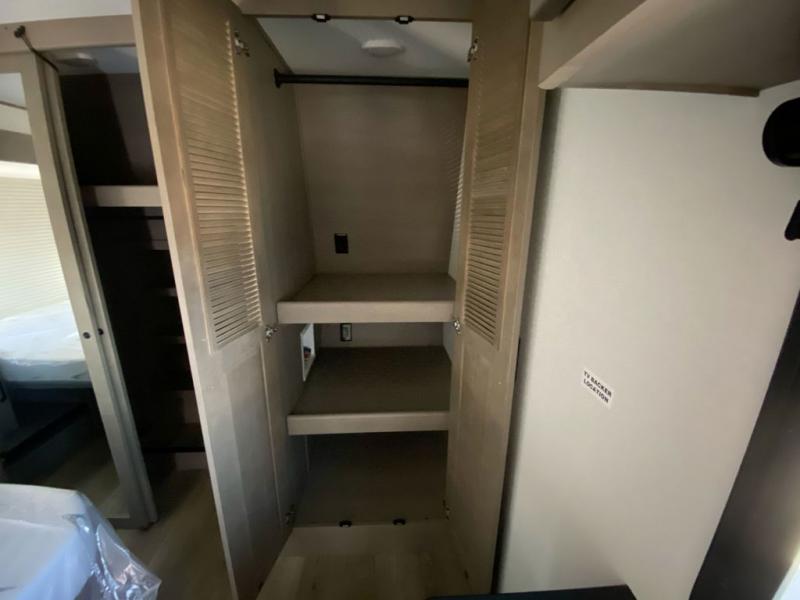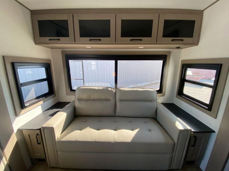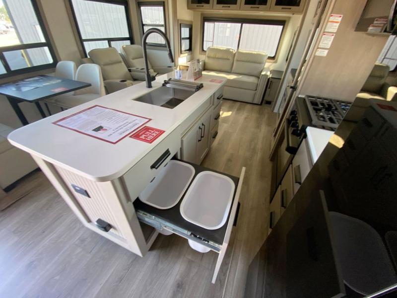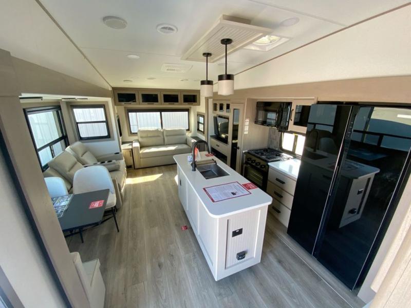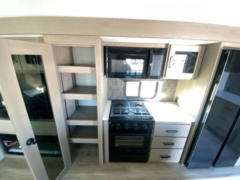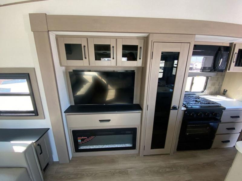 You can enjoy a spacious rear living area in this RV with dual opposing slides offering you entertainment, kitchen amenities, seating and windows for great views! The rear tri-fold sofa also converts into extra sleeping space for an extra guest or two, just like the booth dinette does. Yet you might like to add the swivel dinette option. There are theater seats to enjoy while you place your drinks in the cupholders and watch the entertainment center with a 40" LED HDTV and fireplace. The pantry is big enough to store your favorite snacks, and the kitchen island will make meal prepping easier, plus there is a 16 cu. ft. refrigerator to store any leftovers. The full bathroom has a 30" x 48" fiberglass shower and a linen closet to store your towels. The front private bedroom has a comfortable queen bed slide that can be switched out for the optional king bed, a dresser with overhead cabinets, and a full wall wardrobe that is prepped to add the optional washer and dryer so that you can extend your camping trip with clean clothes!