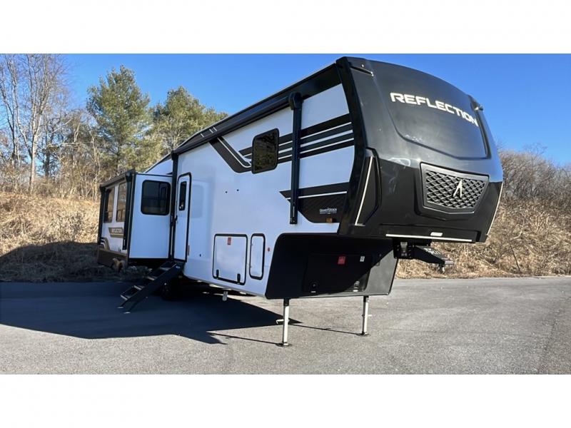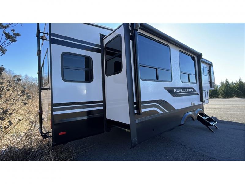 With any Reflection fifth wheel by Grand Design, you will have a solar panel for off-grid camping and a 60 amp charge controller and inverter prep, a Universal All-In-One docking station, unobstructed pass-through storage, and Goodyear Endurance tires. Each is constructed of gel coat exterior sidewalls, residential 5" truss rafters, walk-on roof decking, a fiberglass and radiant foil roof and front cap insulation plus laminated aluminum framed side walls, roof and end walls in slide rooms. Head inside to enjoy residential hardwood cabinet doors, premium Congoleum flooring, a spacious shower with a glass door, and many more comforts!