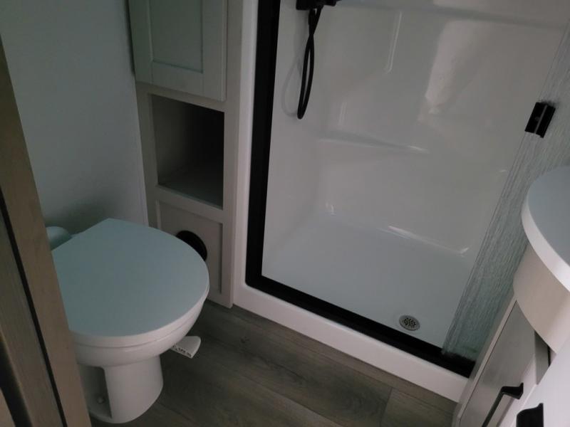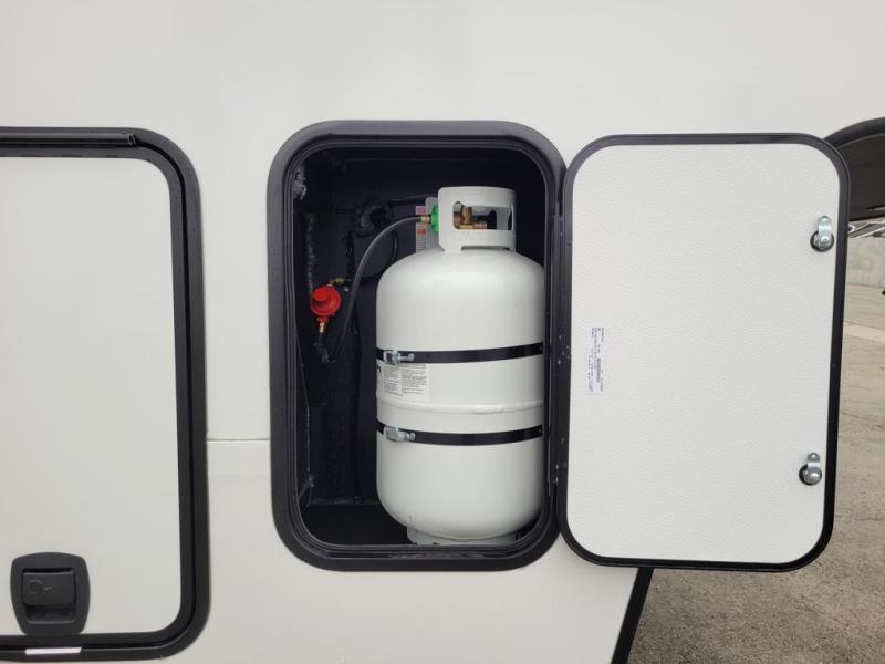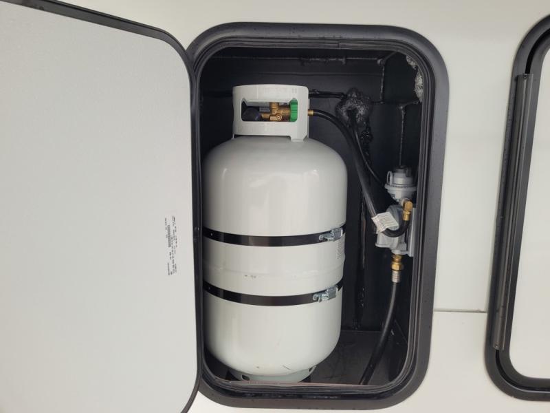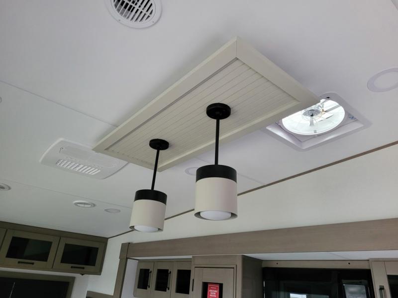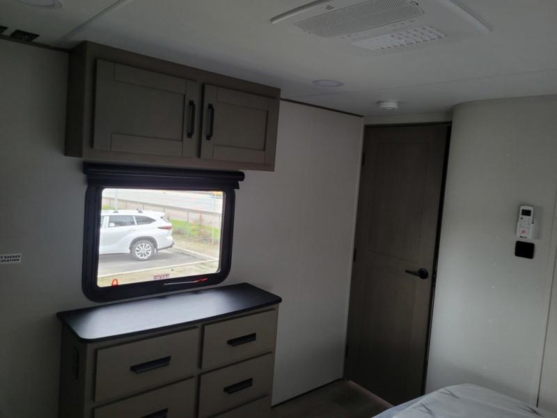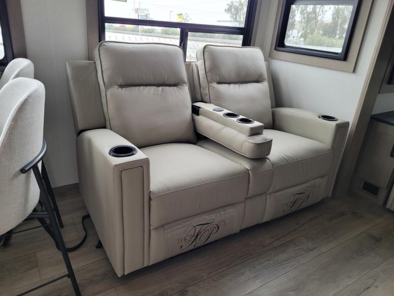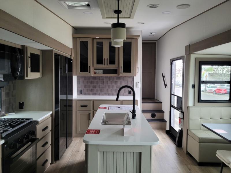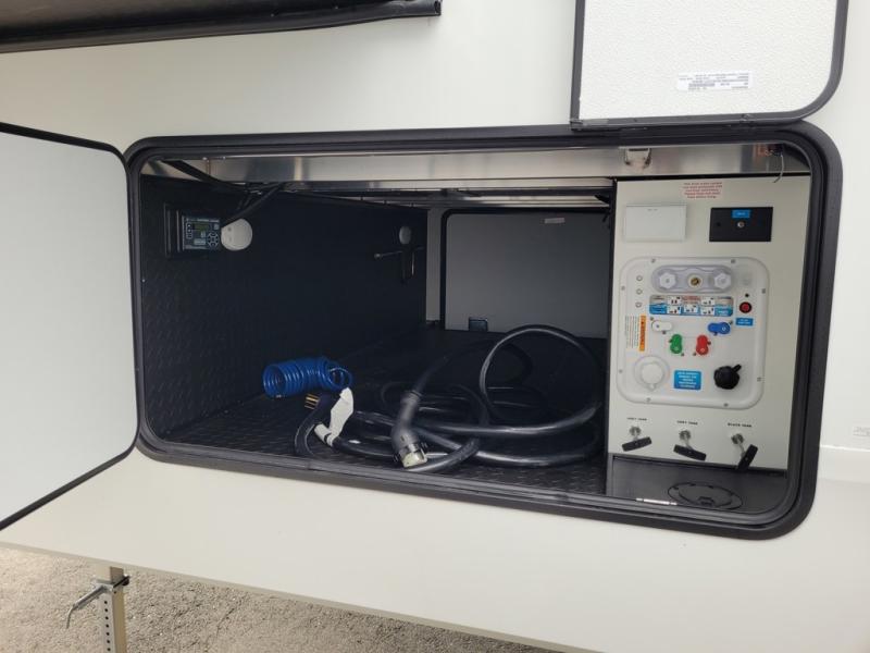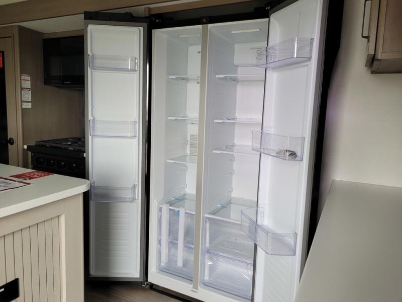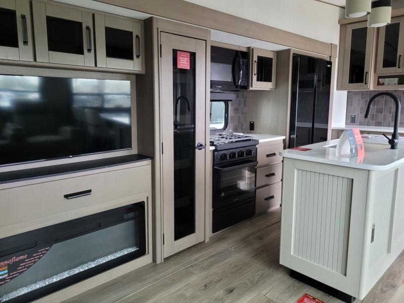 You can enjoy a spacious rear living area in this RV with dual opposing slides offering you entertainment, kitchen amenities, seating and windows for great views! The rear tri-fold sofa also converts into extra sleeping space for an extra guest or two, just like the booth dinette does. Yet you might like to add the swivel dinette option. There are theater seats to enjoy while you place your drinks in the cupholders and watch the entertainment center with a 40" LED HDTV and fireplace. The pantry is big enough to store your favorite snacks, and the kitchen island will make meal prepping easier, plus there is a 16 cu. ft. refrigerator to store any leftovers. The full bathroom has a 30" x 48" fiberglass shower and a linen closet to store your towels. The front private bedroom has a comfortable queen bed slide that can be switched out for the optional king bed, a dresser with overhead cabinets, and a full wall wardrobe that is prepped to add the optional washer and dryer so that you can extend your camping trip with clean clothes!