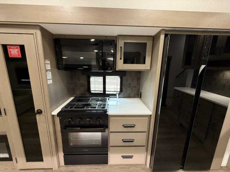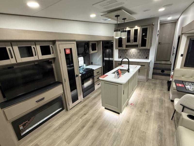 You can enjoy a spacious rear living area in this RV with dual opposing slides offering you entertainment, kitchen amenities, seating and windows for great views! The rear tri-fold sofa also converts into extra sleeping space for an extra guest or two, just like the booth dinette does. Yet you might like to add the swivel dinette option. There are theater seats to enjoy while you place your drinks in the cupholders and watch the entertainment center with a 40" LED HDTV and fireplace. The pantry is big enough to store your favorite snacks, and the kitchen island will make meal prepping easier, plus there is a 16 cu. ft. refrigerator to store any leftovers. The full bathroom has a 30" x 48" fiberglass shower and a linen closet to store your towels. The front private bedroom has a comfortable queen bed slide that can be switched out for the optional king bed, a dresser with overhead cabinets, and a full wall wardrobe that is prepped to add the optional washer and dryer so that you can extend your camping trip with clean clothes!