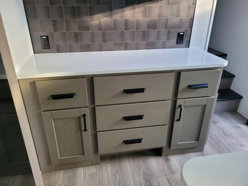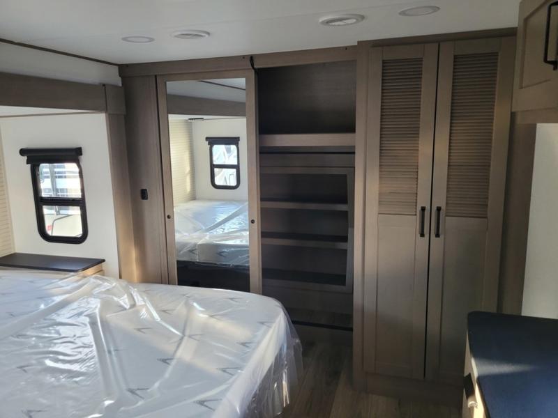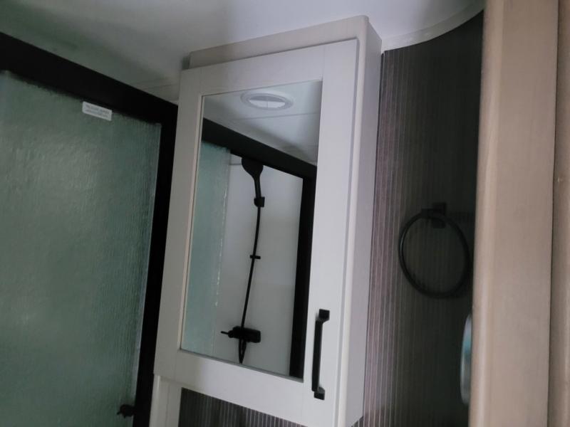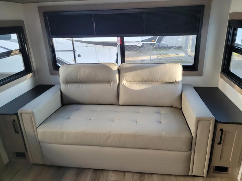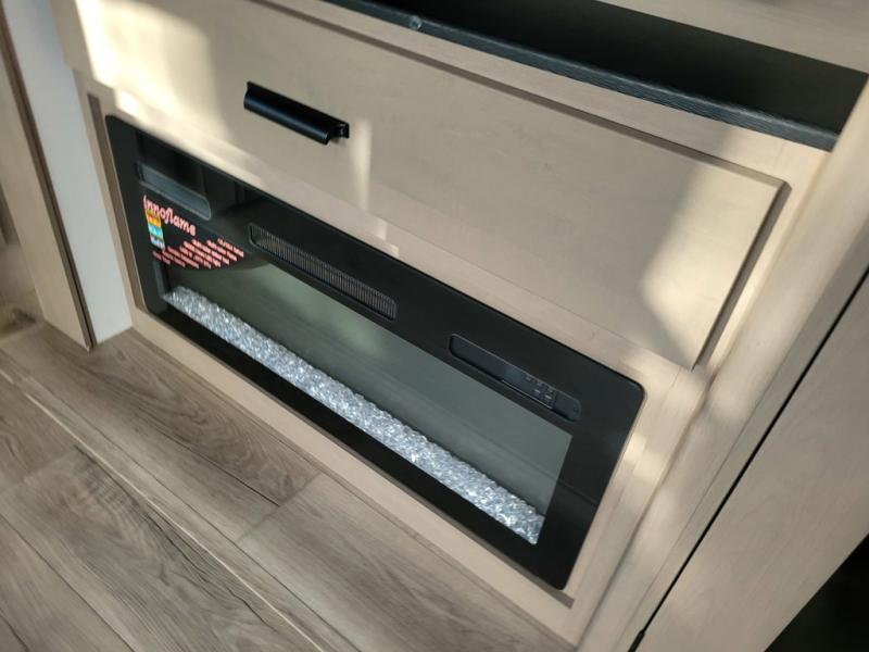 You can enjoy a spacious rear living area in this RV with dual opposing slides offering you entertainment, kitchen amenities, seating and windows for great views! The rear tri-fold sofa also converts into extra sleeping space for an extra guest or two, just like the booth dinette does. Yet you might like to add the swivel dinette option. There are theater seats to enjoy while you place your drinks in the cupholders and watch the entertainment center with a 40" LED HDTV and fireplace. The pantry is big enough to store your favorite snacks, and the kitchen island will make meal prepping easier, plus there is a 16 cu. ft. refrigerator to store any leftovers. The full bathroom has a 30" x 48" fiberglass shower and a linen closet to store your towels. The front private bedroom has a comfortable queen bed slide that can be switched out for the optional king bed, a dresser with overhead cabinets, and a full wall wardrobe that is prepped to add the optional washer and dryer so that you can extend your camping trip with clean clothes!