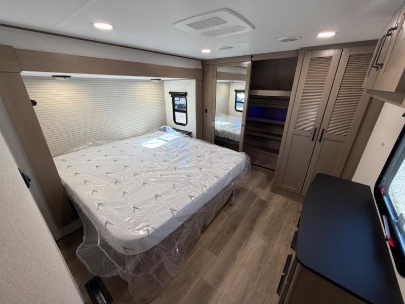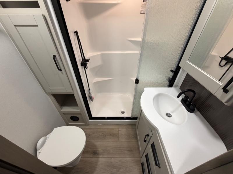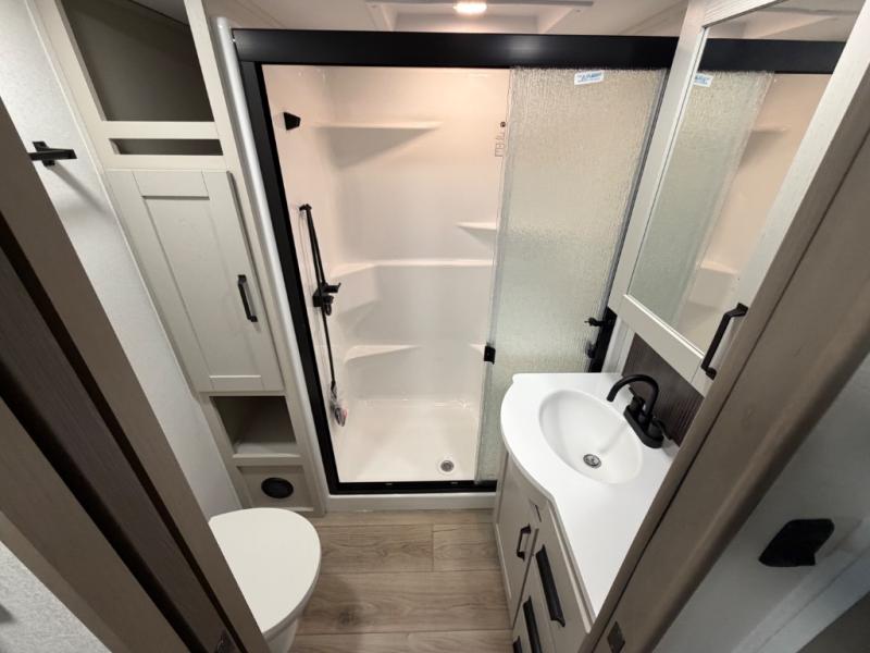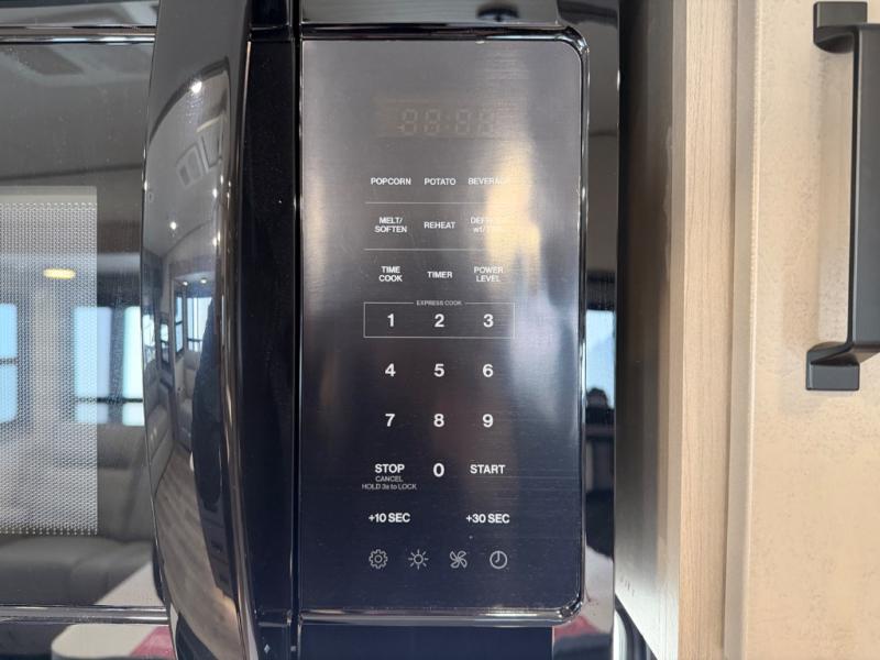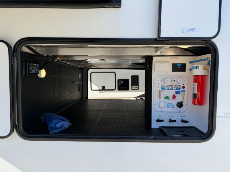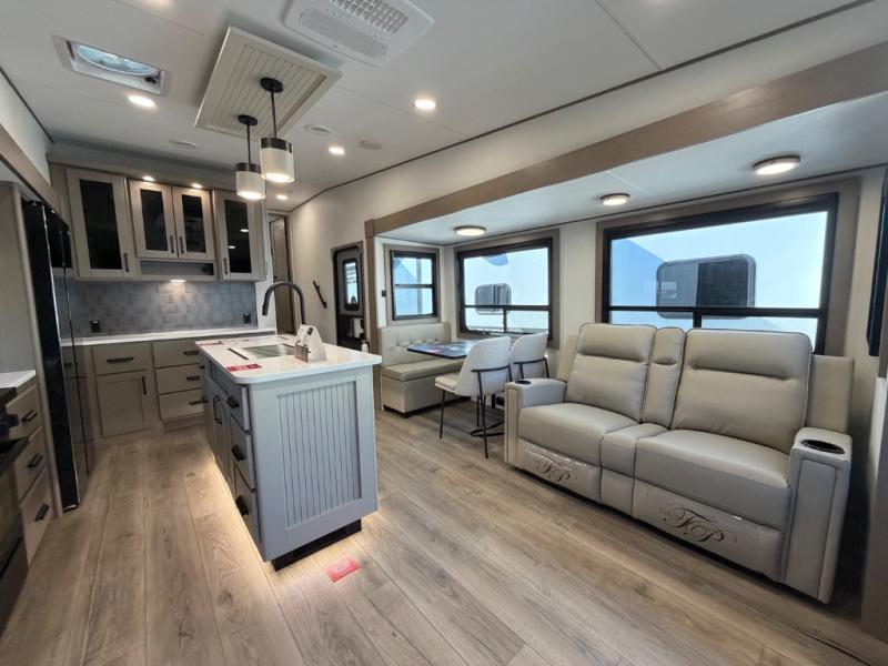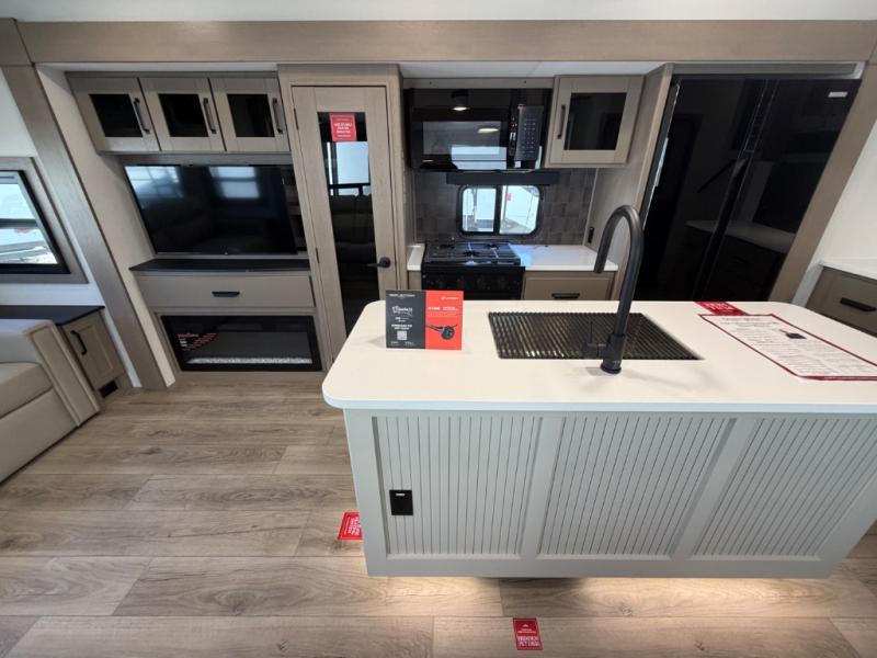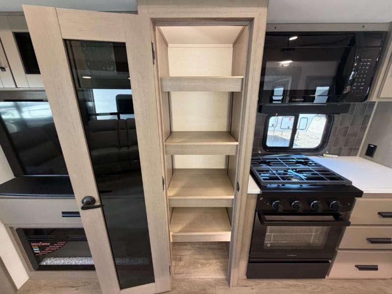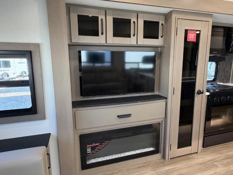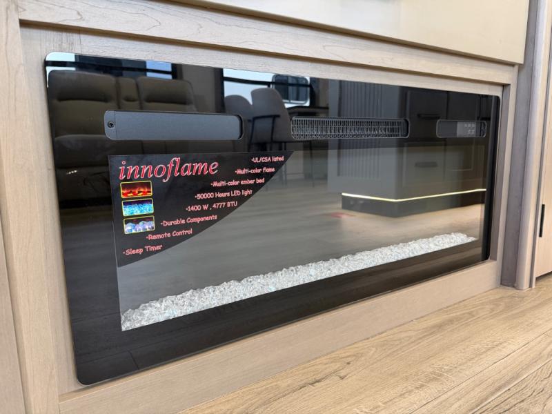 You can enjoy a spacious rear living area in this RV with dual opposing slides offering you entertainment, kitchen amenities, seating and windows for great views! The rear tri-fold sofa also converts into extra sleeping space for an extra guest or two, just like the booth dinette does. Yet you might like to add the swivel dinette option. There are theater seats to enjoy while you place your drinks in the cupholders and watch the entertainment center with a 40" LED HDTV and fireplace. The pantry is big enough to store your favorite snacks, and the kitchen island will make meal prepping easier, plus there is a 16 cu. ft. refrigerator to store any leftovers. The full bathroom has a 30" x 48" fiberglass shower and a linen closet to store your towels. The front private bedroom has a comfortable queen bed slide that can be switched out for the optional king bed, a dresser with overhead cabinets, and a full wall wardrobe that is prepped to add the optional washer and dryer so that you can extend your camping trip with clean clothes!