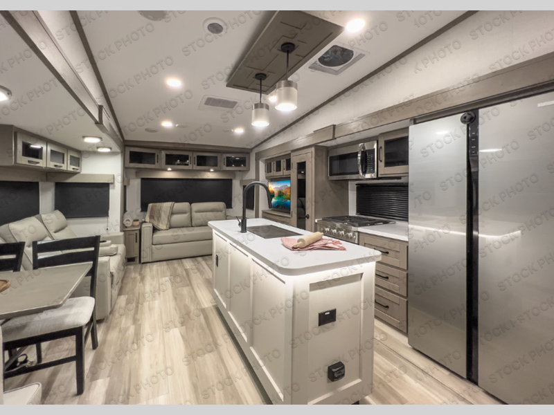 You can enjoy a spacious rear living area in this RV with dual opposing slides offering you entertainment, kitchen amenities, seating and windows for great views! The rear tri-fold sofa also converts into extra sleeping space for an extra guest or two, just like the booth dinette does. Yet you might like to add the swivel dinette option. There are theater seats to enjoy while you place your drinks in the cupholders and watch the entertainment center with a 40" LED HDTV and fireplace. The pantry is big enough to store your favorite snacks, and the kitchen island will make meal prepping easier, plus there is a 16 cu. ft. refrigerator to store any leftovers. The full bathroom has a 30" x 48" fiberglass shower and a linen closet to store your towels. The front private bedroom has a comfortable queen bed slide that can be switched out for the optional king bed, a dresser with overhead cabinets, and a full wall wardrobe that is prepped to add the optional washer and dryer so that you can extend your camping trip with clean clothes!