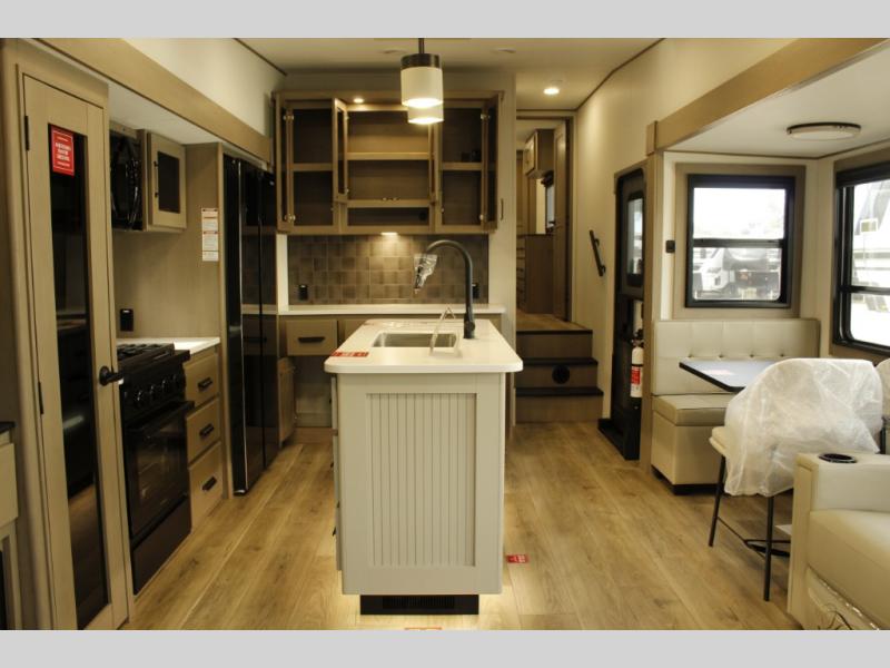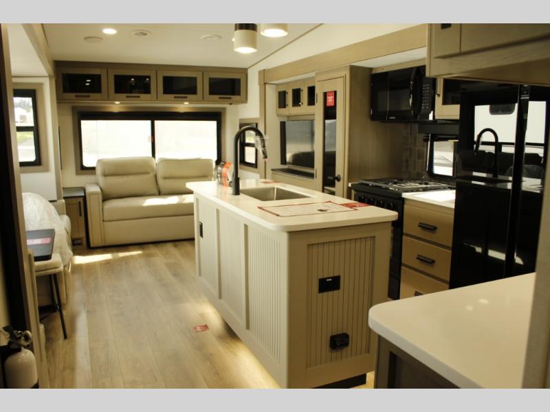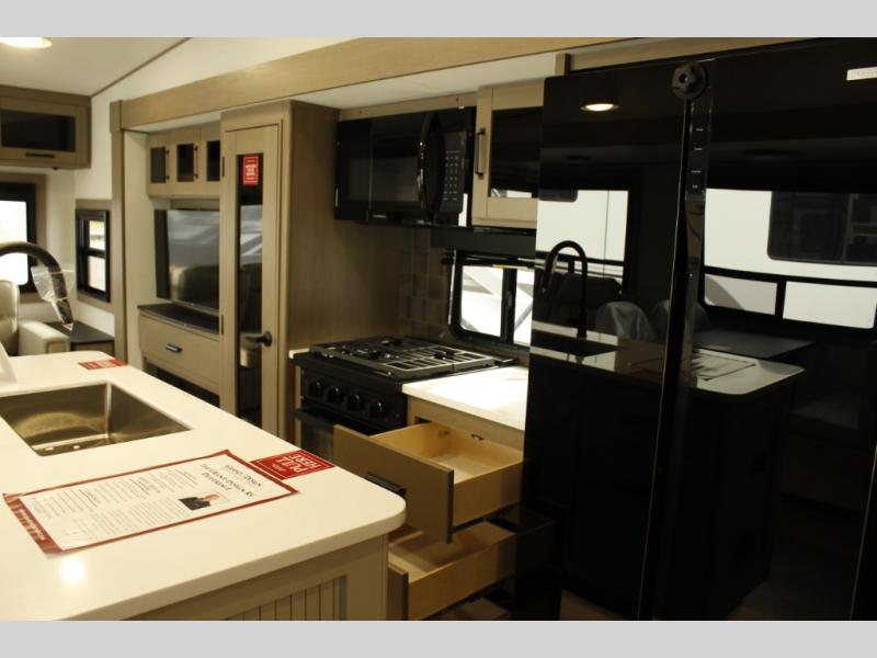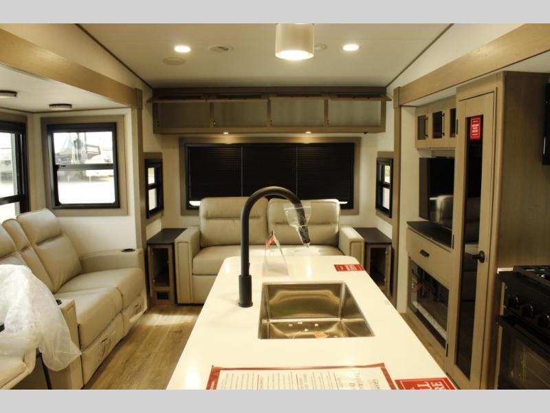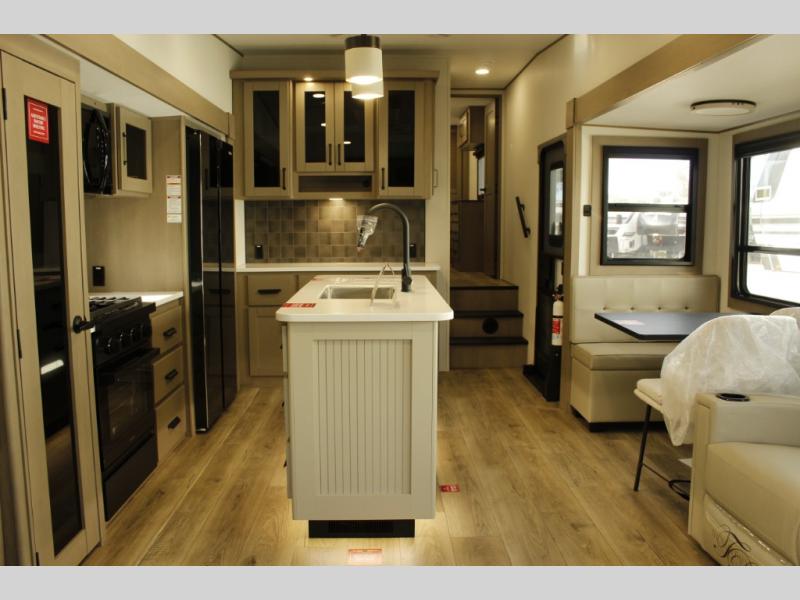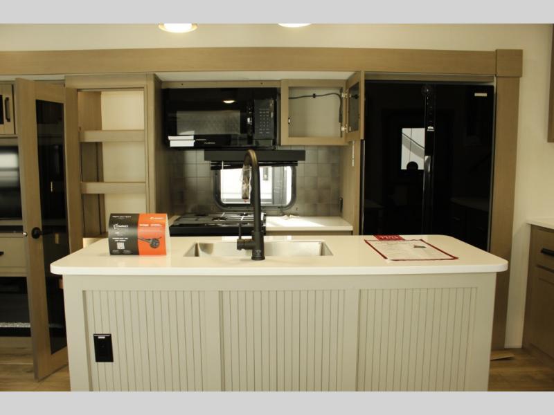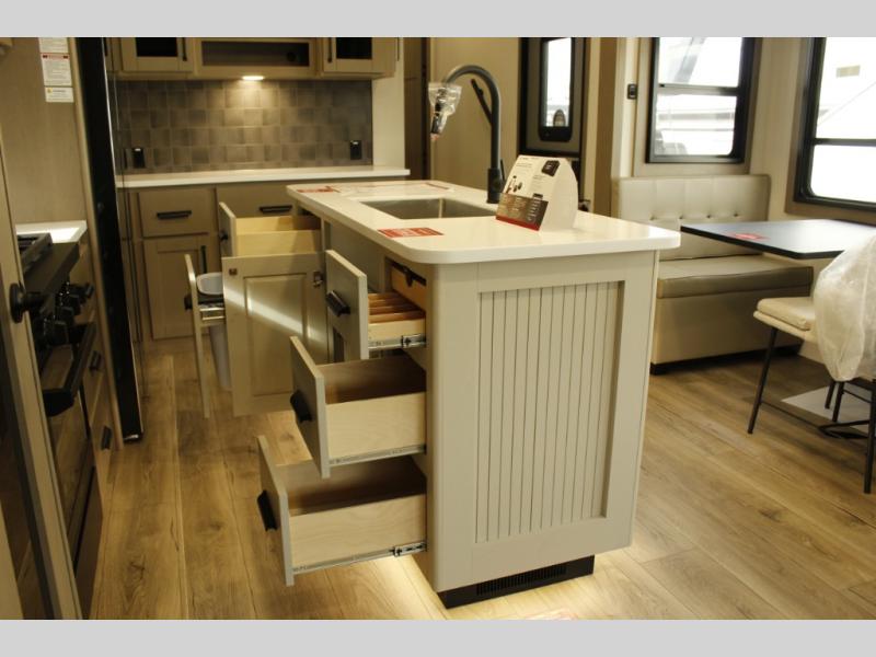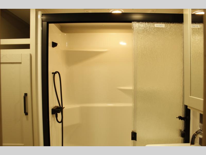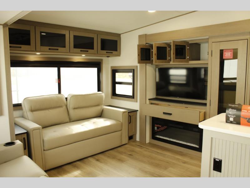 You can enjoy a spacious rear living area in this RV with dual opposing slides offering you entertainment, kitchen amenities, seating and windows for great views! The rear tri-fold sofa also converts into extra sleeping space for an extra guest or two, just like the booth dinette does. Yet you might like to add the swivel dinette option. There are theater seats to enjoy while you place your drinks in the cupholders and watch the entertainment center with a 40" LED HDTV and fireplace. The pantry is big enough to store your favorite snacks, and the kitchen island will make meal prepping easier, plus there is a 16 cu. ft. refrigerator to store any leftovers. The full bathroom has a 30" x 48" fiberglass shower and a linen closet to store your towels. The front private bedroom has a comfortable queen bed slide that can be switched out for the optional king bed, a dresser with overhead cabinets, and a full wall wardrobe that is prepped to add the optional washer and dryer so that you can extend your camping trip with clean clothes!