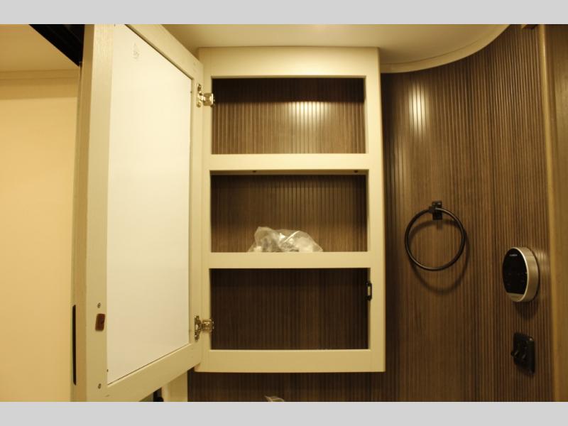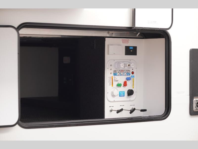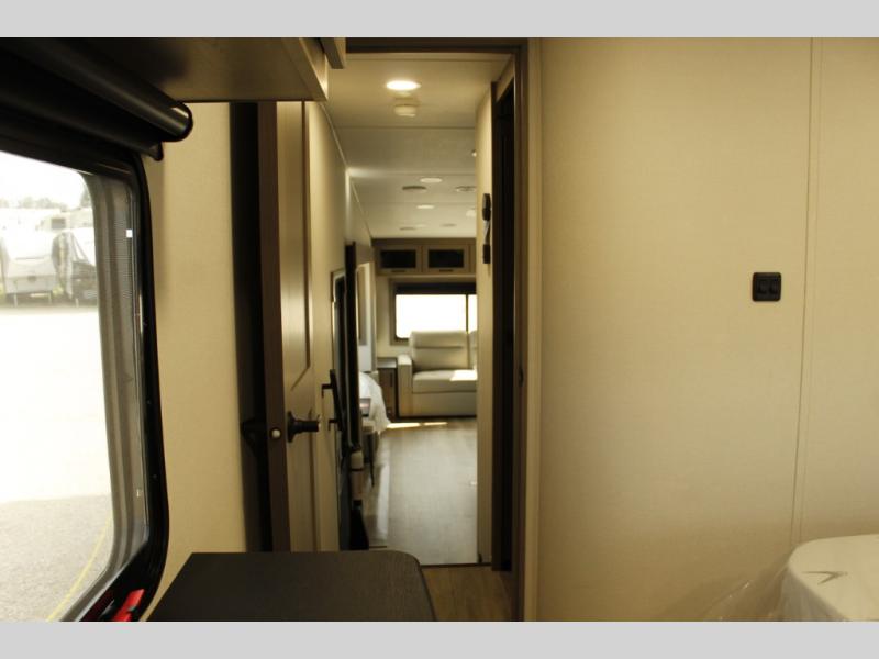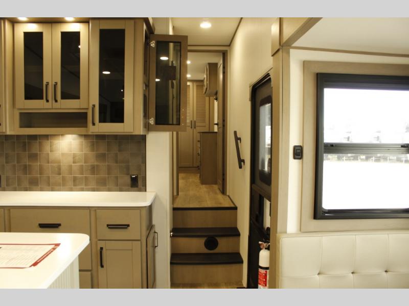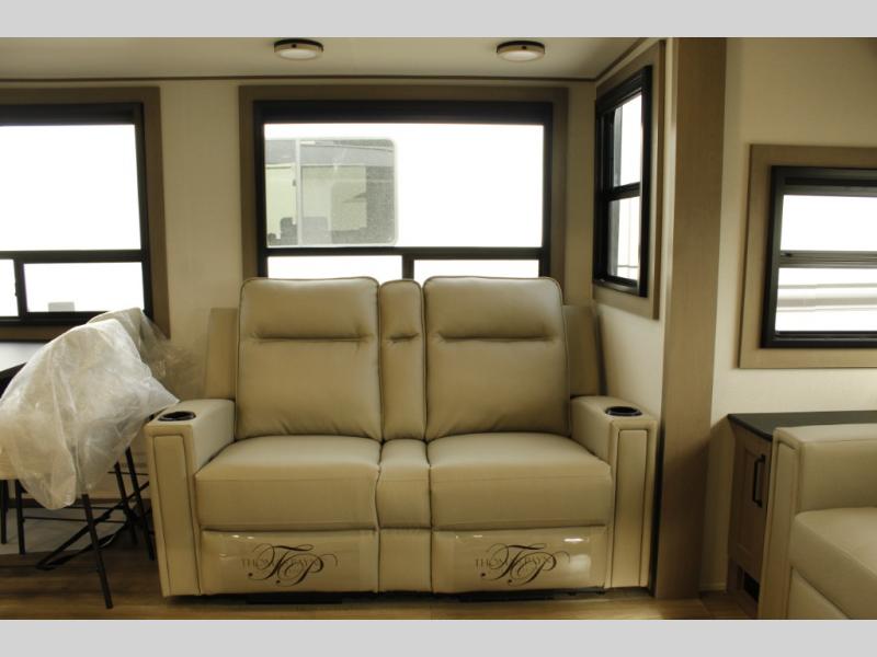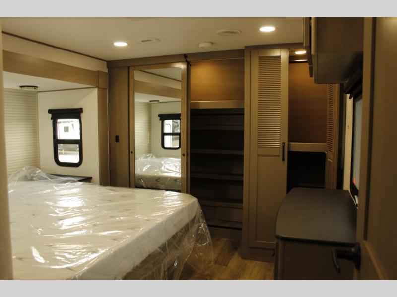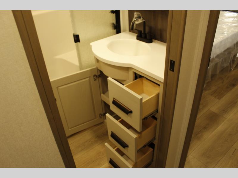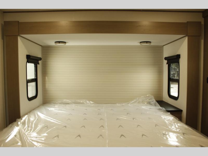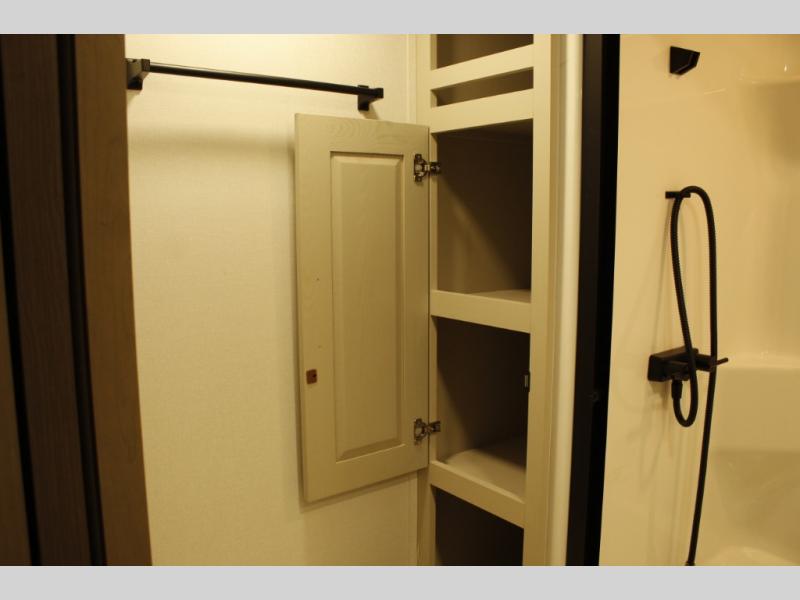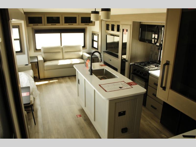 You can enjoy a spacious rear living area in this RV with dual opposing slides offering you entertainment, kitchen amenities, seating and windows for great views! The rear tri-fold sofa also converts into extra sleeping space for an extra guest or two, just like the booth dinette does. Yet you might like to add the swivel dinette option. There are theater seats to enjoy while you place your drinks in the cupholders and watch the entertainment center with a 40" LED HDTV and fireplace. The pantry is big enough to store your favorite snacks, and the kitchen island will make meal prepping easier, plus there is a 16 cu. ft. refrigerator to store any leftovers. The full bathroom has a 30" x 48" fiberglass shower and a linen closet to store your towels. The front private bedroom has a comfortable queen bed slide that can be switched out for the optional king bed, a dresser with overhead cabinets, and a full wall wardrobe that is prepped to add the optional washer and dryer so that you can extend your camping trip with clean clothes!