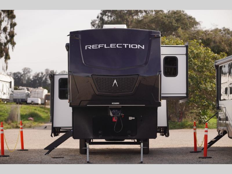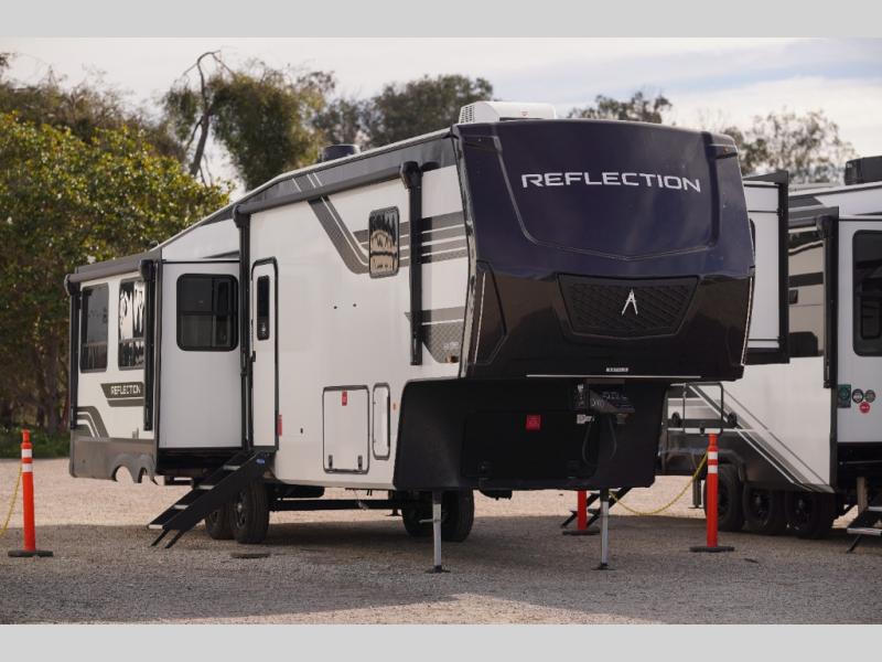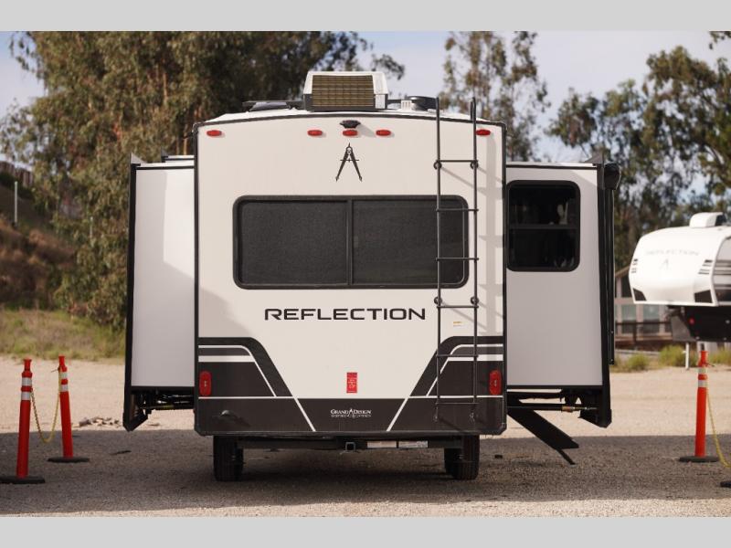 With any Reflection fifth wheel by Grand Design, you will have a solar panel for off-grid camping and a 60 amp charge controller and inverter prep, a Universal All-In-One docking station, unobstructed pass-through storage, and Goodyear Endurance tires. Each is constructed of gel coat exterior sidewalls, residential 5" truss rafters, walk-on roof decking, a fiberglass and radiant foil roof and front cap insulation plus laminated aluminum framed side walls, roof and end walls in slide rooms. Head inside to enjoy residential hardwood cabinet doors, premium Congoleum flooring, a spacious shower with a glass door, and many more comforts!