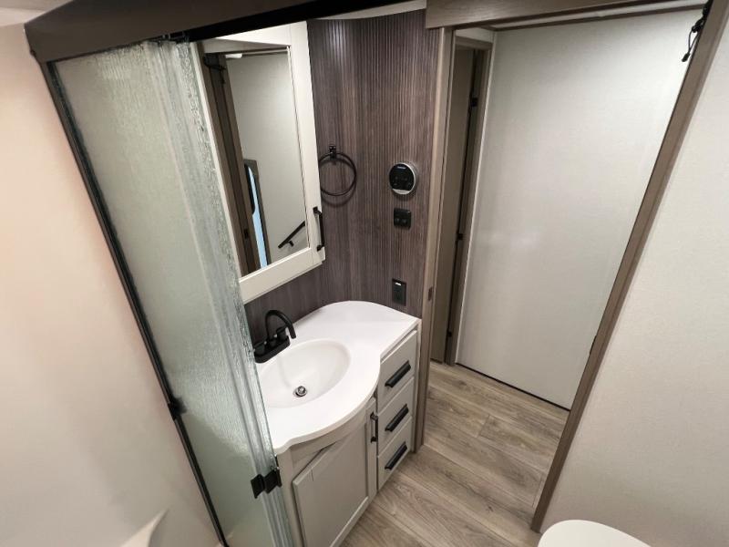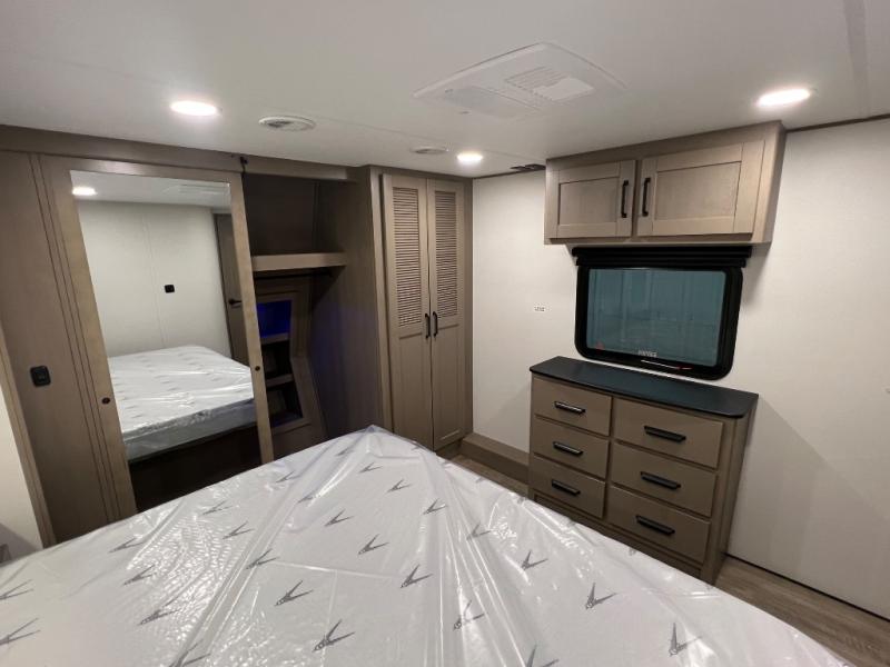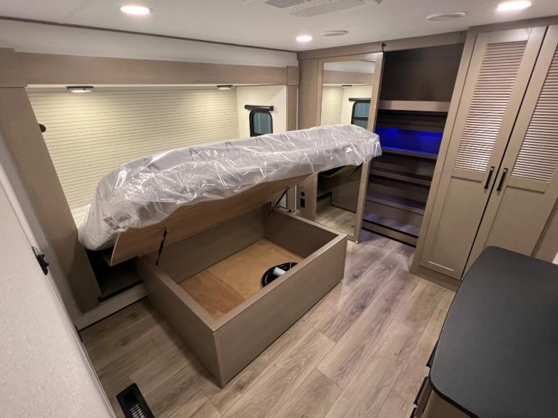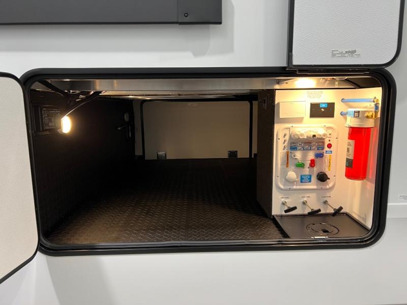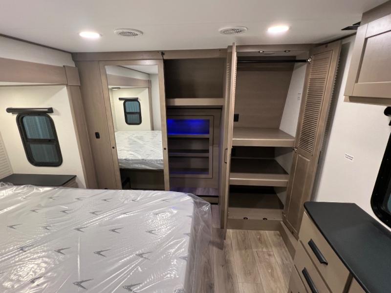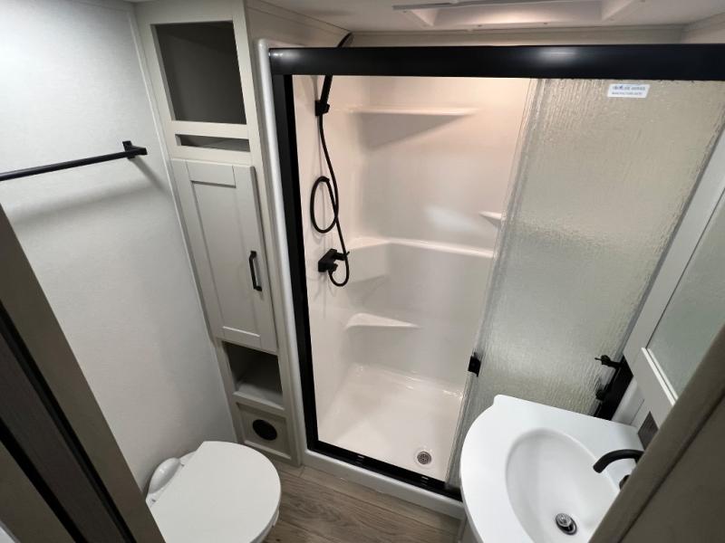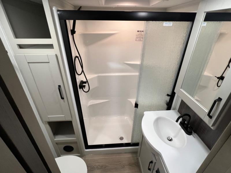 You can enjoy a spacious rear living area in this RV with dual opposing slides offering you entertainment, kitchen amenities, seating and windows for great views! The rear tri-fold sofa also converts into extra sleeping space for an extra guest or two, just like the booth dinette does. Yet you might like to add the swivel dinette option. There are theater seats to enjoy while you place your drinks in the cupholders and watch the entertainment center with a 40" LED HDTV and fireplace. The pantry is big enough to store your favorite snacks, and the kitchen island will make meal prepping easier, plus there is a 16 cu. ft. refrigerator to store any leftovers. The full bathroom has a 30" x 48" fiberglass shower and a linen closet to store your towels. The front private bedroom has a comfortable queen bed slide that can be switched out for the optional king bed, a dresser with overhead cabinets, and a full wall wardrobe that is prepped to add the optional washer and dryer so that you can extend your camping trip with clean clothes!