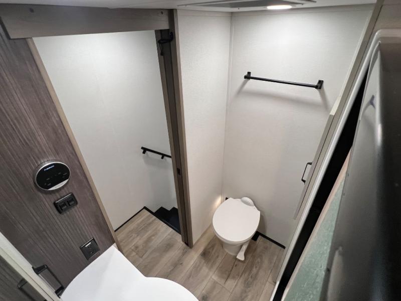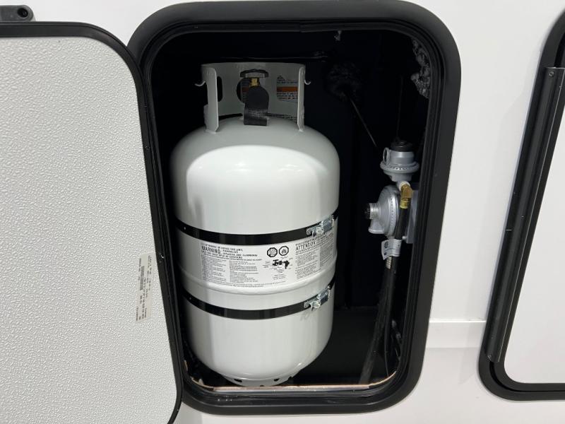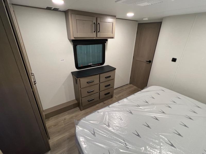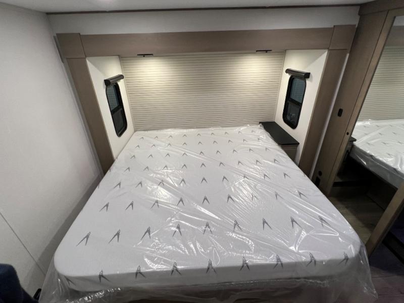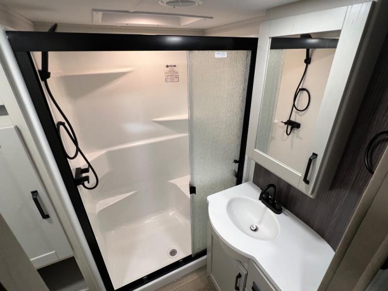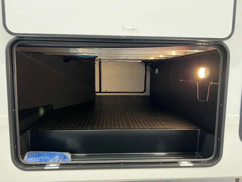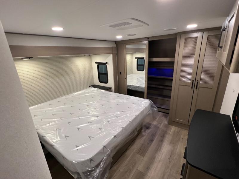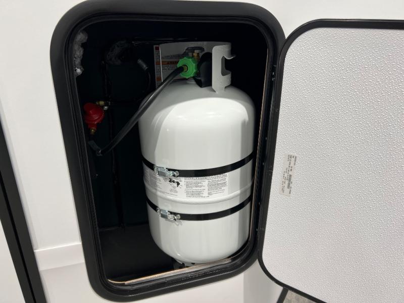 You can enjoy a spacious rear living area in this RV with dual opposing slides offering you entertainment, kitchen amenities, seating and windows for great views! The rear tri-fold sofa also converts into extra sleeping space for an extra guest or two, just like the booth dinette does. Yet you might like to add the swivel dinette option. There are theater seats to enjoy while you place your drinks in the cupholders and watch the entertainment center with a 40" LED HDTV and fireplace. The pantry is big enough to store your favorite snacks, and the kitchen island will make meal prepping easier, plus there is a 16 cu. ft. refrigerator to store any leftovers. The full bathroom has a 30" x 48" fiberglass shower and a linen closet to store your towels. The front private bedroom has a comfortable queen bed slide that can be switched out for the optional king bed, a dresser with overhead cabinets, and a full wall wardrobe that is prepped to add the optional washer and dryer so that you can extend your camping trip with clean clothes!