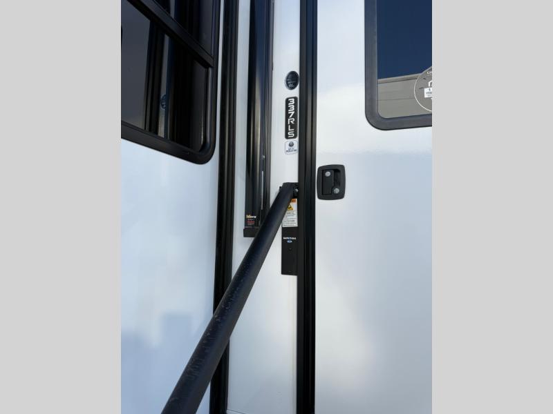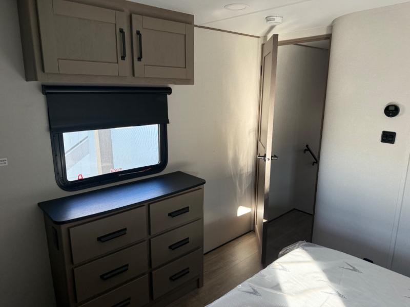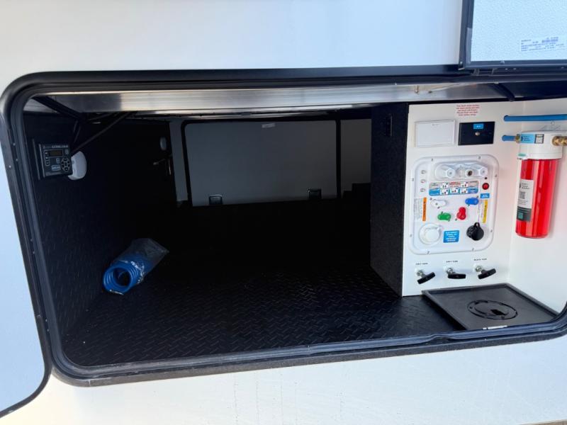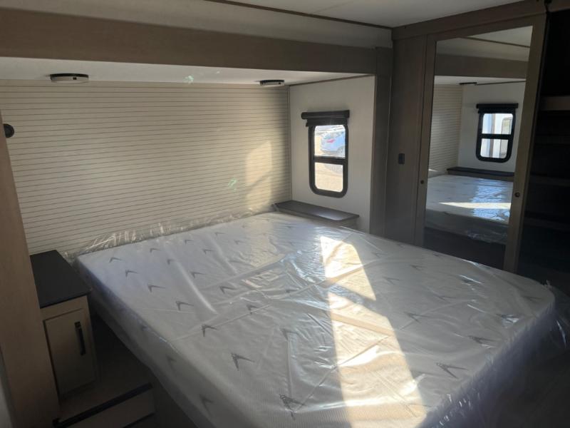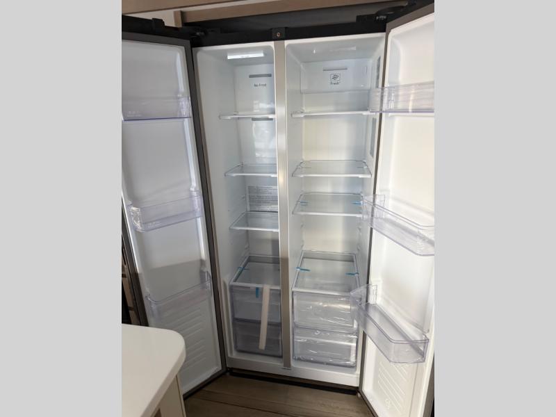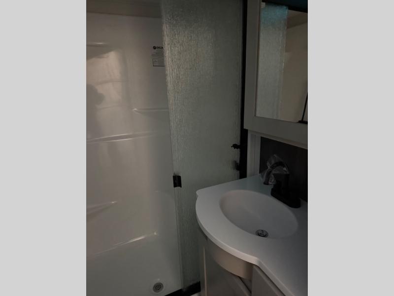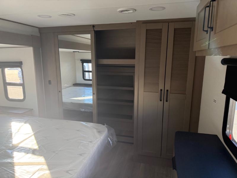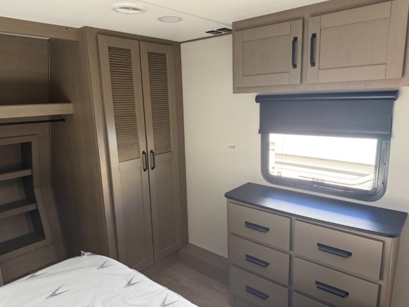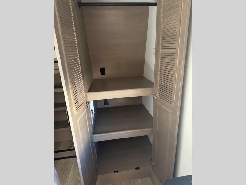 You can enjoy a spacious rear living area in this RV with dual opposing slides offering you entertainment, kitchen amenities, seating and windows for great views! The rear tri-fold sofa also converts into extra sleeping space for an extra guest or two, just like the booth dinette does. Yet you might like to add the swivel dinette option. There are theater seats to enjoy while you place your drinks in the cupholders and watch the entertainment center with a 40" LED HDTV and fireplace. The pantry is big enough to store your favorite snacks, and the kitchen island will make meal prepping easier, plus there is a 16 cu. ft. refrigerator to store any leftovers. The full bathroom has a 30" x 48" fiberglass shower and a linen closet to store your towels. The front private bedroom has a comfortable queen bed slide that can be switched out for the optional king bed, a dresser with overhead cabinets, and a full wall wardrobe that is prepped to add the optional washer and dryer so that you can extend your camping trip with clean clothes!