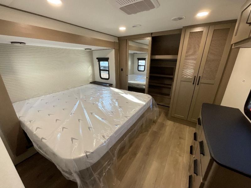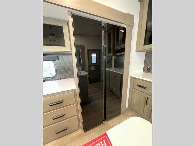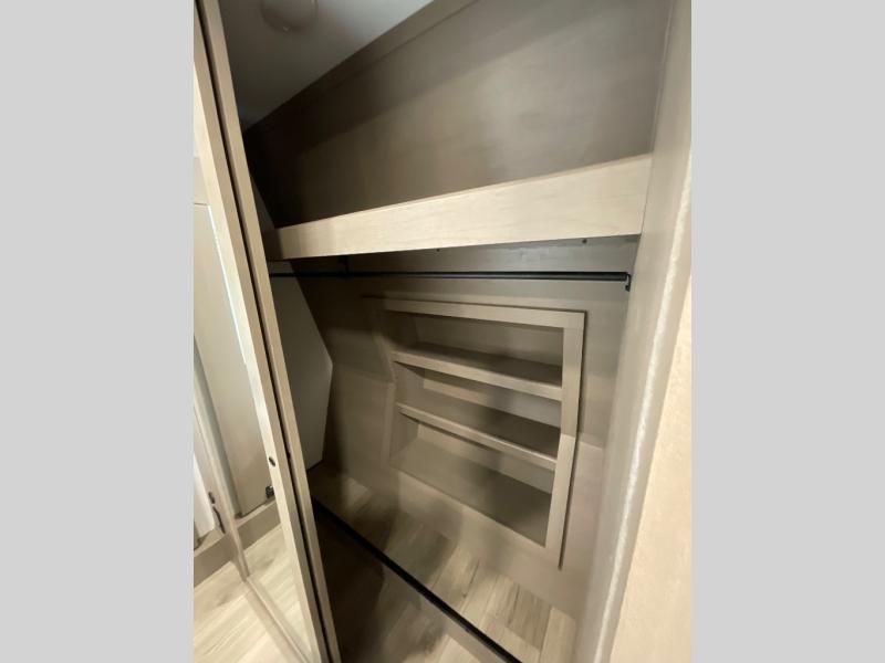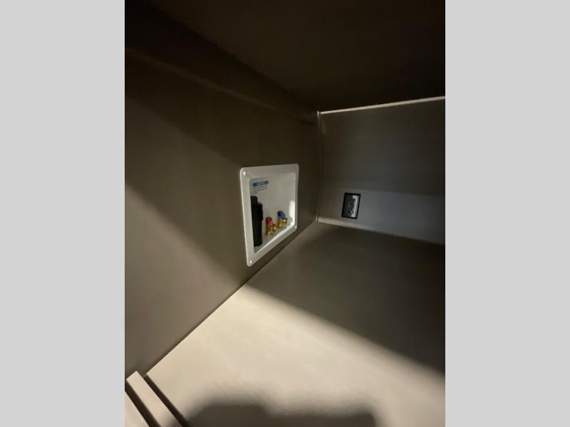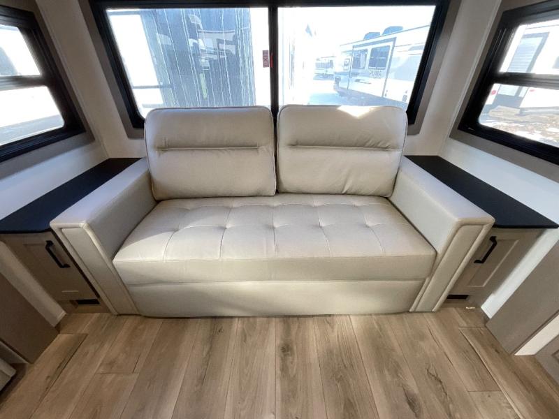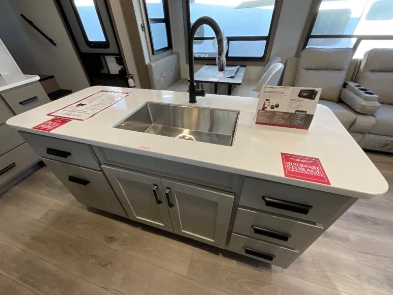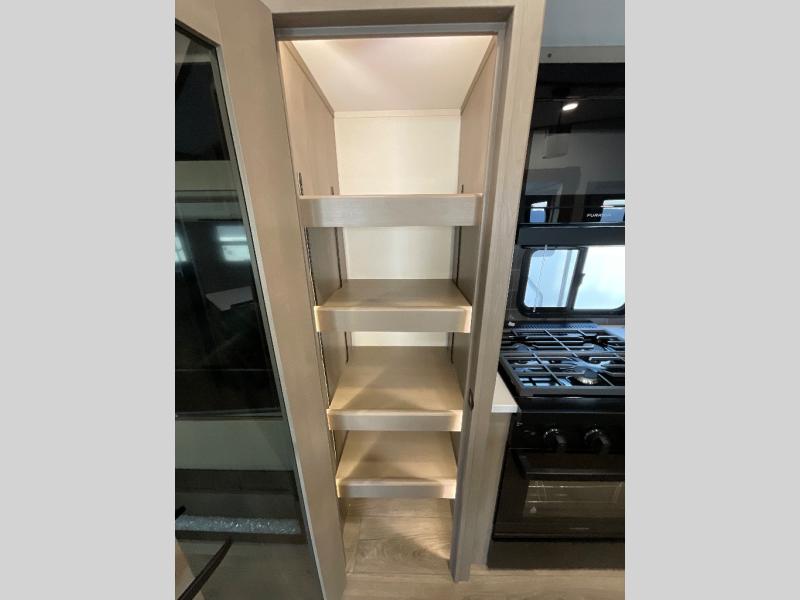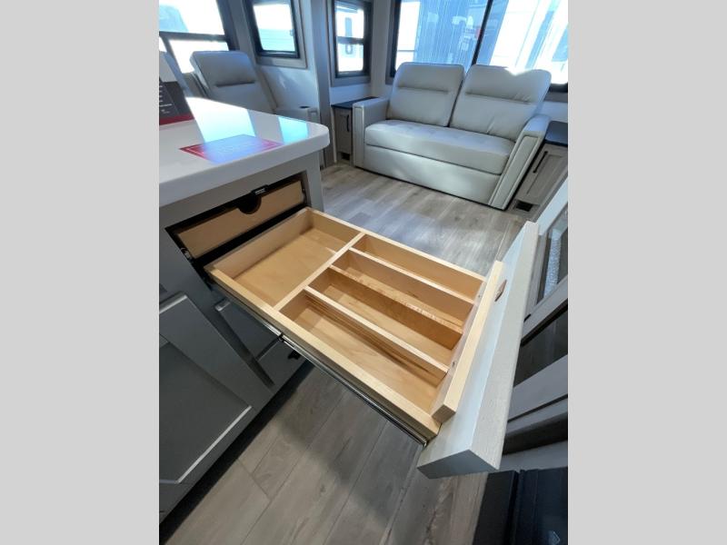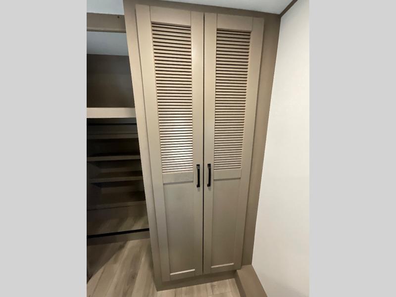 You can enjoy a spacious rear living area in this RV with dual opposing slides offering you entertainment, kitchen amenities, seating and windows for great views! The rear tri-fold sofa also converts into extra sleeping space for an extra guest or two, just like the booth dinette does. Yet you might like to add the swivel dinette option. There are theater seats to enjoy while you place your drinks in the cupholders and watch the entertainment center with a 40" LED HDTV and fireplace. The pantry is big enough to store your favorite snacks, and the kitchen island will make meal prepping easier, plus there is a 16 cu. ft. refrigerator to store any leftovers. The full bathroom has a 30" x 48" fiberglass shower and a linen closet to store your towels. The front private bedroom has a comfortable queen bed slide that can be switched out for the optional king bed, a dresser with overhead cabinets, and a full wall wardrobe that is prepped to add the optional washer and dryer so that you can extend your camping trip with clean clothes!