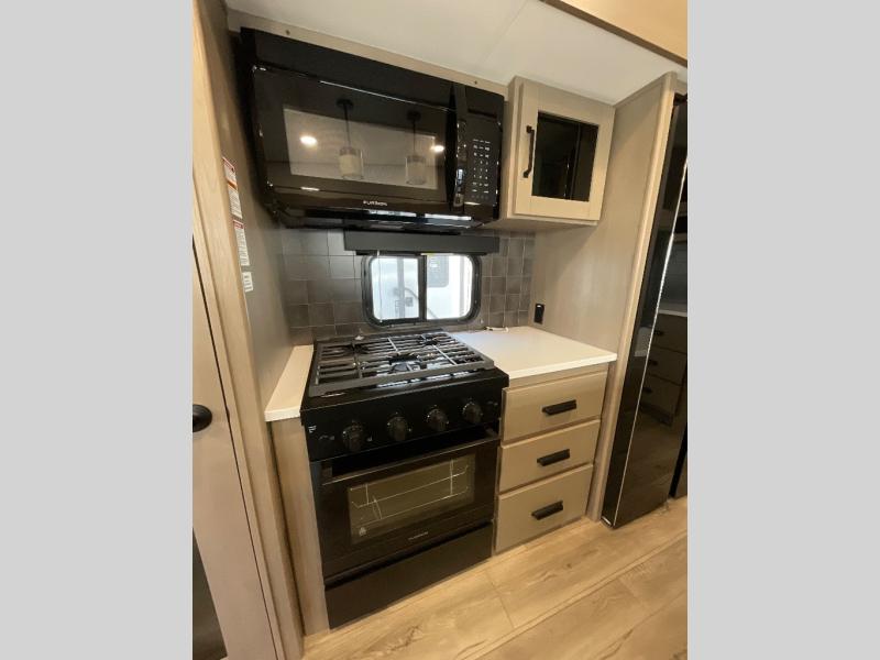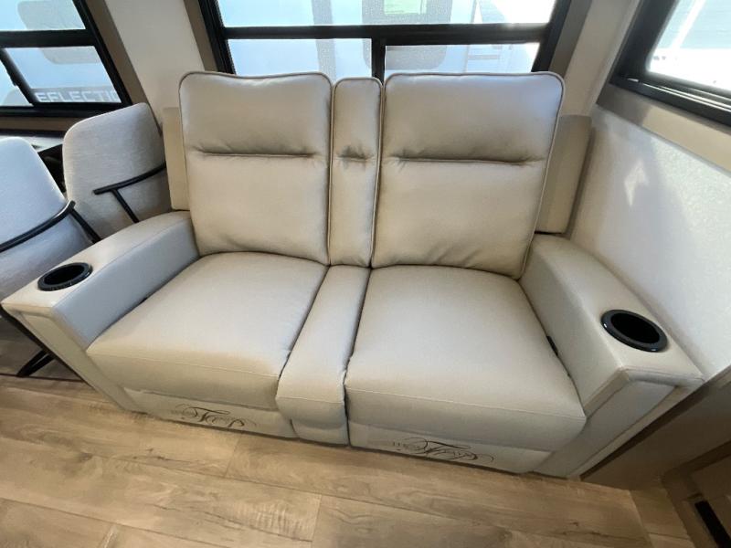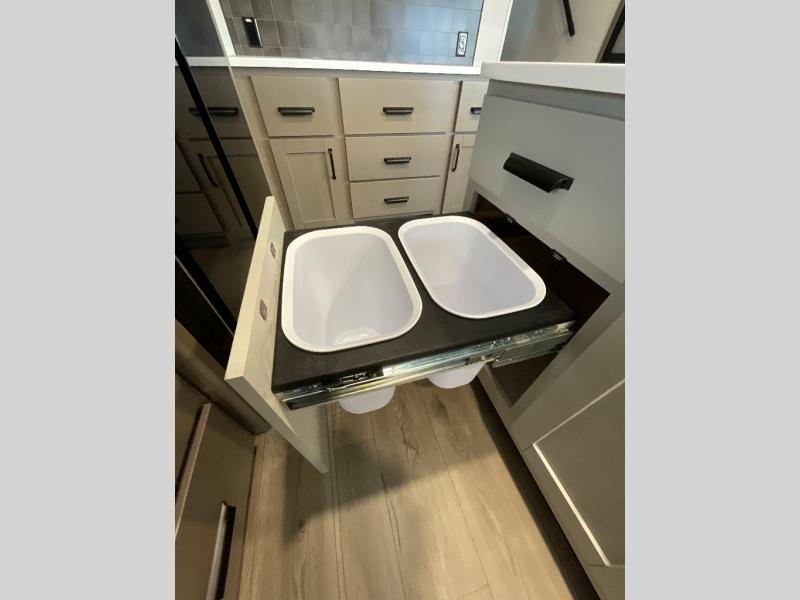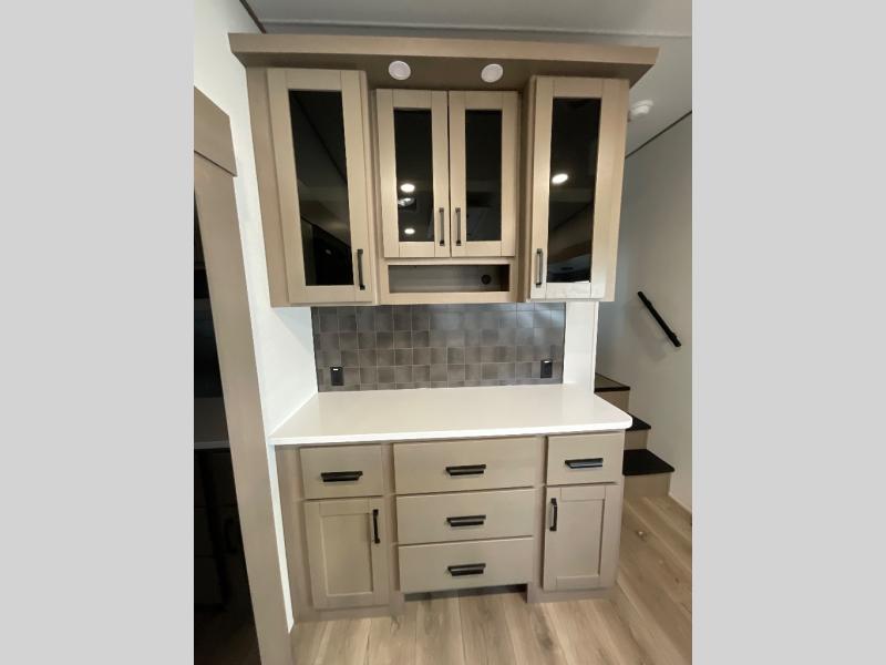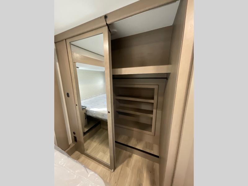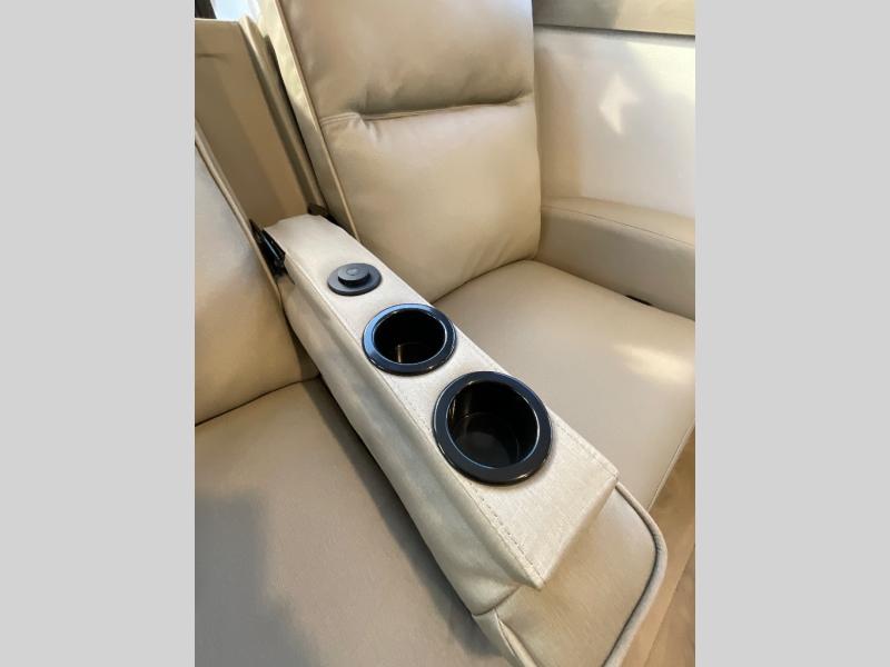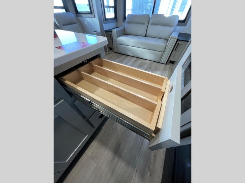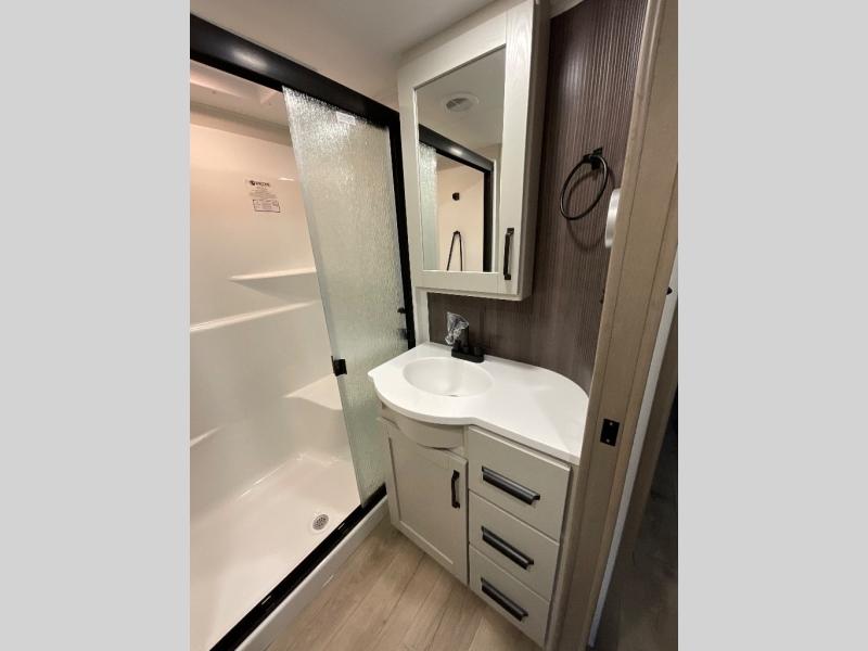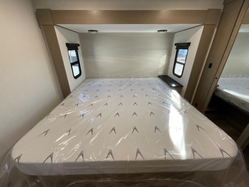 You can enjoy a spacious rear living area in this RV with dual opposing slides offering you entertainment, kitchen amenities, seating and windows for great views! The rear tri-fold sofa also converts into extra sleeping space for an extra guest or two, just like the booth dinette does. Yet you might like to add the swivel dinette option. There are theater seats to enjoy while you place your drinks in the cupholders and watch the entertainment center with a 40" LED HDTV and fireplace. The pantry is big enough to store your favorite snacks, and the kitchen island will make meal prepping easier, plus there is a 16 cu. ft. refrigerator to store any leftovers. The full bathroom has a 30" x 48" fiberglass shower and a linen closet to store your towels. The front private bedroom has a comfortable queen bed slide that can be switched out for the optional king bed, a dresser with overhead cabinets, and a full wall wardrobe that is prepped to add the optional washer and dryer so that you can extend your camping trip with clean clothes!