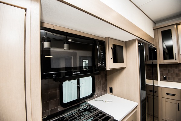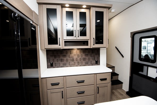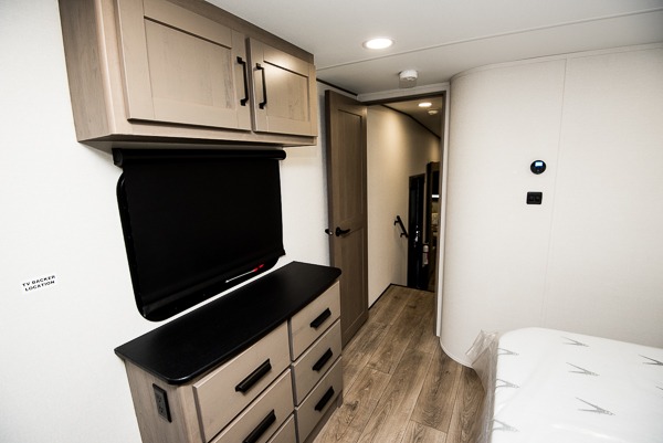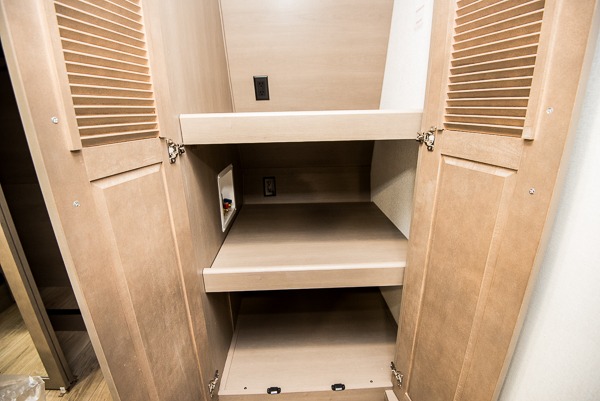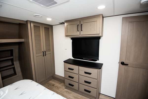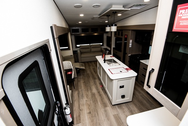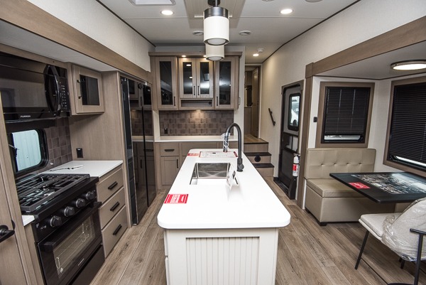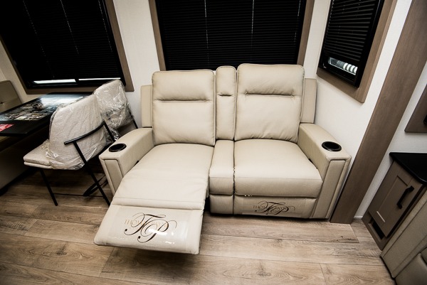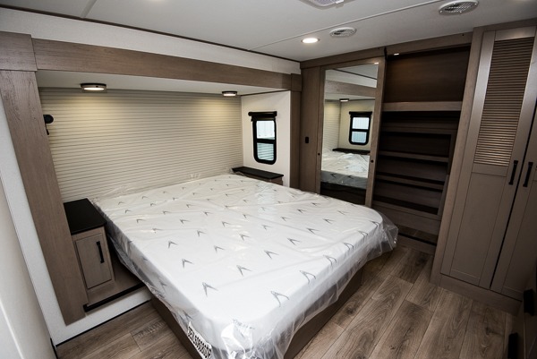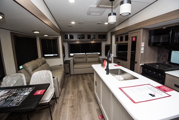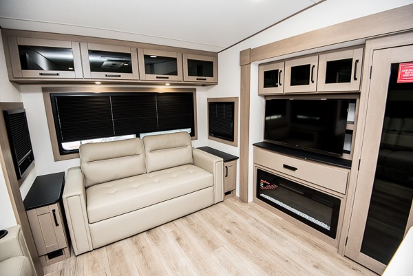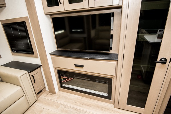 You can enjoy a spacious rear living area in this RV with dual opposing slides offering you entertainment, kitchen amenities, seating and windows for great views! The rear tri-fold sofa also converts into extra sleeping space for an extra guest or two, just like the booth dinette does. Yet you might like to add the swivel dinette option. There are theater seats to enjoy while you place your drinks in the cupholders and watch the entertainment center with a 40" LED HDTV and fireplace. The pantry is big enough to store your favorite snacks, and the kitchen island will make meal prepping easier, plus there is a 16-cu. ft. refrigerator to store any leftovers. The full bathroom has a 30" x 48" fiberglass shower and a linen closet to store your towels. The front private bedroom has a comfortable queen bed slide that can be switched out for the optional king bed, a dresser with overhead cabinets, and a full wall wardrobe that is prepped to add the optional washer!