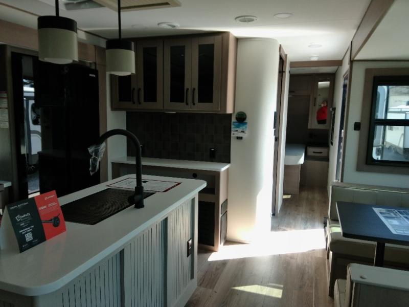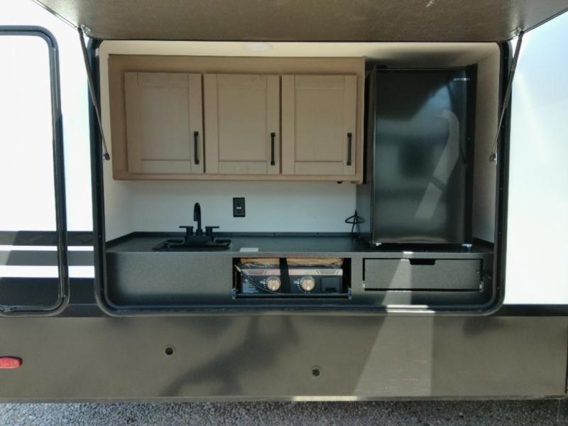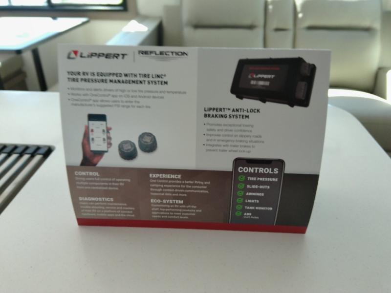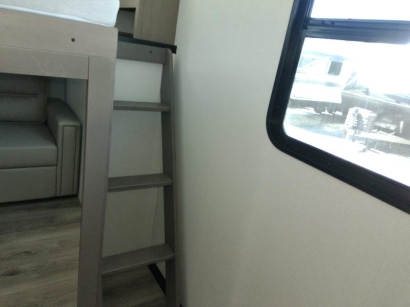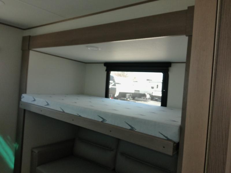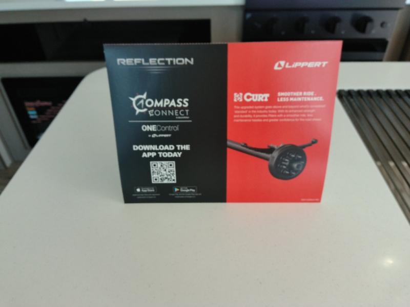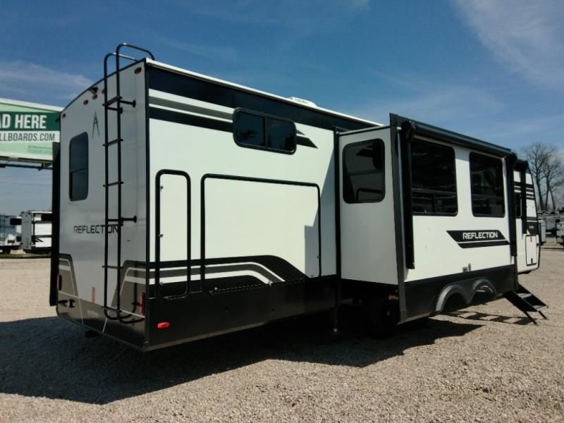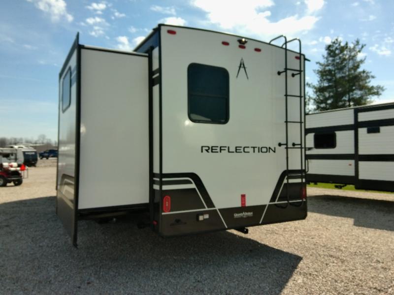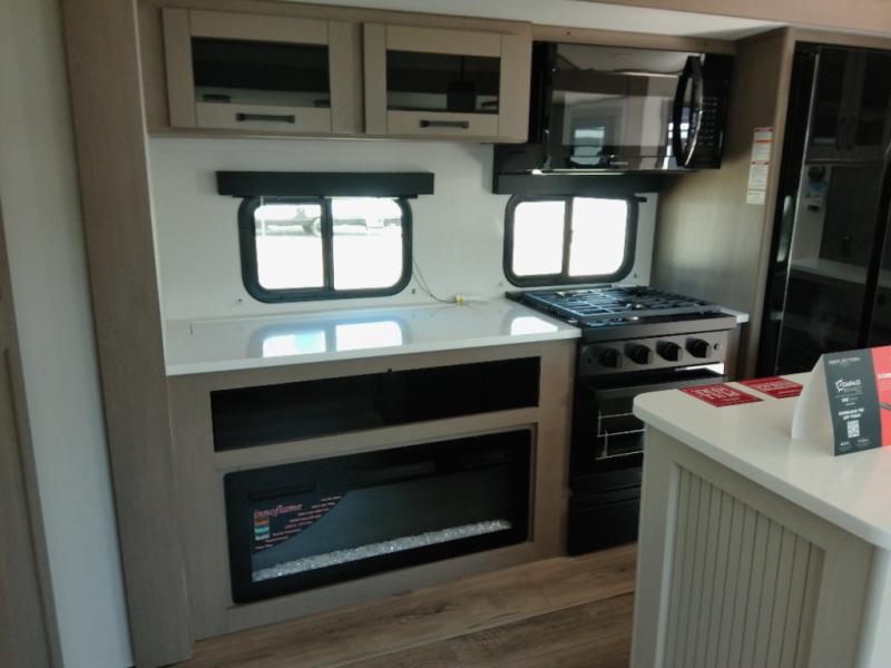 Finding the perfect trailer for a larger group is simple with this Reflection! The rear bunkhouse might be the first reason you fall in love because of the slide out with a flip top bunk above a tri-fold sofa, a second bunk bed with a window on the opposite side and storage below, and the large rear window for great views. The outside kitchen might be another reason allowing you to enjoy the outdoors while providing meals for everyone, and/or the inside gourmet kitchen with a 16-cu. ft. refrigerator, an island, and additional storage space. Everyone can gather together and relax on the theater seating with cupholders and the booth dinette across from the entertainment center and fireplace. An optional tri-fold sofa can be chosen in place of the theater seat, and an optional free-standing dinette can be chosen in place of the booth dinette if you prefer these seating options. The full bathroom includes a space savings sliding door and linen storage, and the bedroom gives you a front walk-around queen bed with storage for your clothes, plus there is an additional wardrobe with washer and dryer prep if you choose to add these appliances.