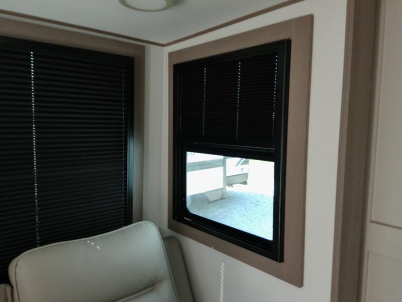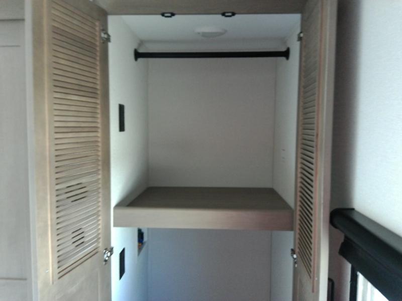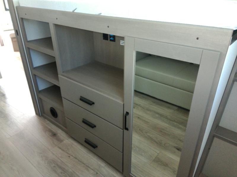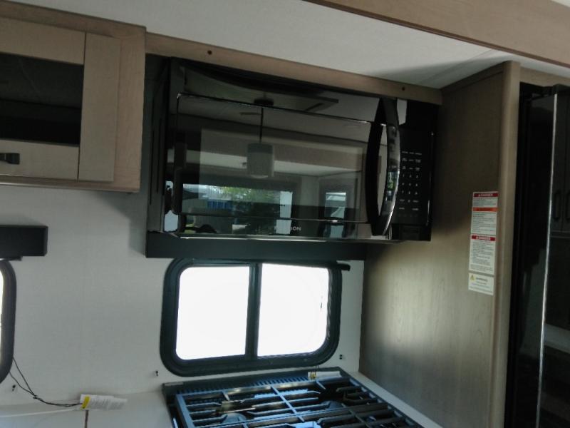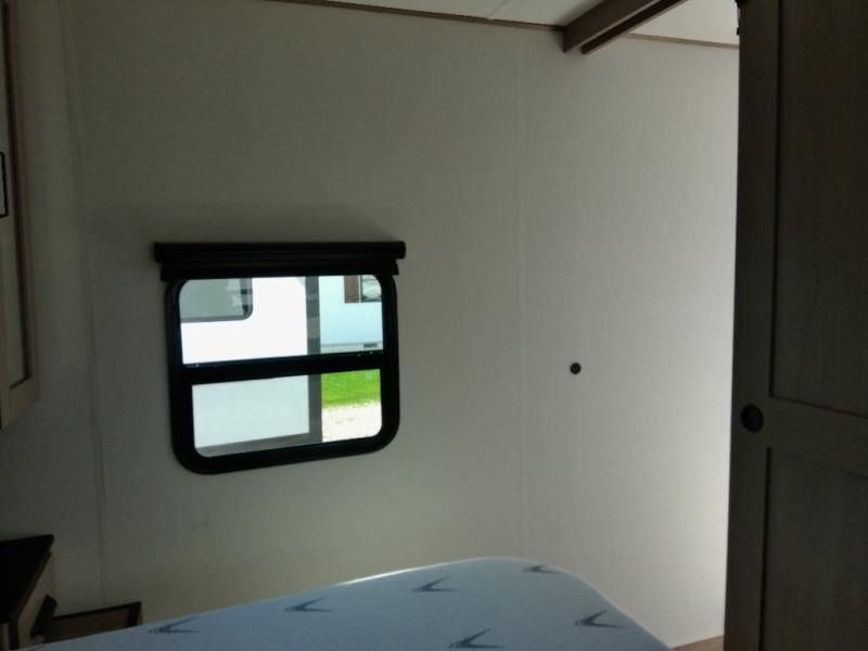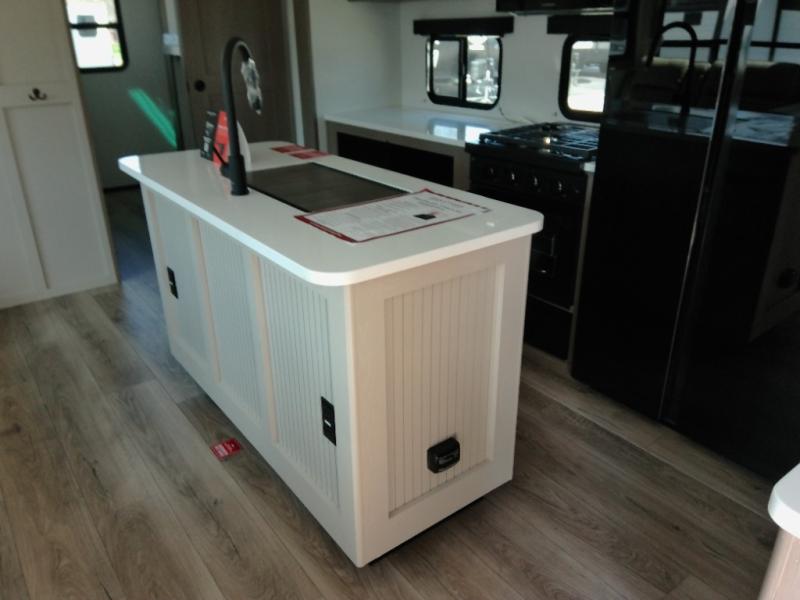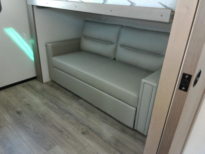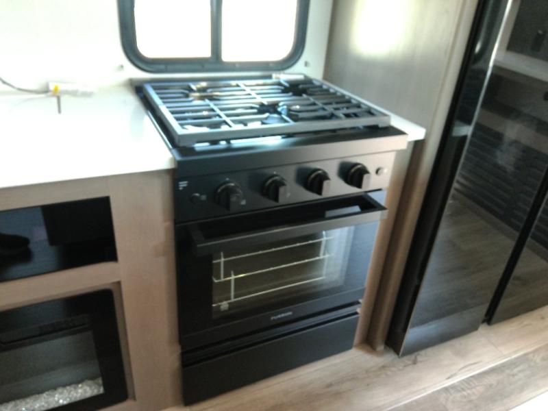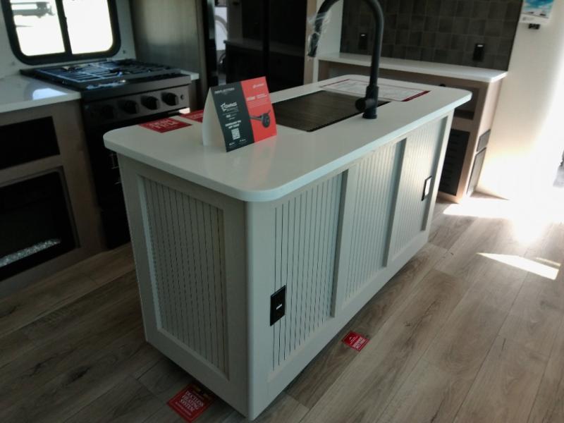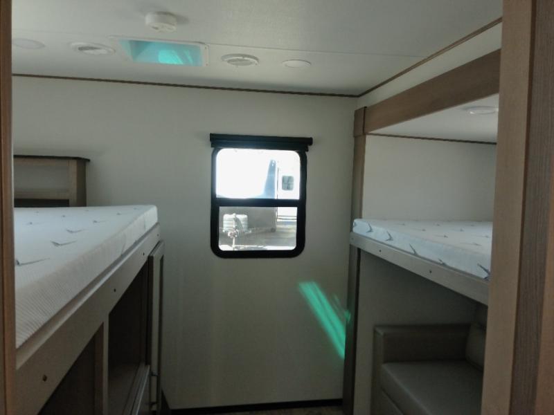 Finding the perfect trailer for a larger group is simple with this Reflection! The rear bunkhouse might be the first reason you fall in love because of the slide out with a flip top bunk above a tri-fold sofa, a second bunk bed with a window on the opposite side and storage below, and the large rear window for great views. The outside kitchen might be another reason allowing you to enjoy the outdoors while providing meals for everyone, and/or the inside gourmet kitchen with a 16-cu. ft. refrigerator, an island, and additional storage space. Everyone can gather together and relax on the theater seating with cupholders and the booth dinette across from the entertainment center and fireplace. An optional tri-fold sofa can be chosen in place of the theater seat, and an optional free-standing dinette can be chosen in place of the booth dinette if you prefer these seating options. The full bathroom includes a space savings sliding door and linen storage, and the bedroom gives you a front walk-around queen bed with storage for your clothes, plus there is an additional wardrobe with washer and dryer prep if you choose to add these appliances.