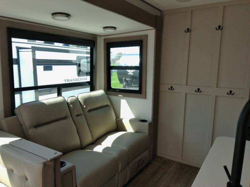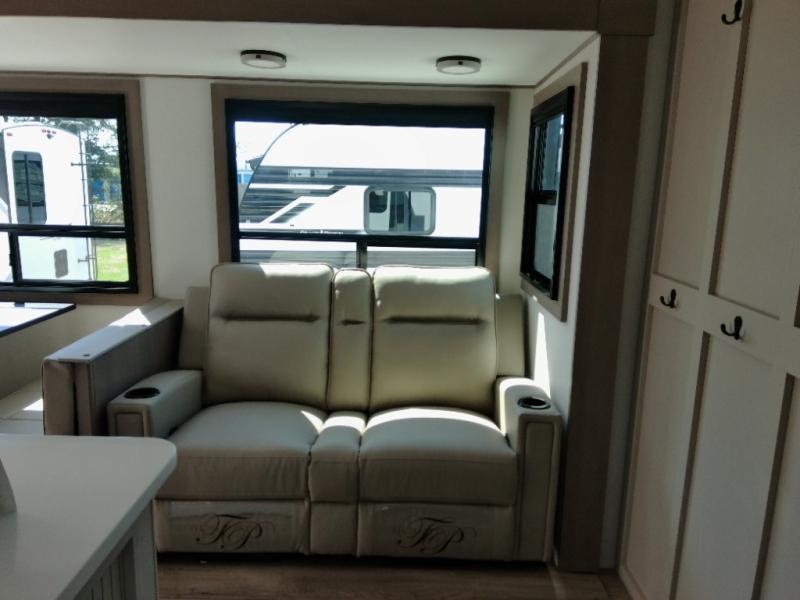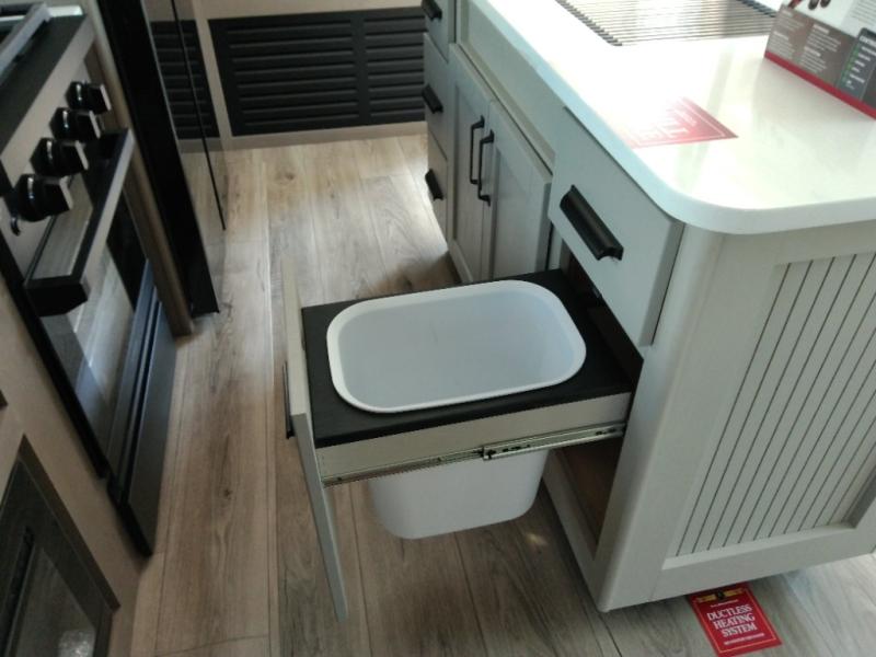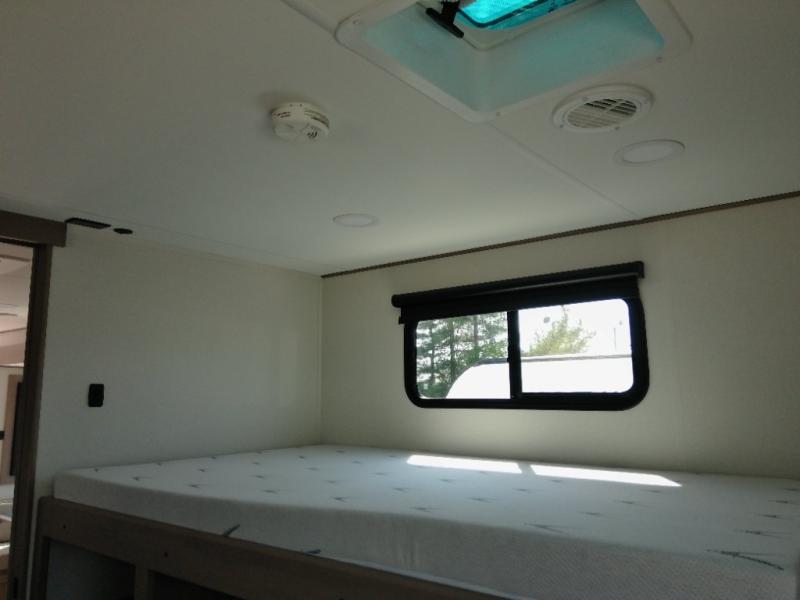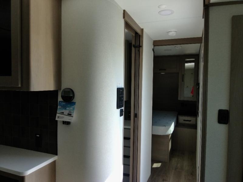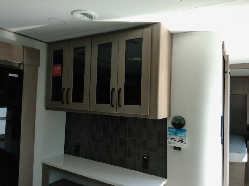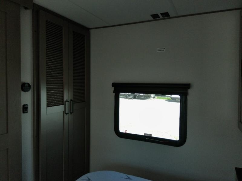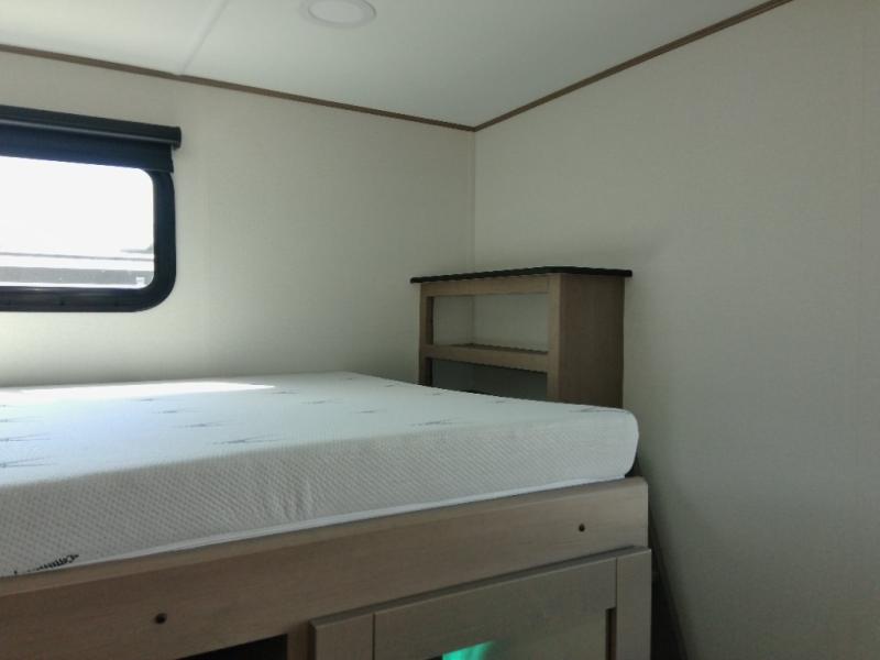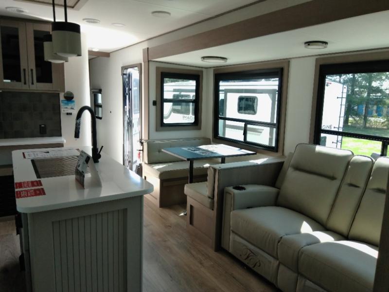 Finding the perfect trailer for a larger group is simple with this Reflection! The rear bunkhouse might be the first reason you fall in love because of the slide out with a flip top bunk above a tri-fold sofa, a second bunk bed with a window on the opposite side and storage below, and the large rear window for great views. The outside kitchen might be another reason allowing you to enjoy the outdoors while providing meals for everyone, and/or the inside gourmet kitchen with a 16-cu. ft. refrigerator, an island, and additional storage space. Everyone can gather together and relax on the theater seating with cupholders and the booth dinette across from the entertainment center and fireplace. An optional tri-fold sofa can be chosen in place of the theater seat, and an optional free-standing dinette can be chosen in place of the booth dinette if you prefer these seating options. The full bathroom includes a space savings sliding door and linen storage, and the bedroom gives you a front walk-around queen bed with storage for your clothes, plus there is an additional wardrobe with washer and dryer prep if you choose to add these appliances.