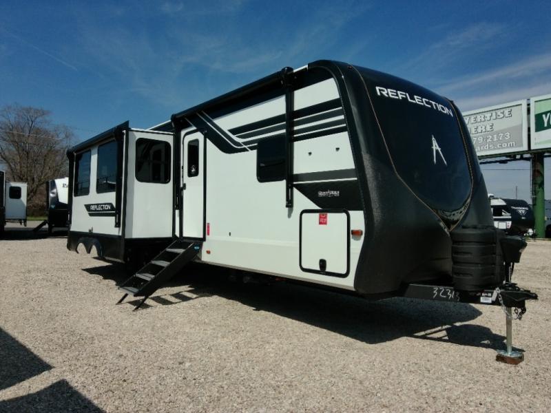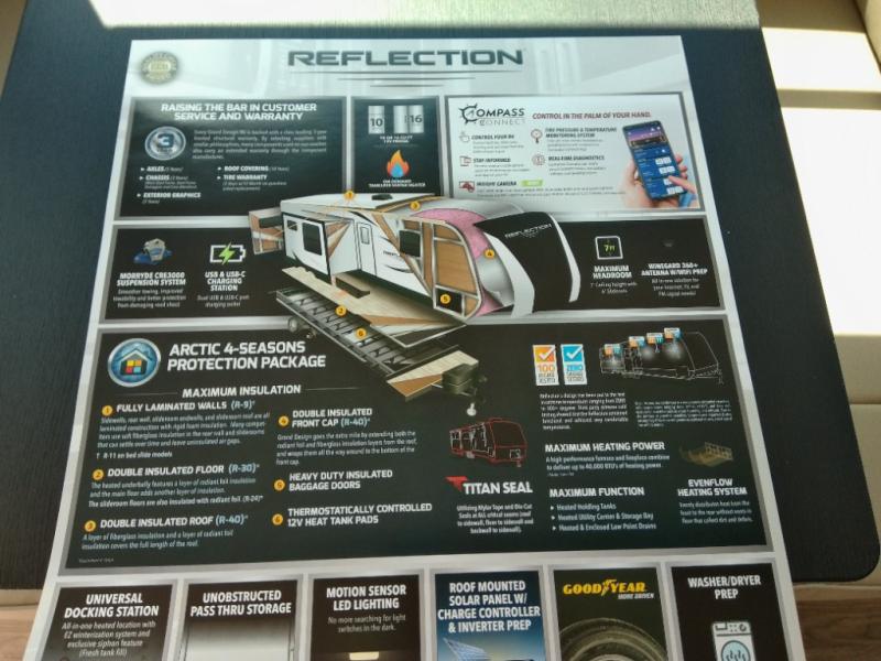 With any Reflection travel trailer by Grand Design, you will have a solar panel for off-grid camping and a 60-amp charge controller and inverter prep, a Universal All-In-One docking station, unobstructed pass-through storage, and Goodyear Endurance tires. Each is constructed of gel coat exterior sidewalls, residential 5" truss rafters, walk-on roof decking, a fiberglass and radiant foil roof and front cap insulation plus laminated aluminum framed side walls, roof and end walls in slide rooms. Head inside to enjoy residential hardwood cabinet doors, premium Congoleum flooring, a spacious shower with a glass door, and many more comforts!