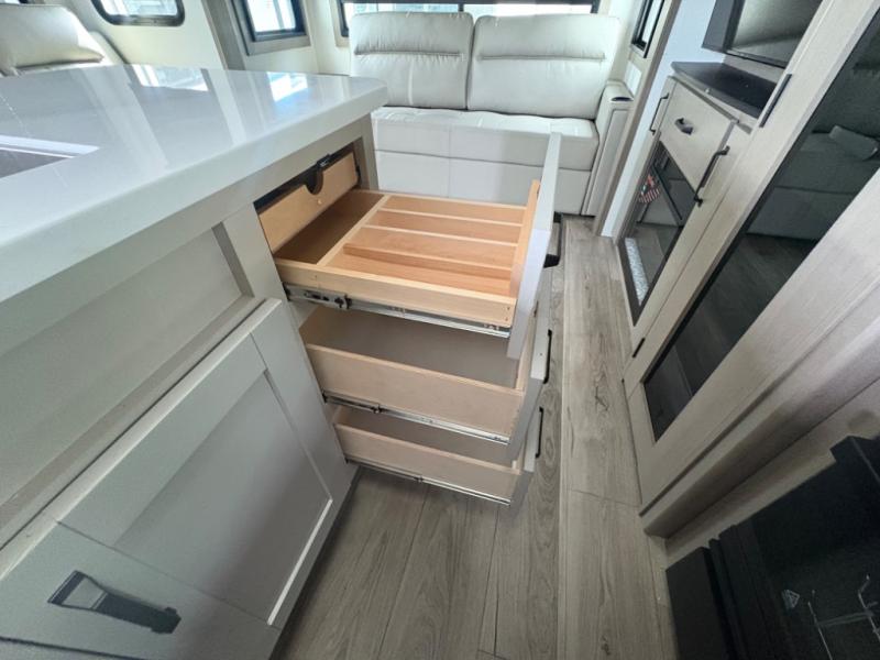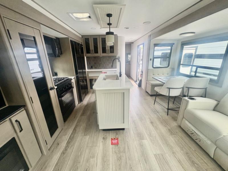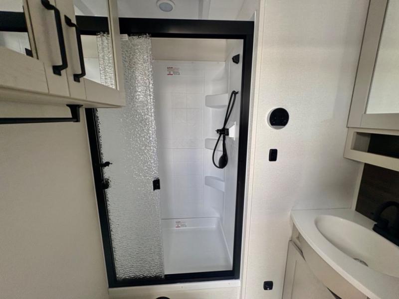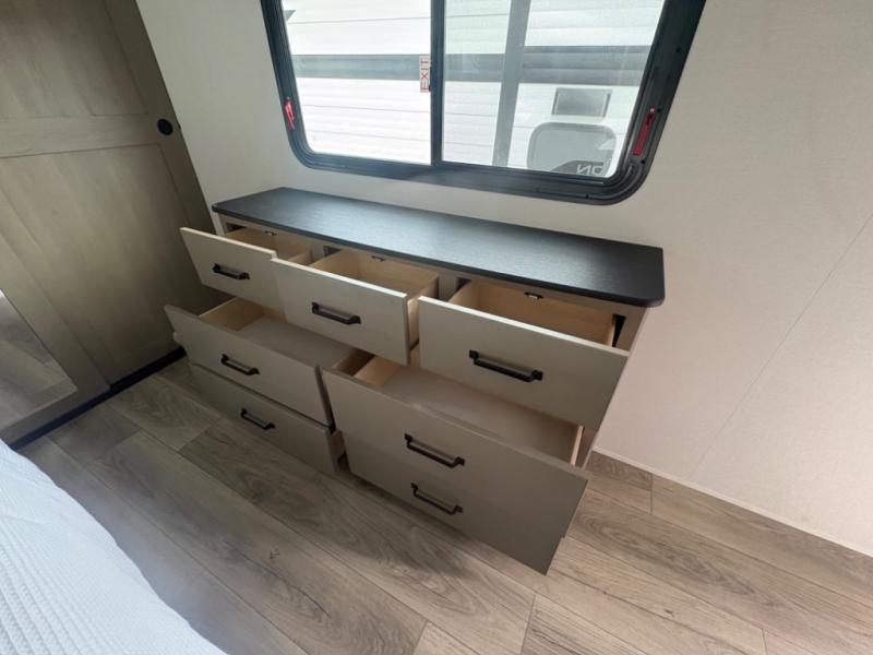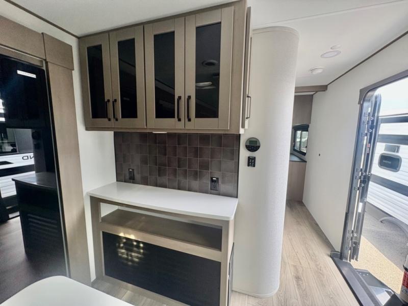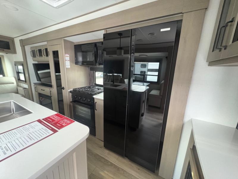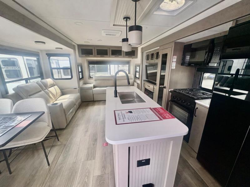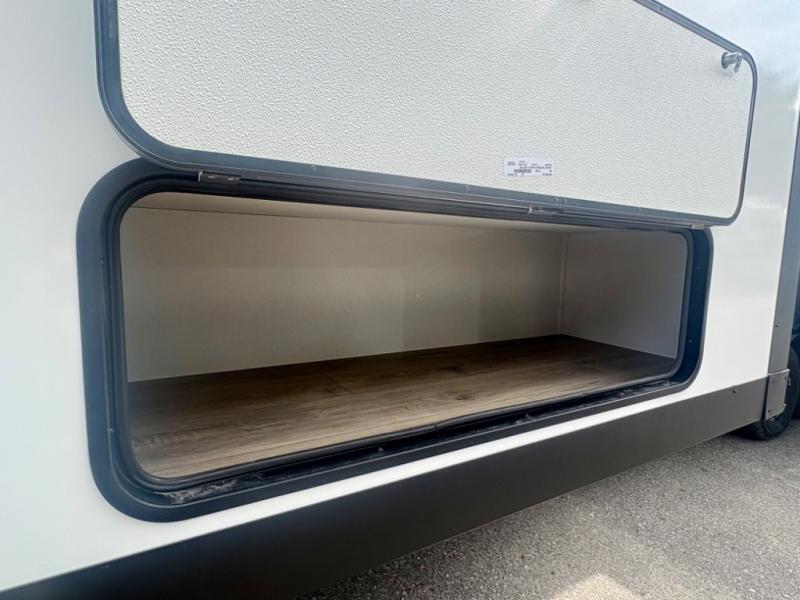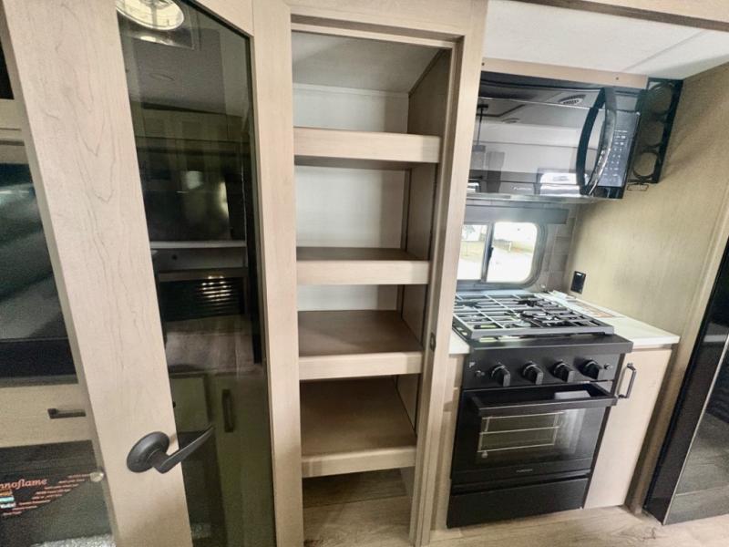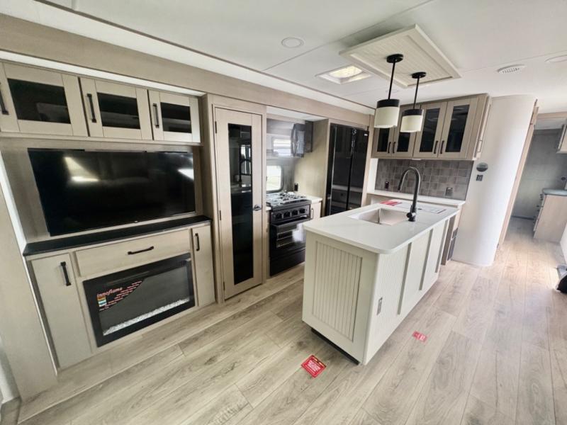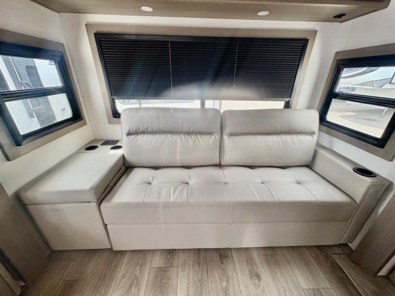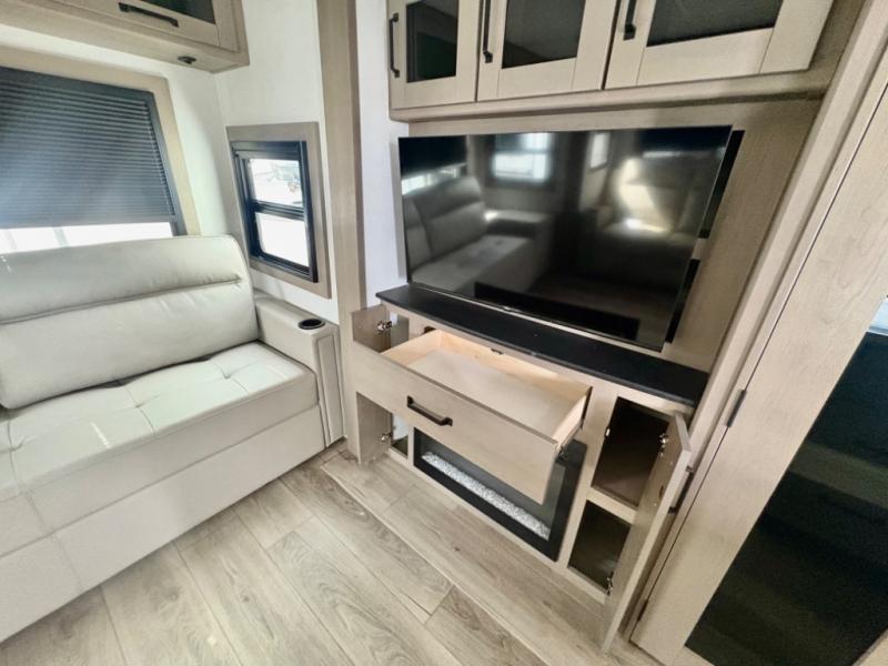 This rear living travel trailer will be perfect for extended stays at the campground or quick weekend trips to the lake! Once you've unloaded your gear from the pass-thru storage, head inside to relax on the rear tri-fold sofa with an adjustable headrest or on the theater seating across from the 40" TV and fireplace. There is also a booth dinette where you can dine together, or you can choose the optional swivel dinette. The spacious kitchen island will make meal time easier than ever, plus there is a pantry and 16 cu. ft. 12V refrigerator for food storage. The full bath is right next to the front private bedroom for easy nighttime use, and speaking of nighttime, you're sure to sleep soundly on the queen bed slide. There is also a large front closet, TV prep, plus washer and dryer prep if you choose to add these appliances.