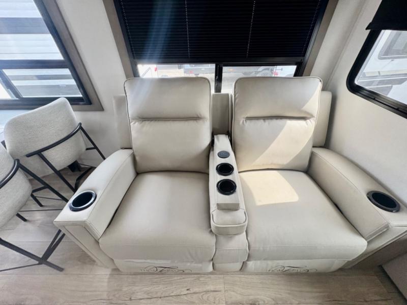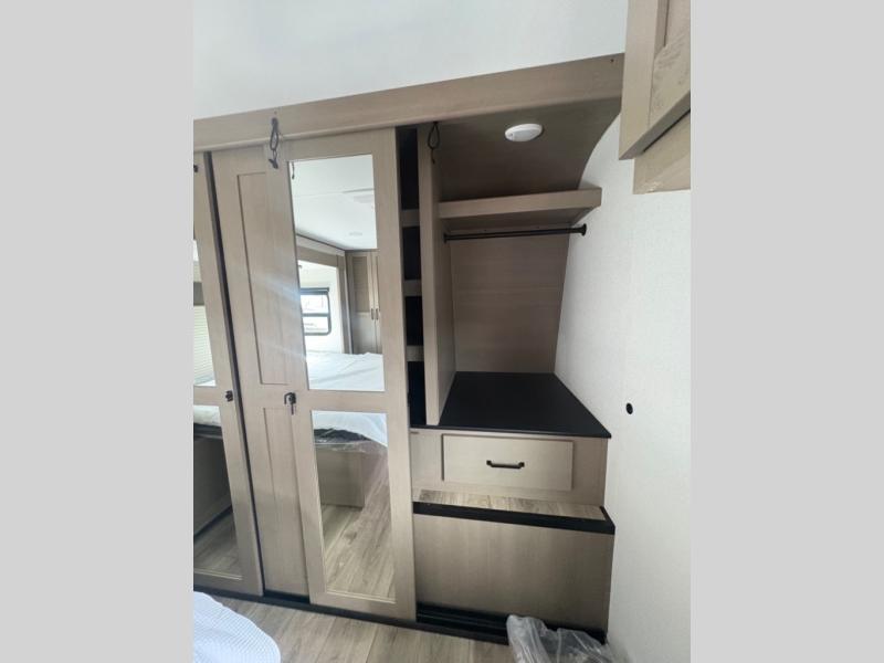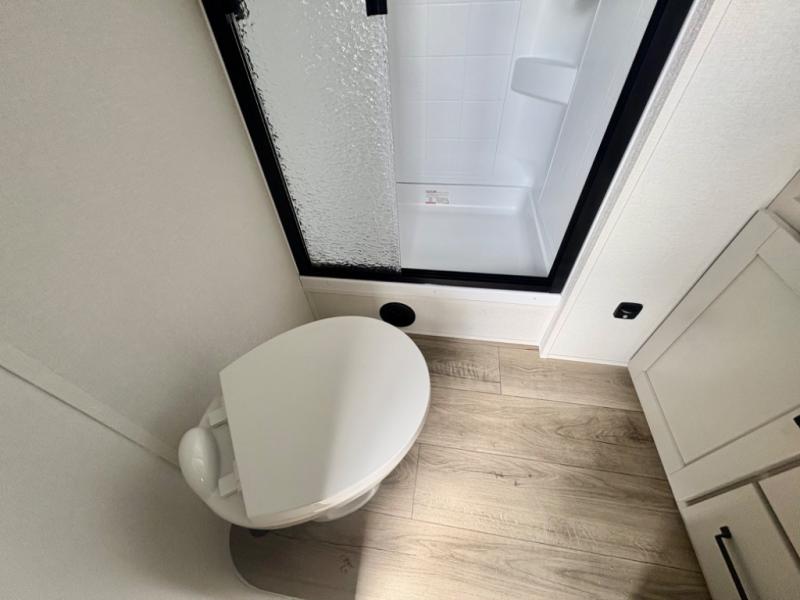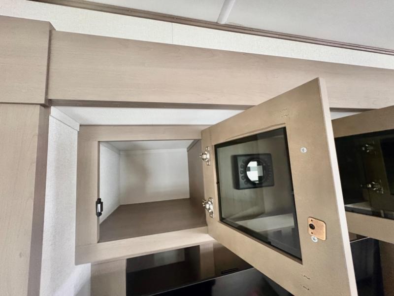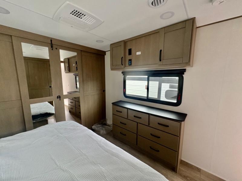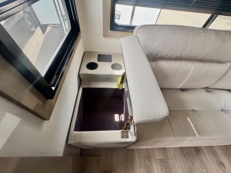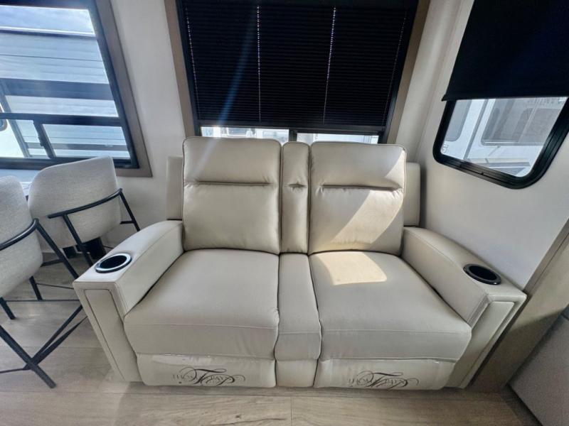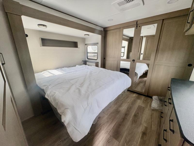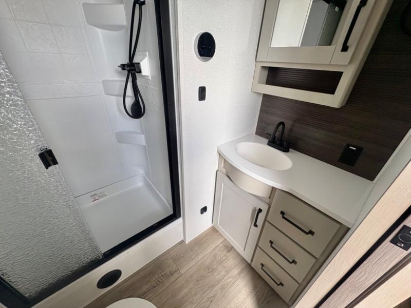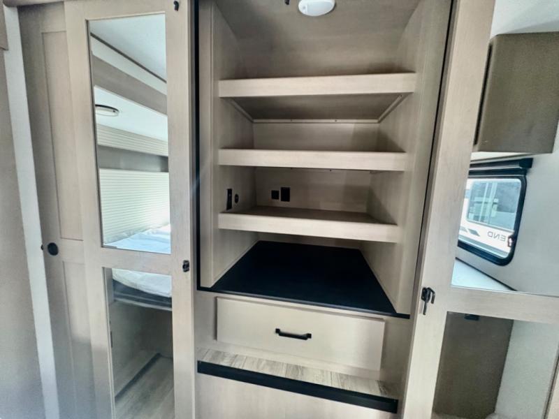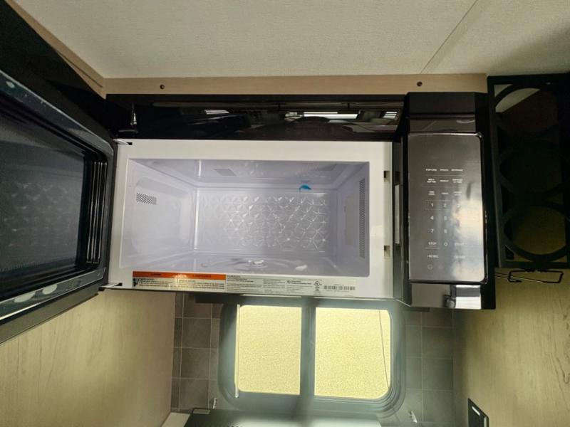 This rear living travel trailer will be perfect for extended stays at the campground or quick weekend trips to the lake! Once you've unloaded your gear from the pass-thru storage, head inside to relax on the rear tri-fold sofa with an adjustable headrest or on the theater seating across from the 40" TV and fireplace. There is also a booth dinette where you can dine together, or you can choose the optional swivel dinette. The spacious kitchen island will make meal time easier than ever, plus there is a pantry and 16 cu. ft. 12V refrigerator for food storage. The full bath is right next to the front private bedroom for easy nighttime use, and speaking of nighttime, you're sure to sleep soundly on the queen bed slide. There is also a large front closet, TV prep, plus washer and dryer prep if you choose to add these appliances.
